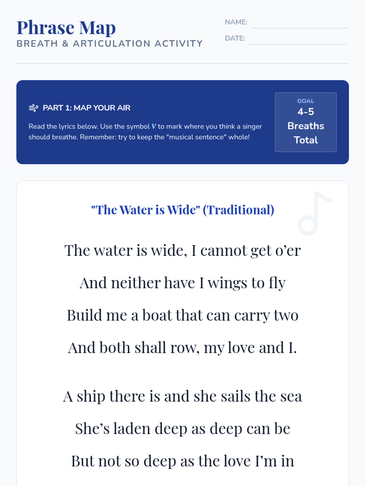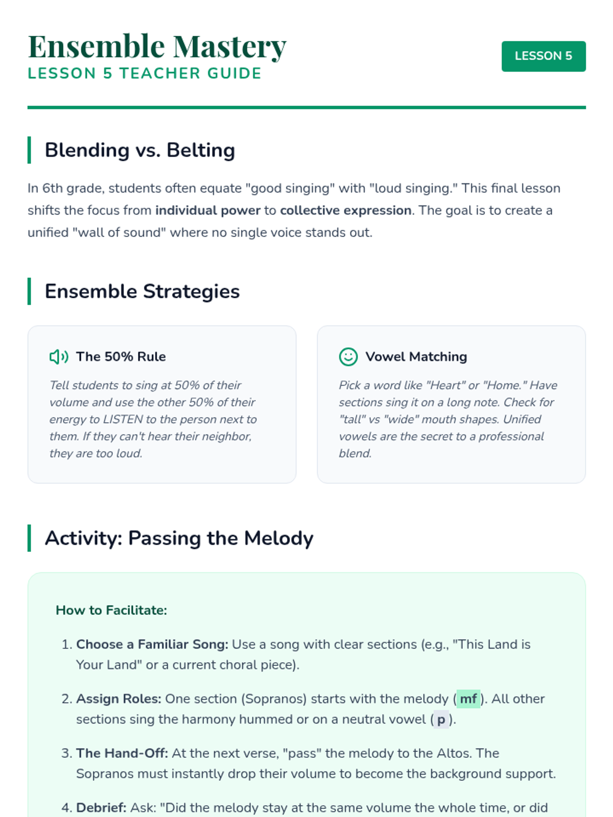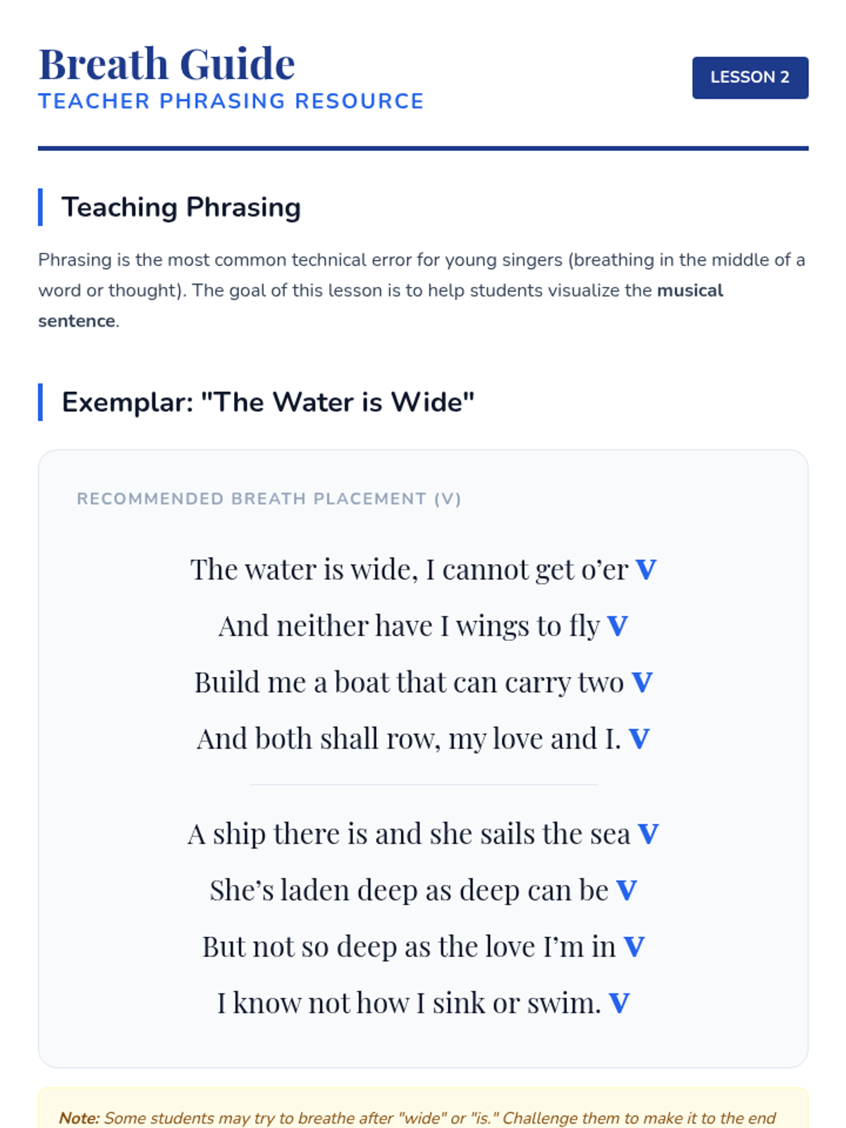 A 5-lesson unit for 6th-grade singers focusing on the intersection of technical performance and artistic storytelling. Students explore lyrics as poetry, master the mechanics of phrasing and breath management, manipulate dynamics and tempo for emotional impact, and analyze interpretive choices in cover songs.