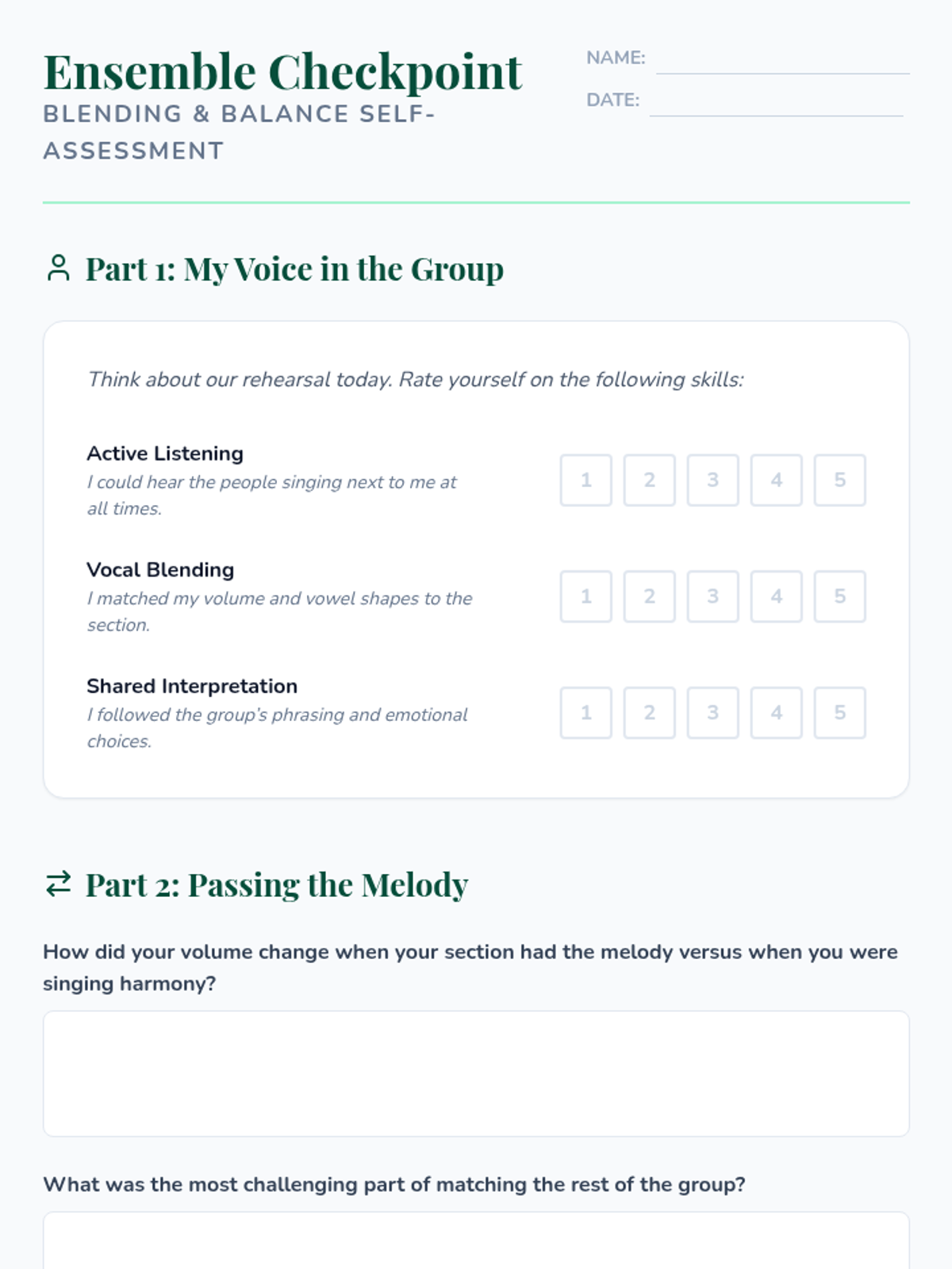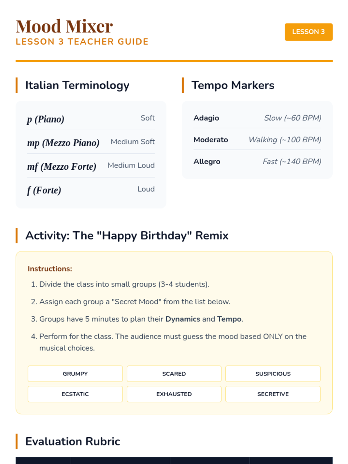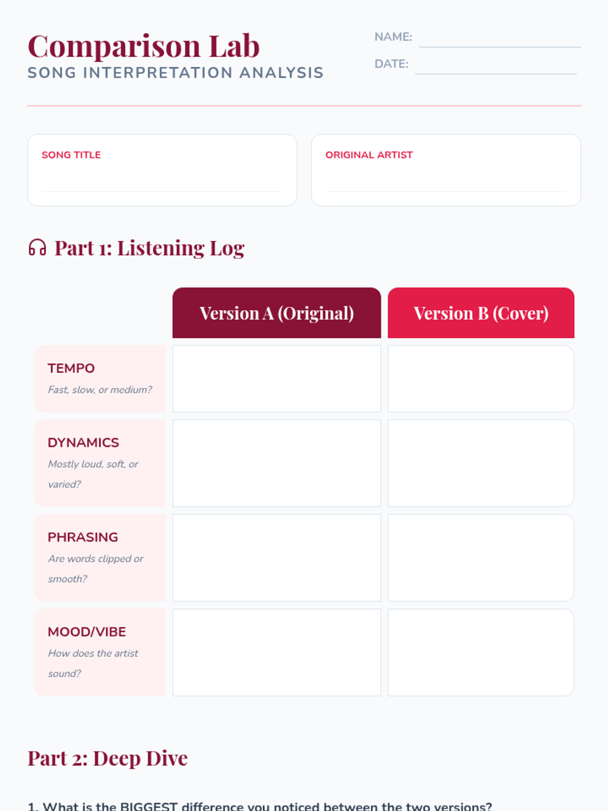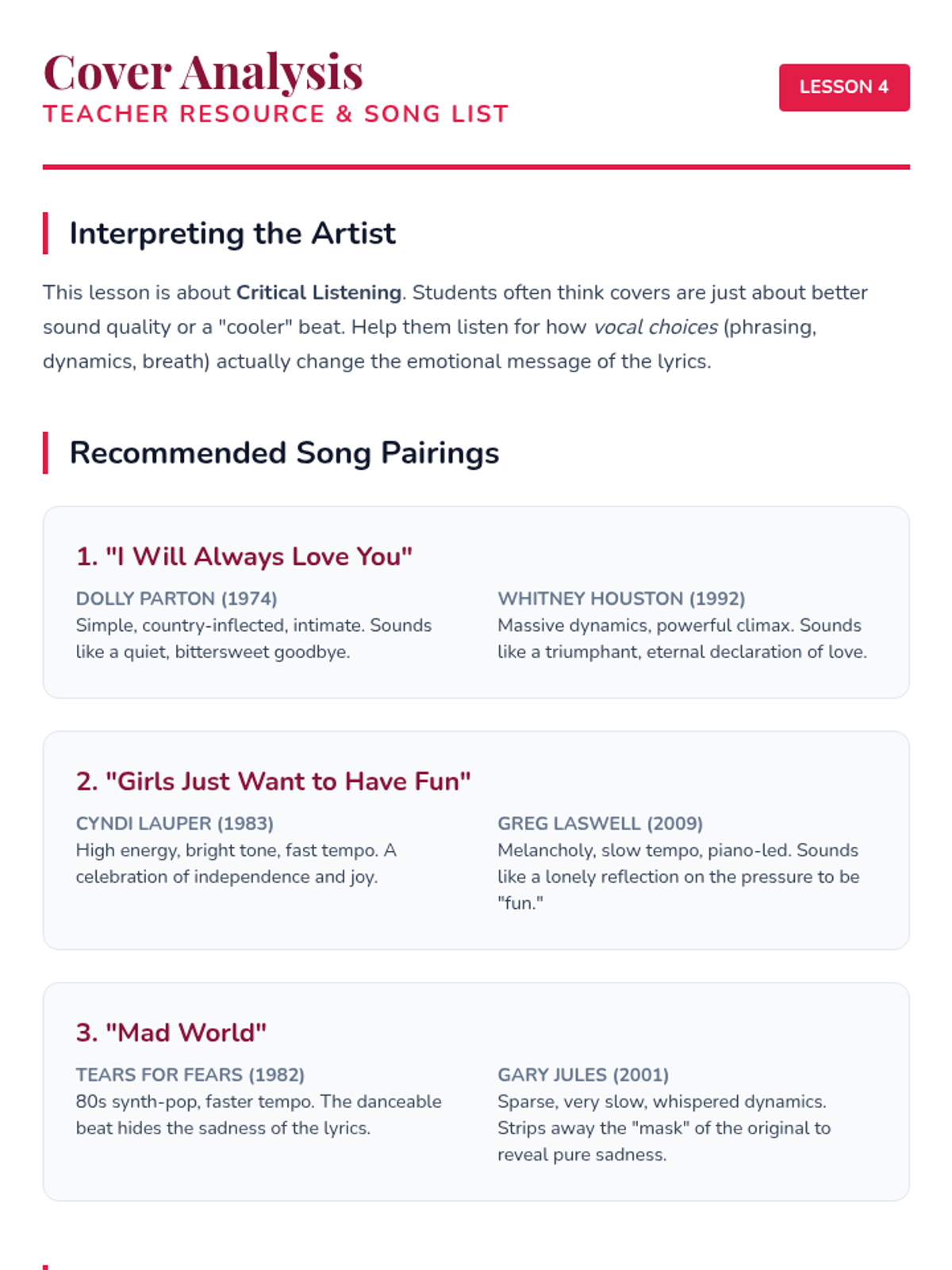 A 5-lesson unit for 6th-grade singers focusing on the intersection of technical performance and artistic storytelling. Students explore lyrics as poetry, master the mechanics of phrasing and breath management, manipulate dynamics and tempo for emotional impact, and analyze interpretive choices in cover songs.