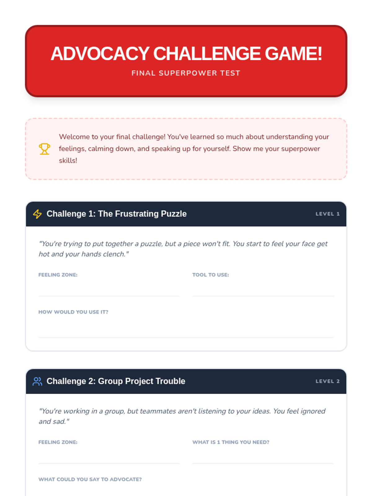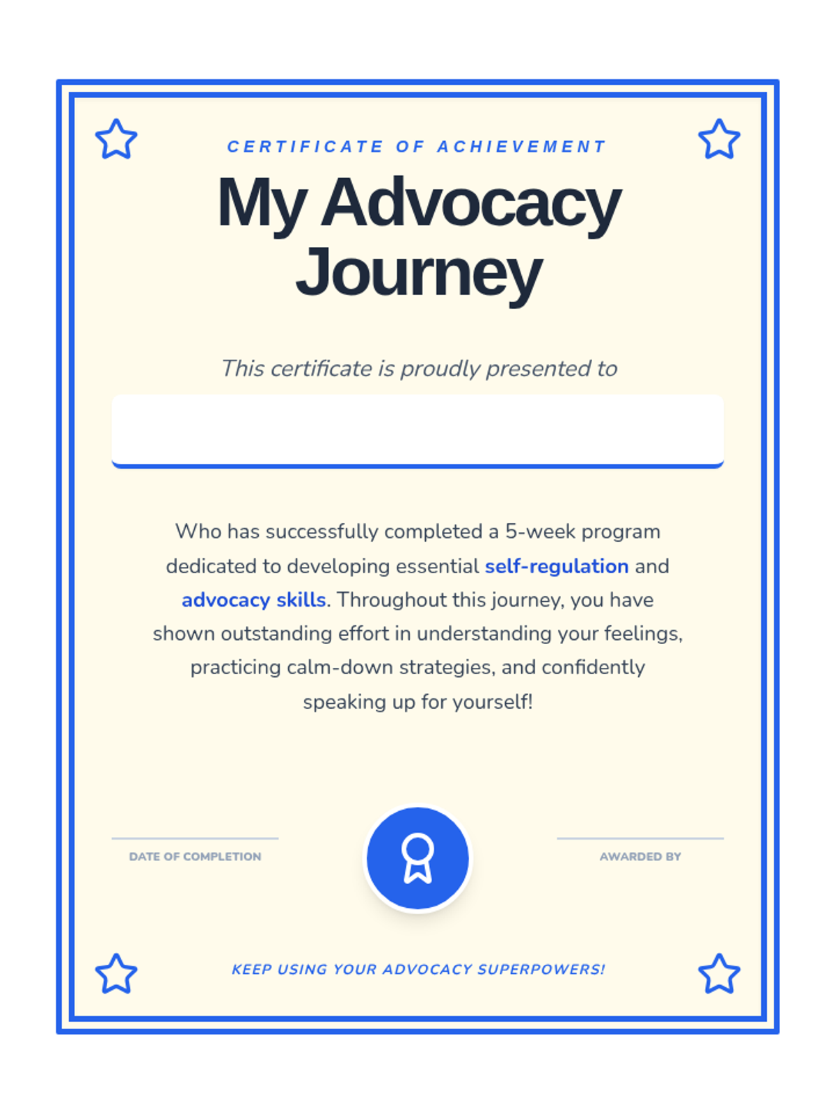 A five-week personalized program for an individual third-grade student to develop self-regulation and advocacy skills through 25-minute interactive sessions.