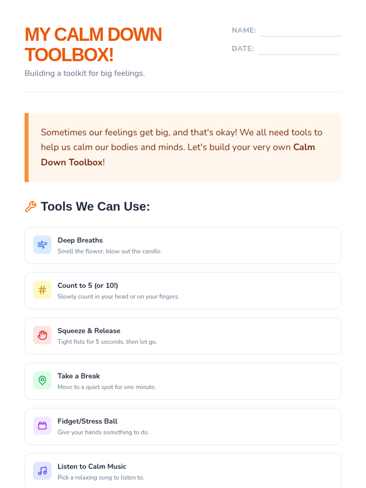 A 6-session counseling group designed to help students identify triggers, understand physical symptoms of anxiety, and build a personalized toolkit of coping strategies through a 'Calm Explorer' theme.