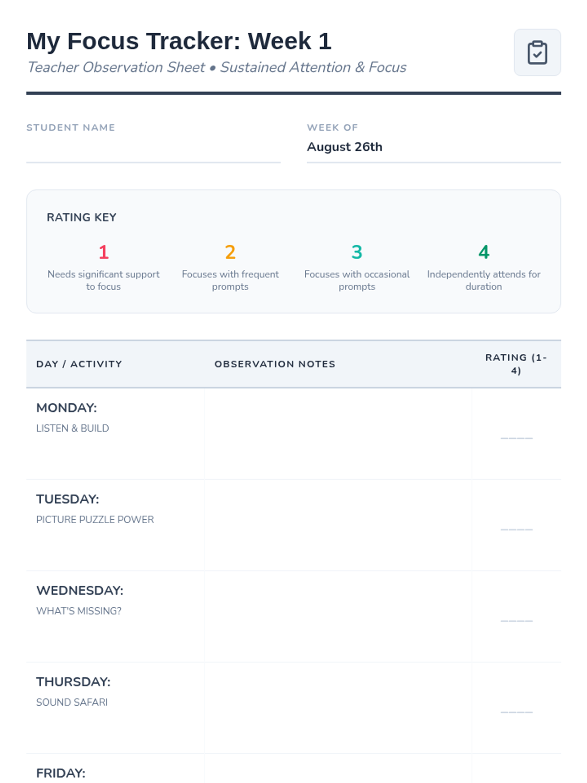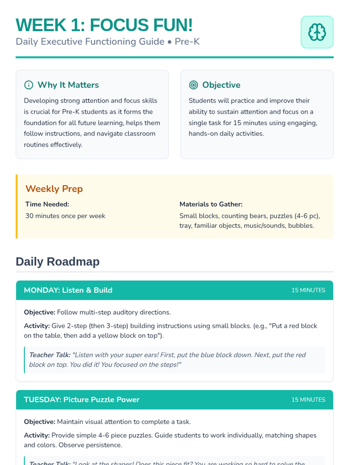 A comprehensive, year-long Executive Functioning unit for Pre-K students, featuring 15-minute daily hands-on activities, teacher guides, family communication, and progress monitoring tools from August to June.