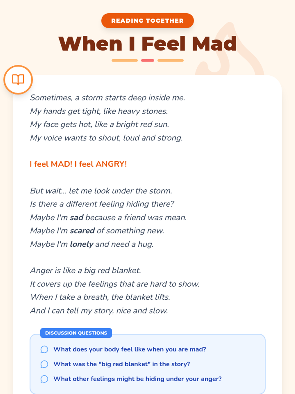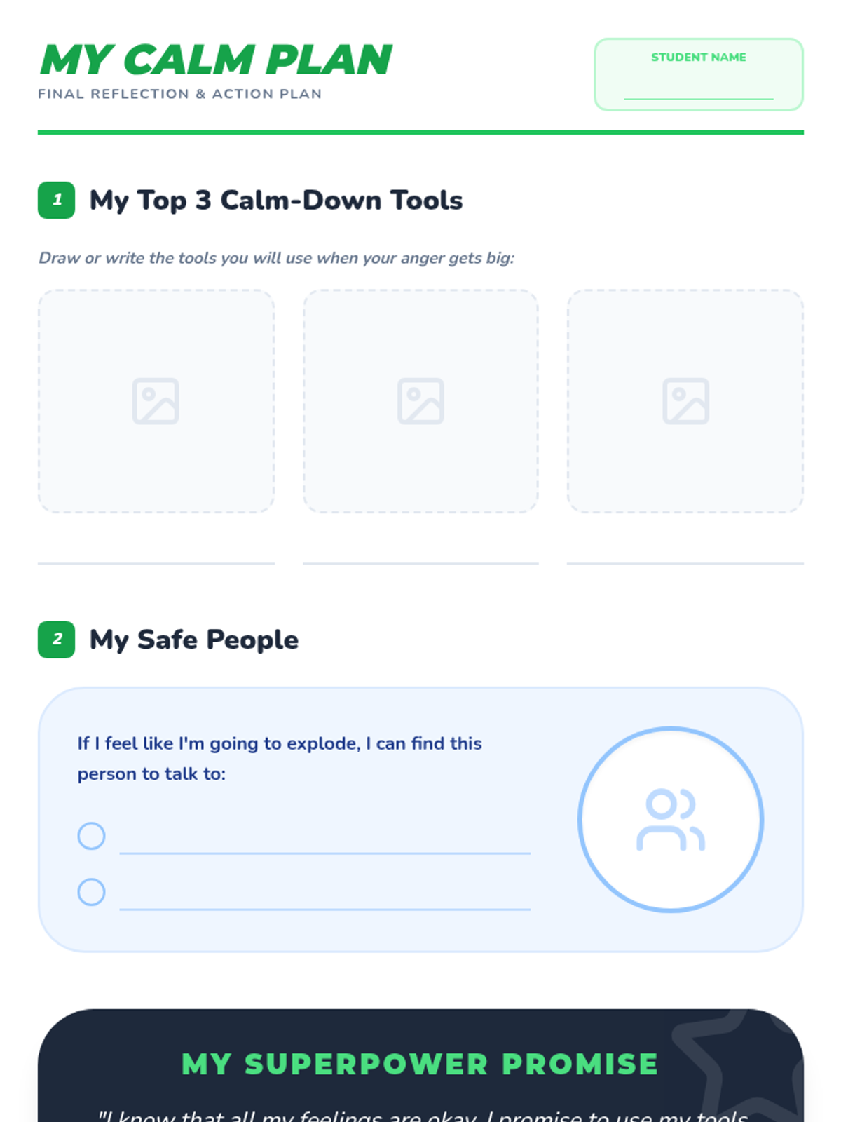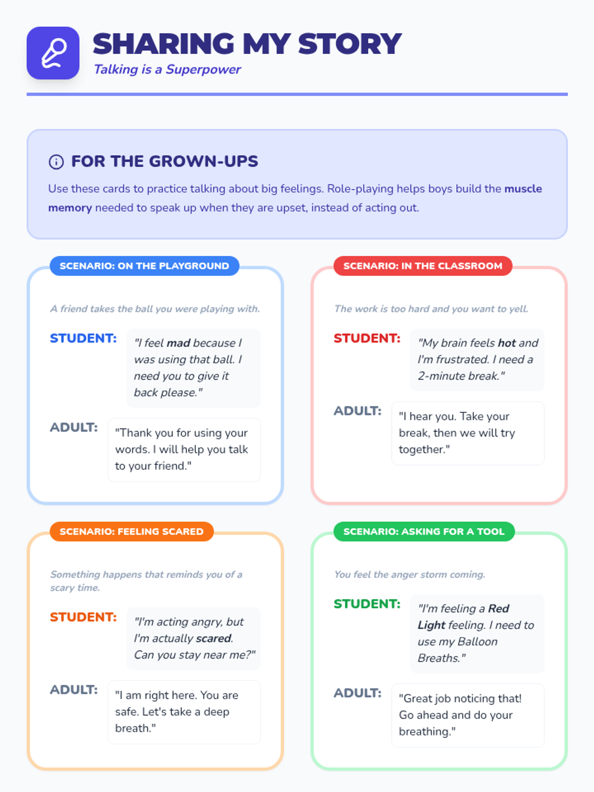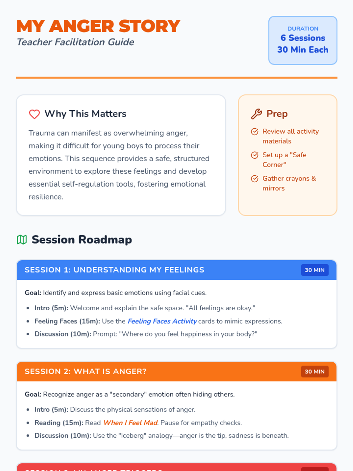 A 6-session therapeutic sequence for 1st-grade boys to explore anger, identify triggers, and build emotional regulation skills through a trauma-informed lens.