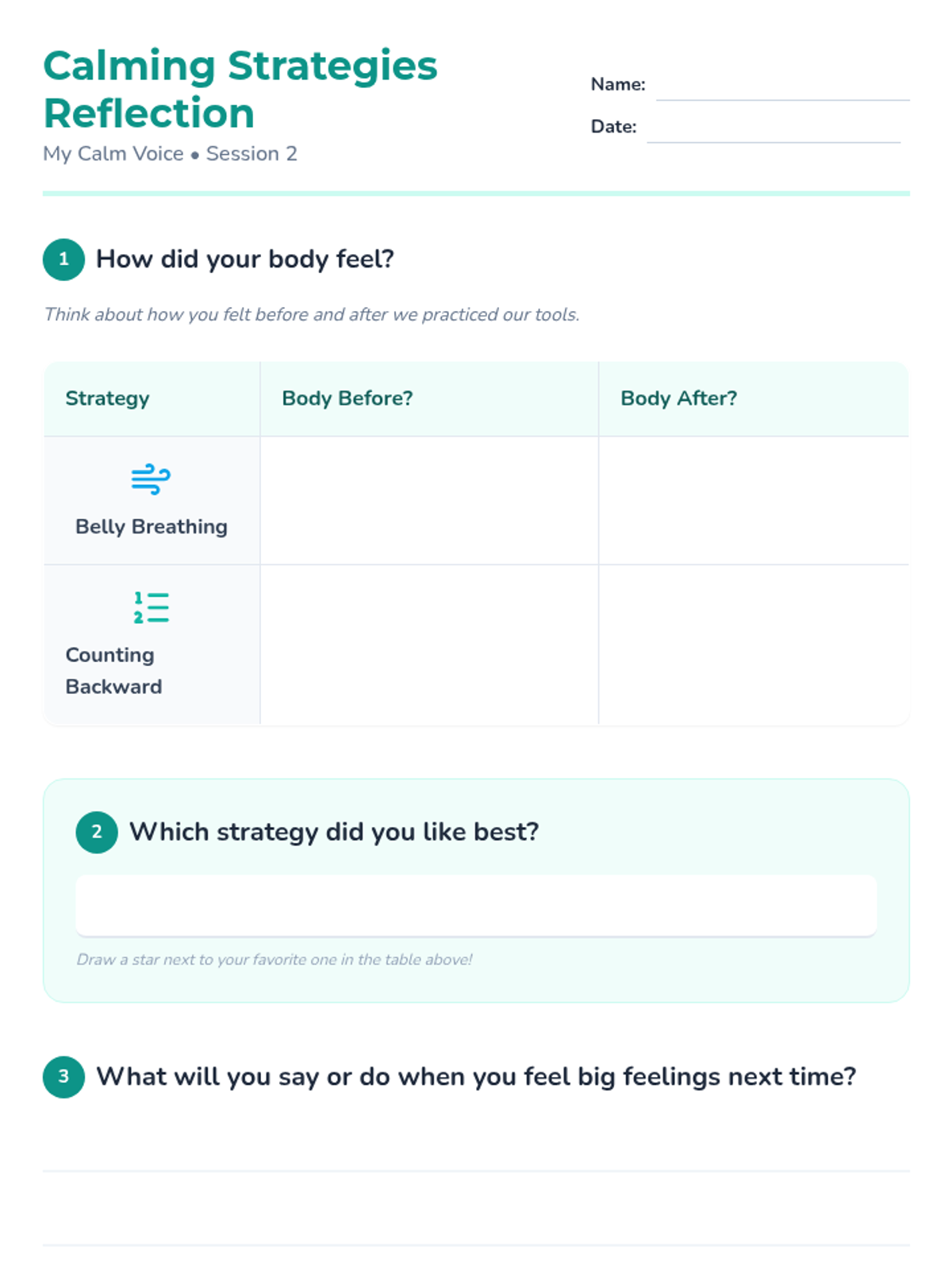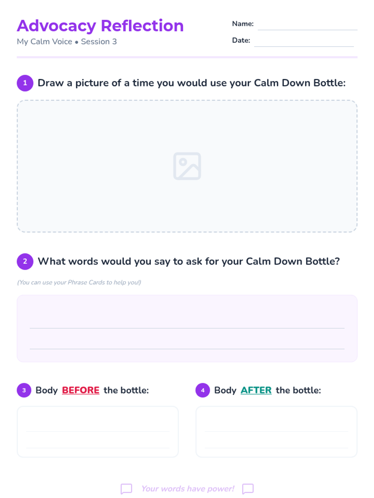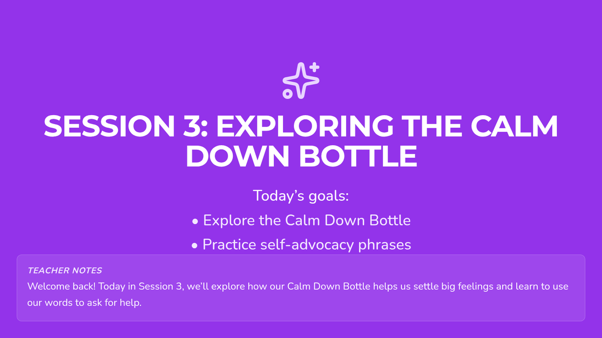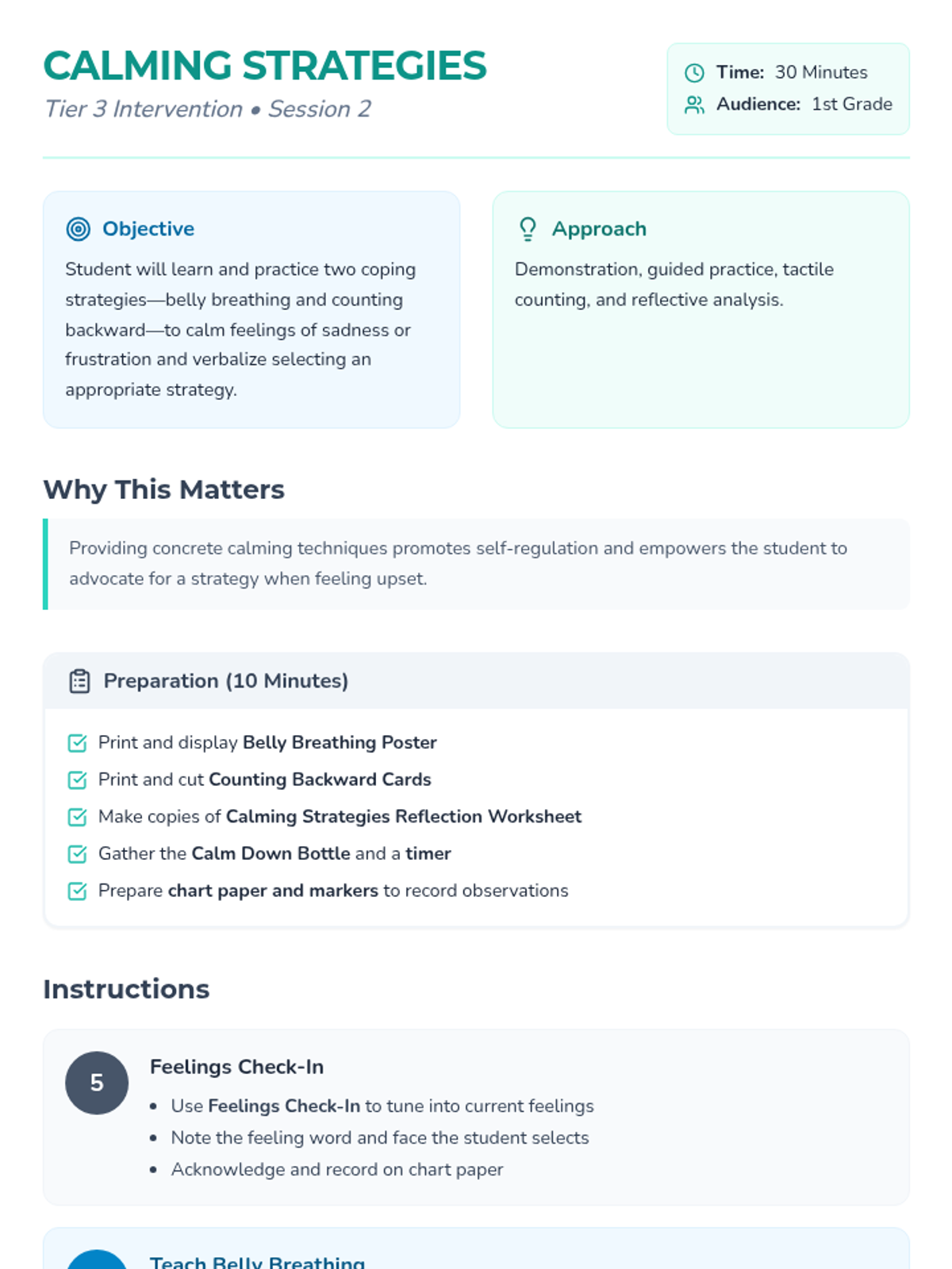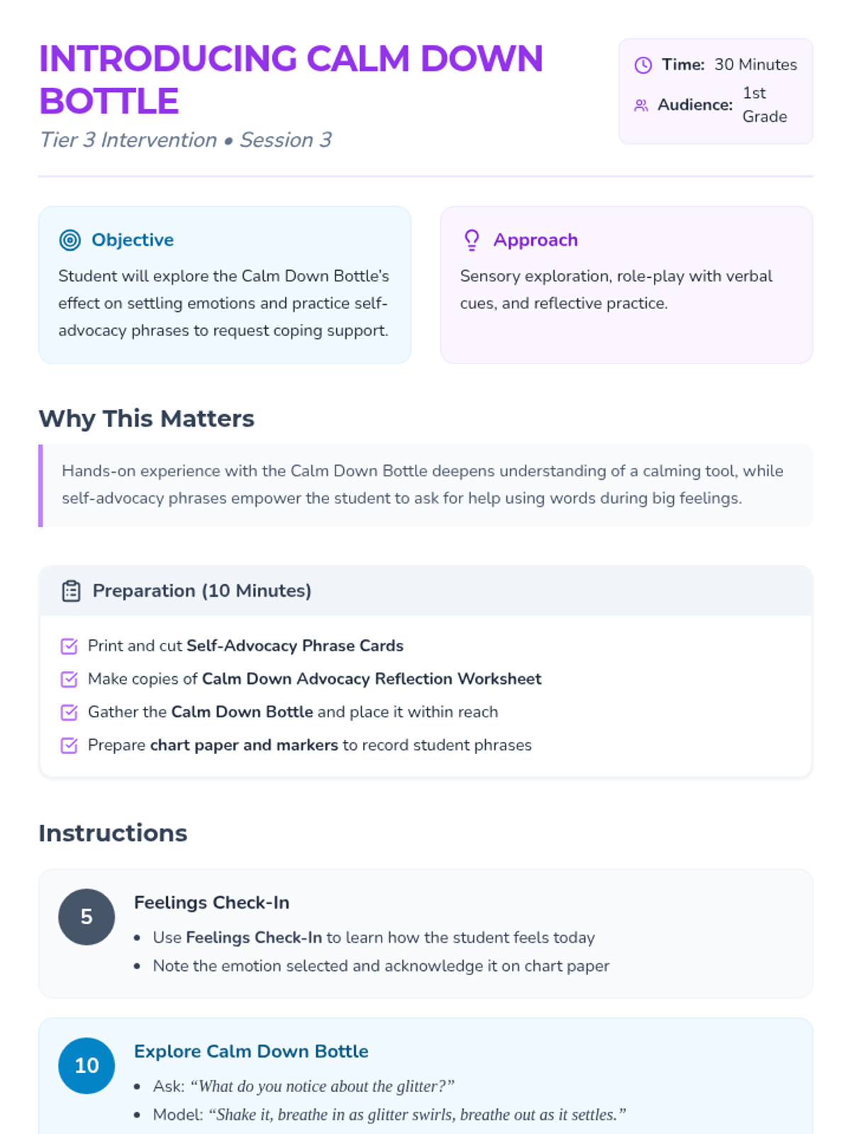 A 4-week Tier 3 intervention program for first-grade students focused on emotional identification, self-regulation, and self-advocacy through calming strategies and verbal expression.