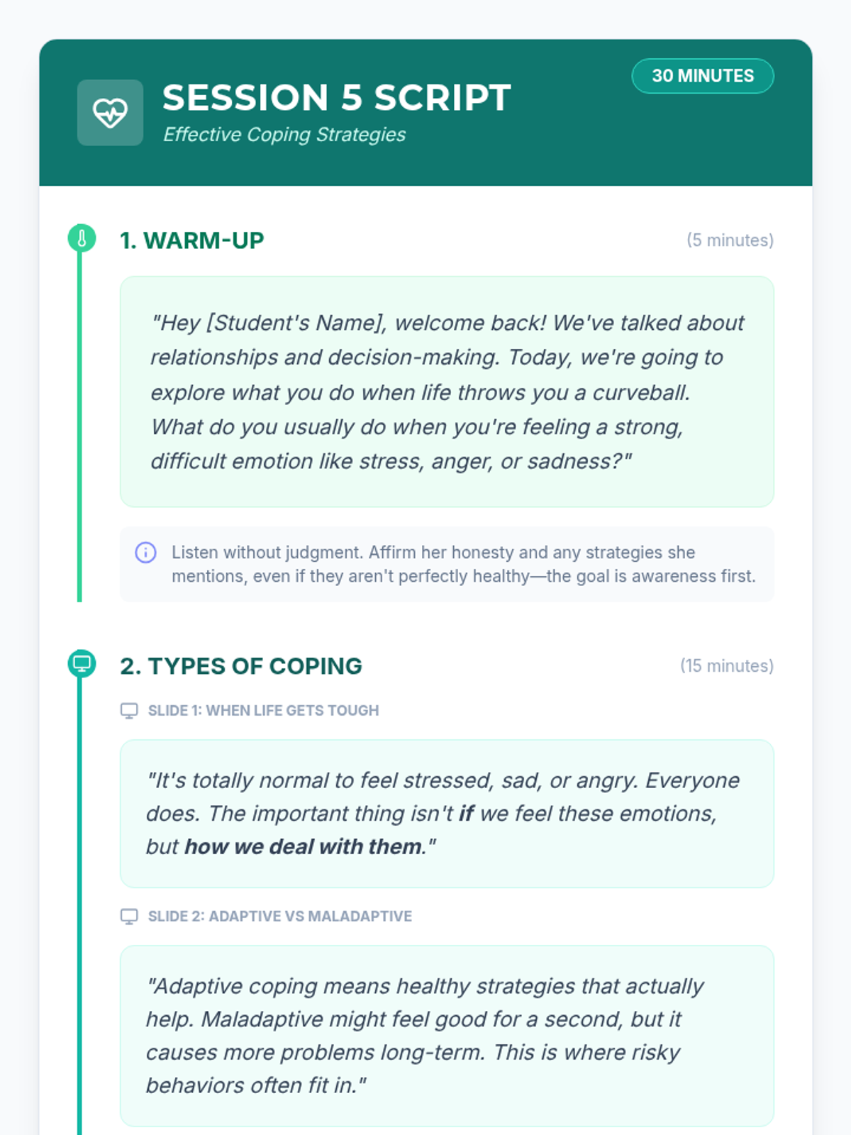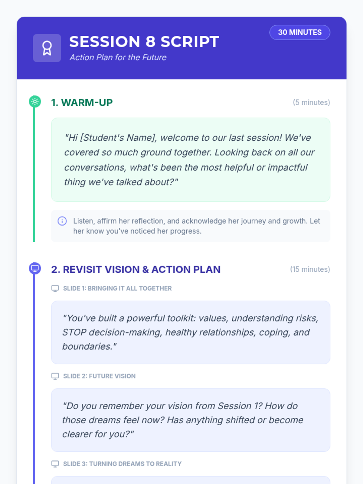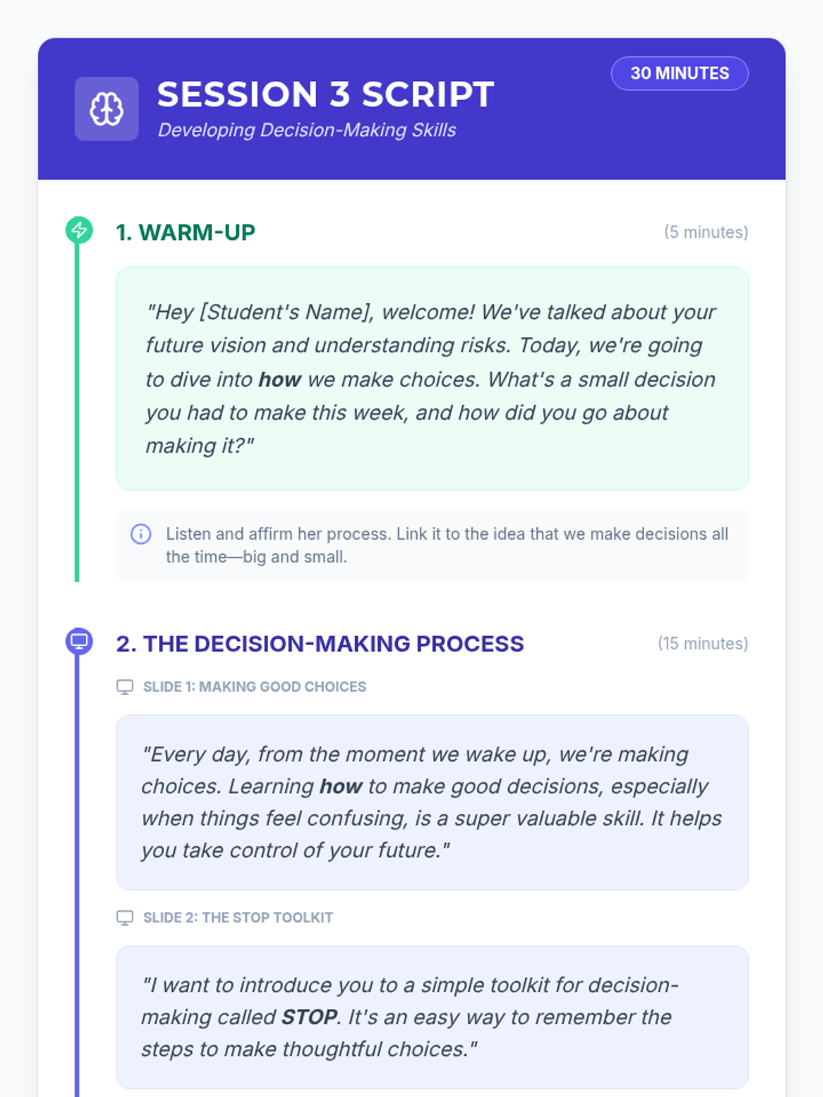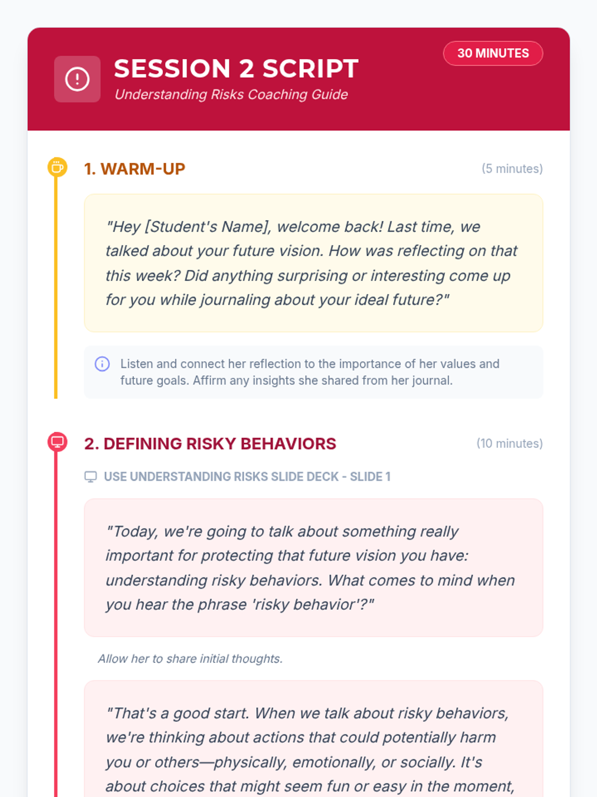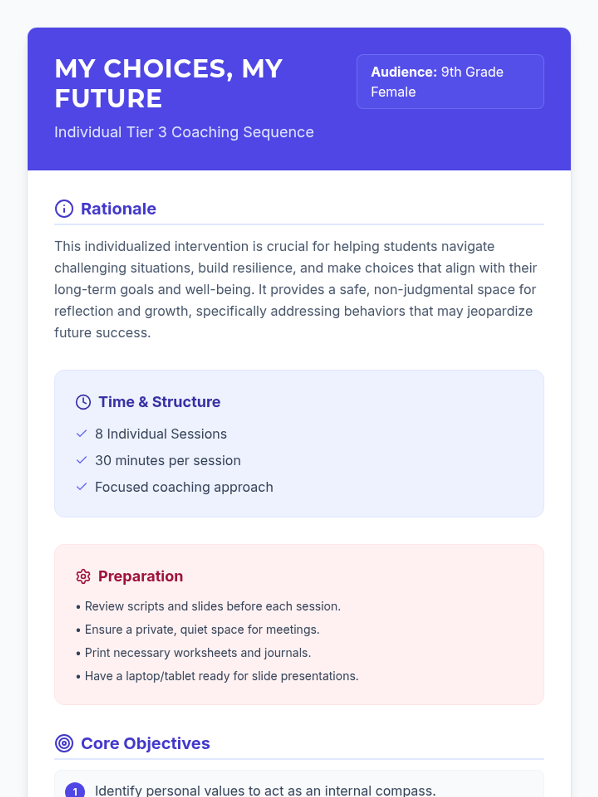 An 8-session individualized coaching sequence for 9th-grade girls designed to reduce risky behaviors by building values, decision-making skills, and a positive future vision.