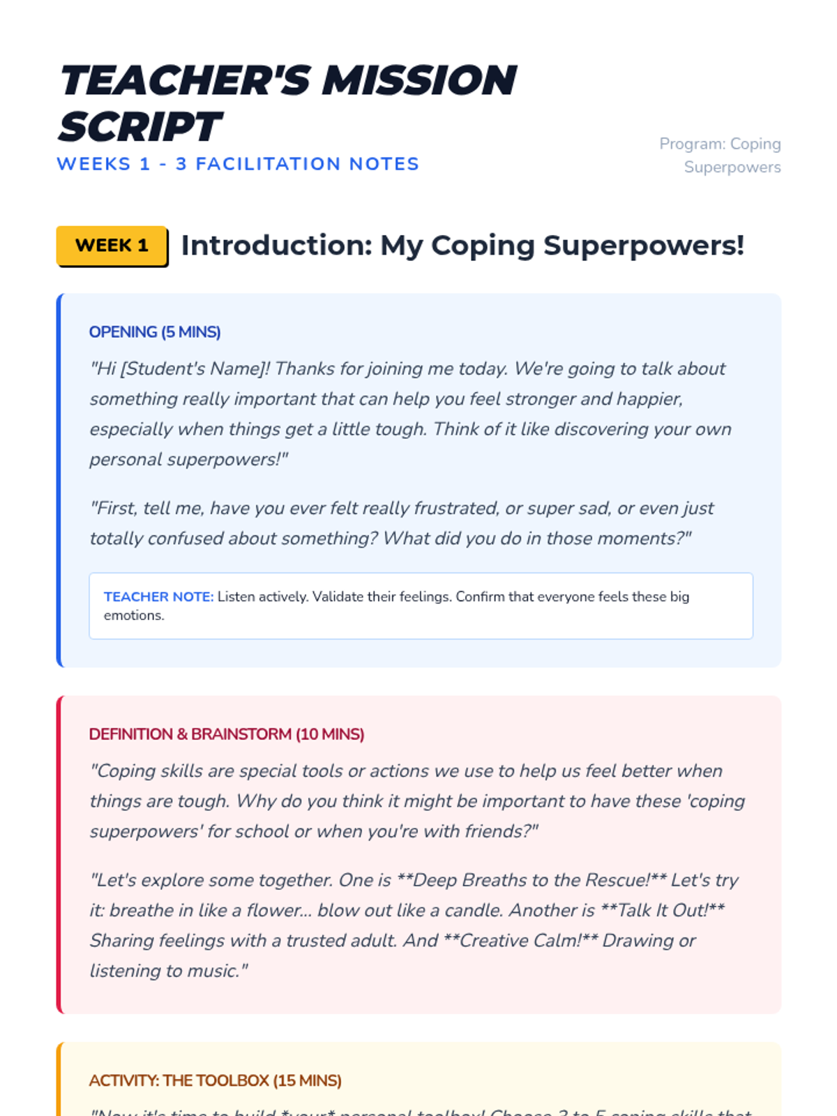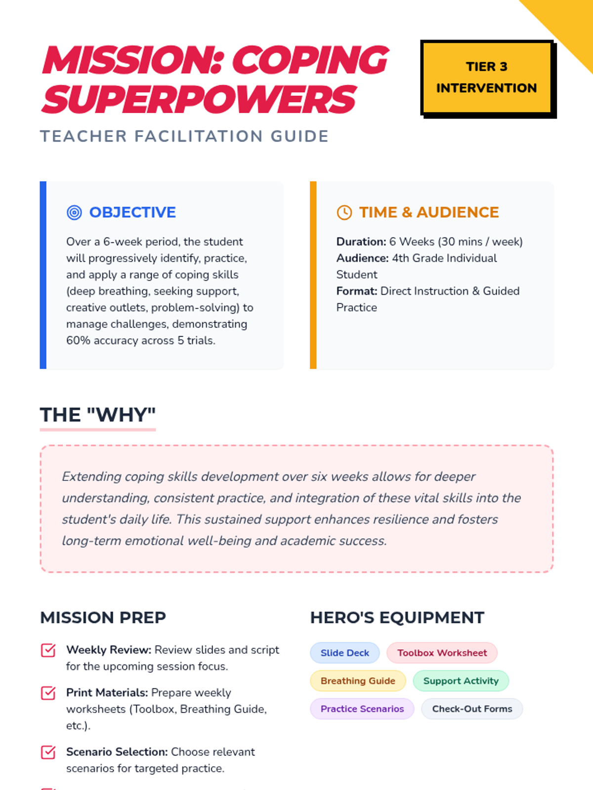 A 6-week Tier 3 intervention for 4th-grade students to develop, practice, and master a comprehensive set of coping skills for social and academic success.