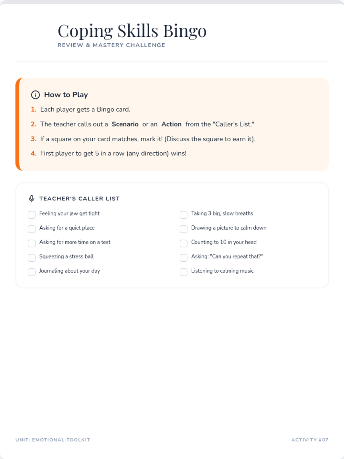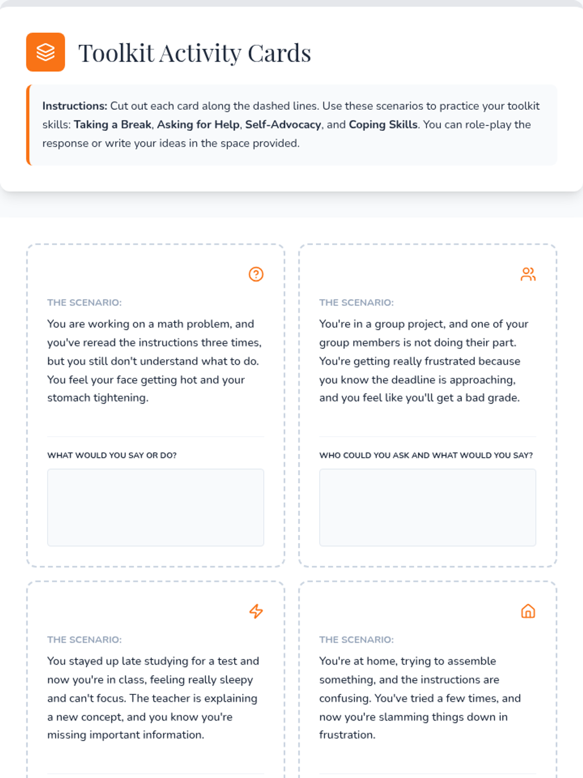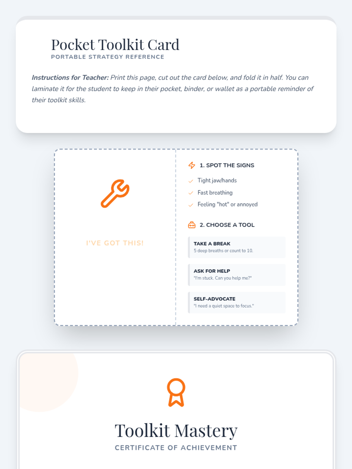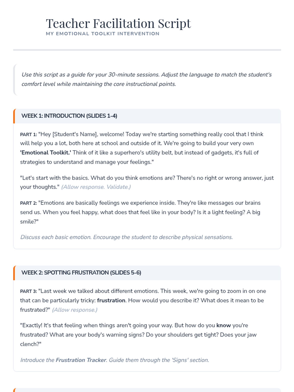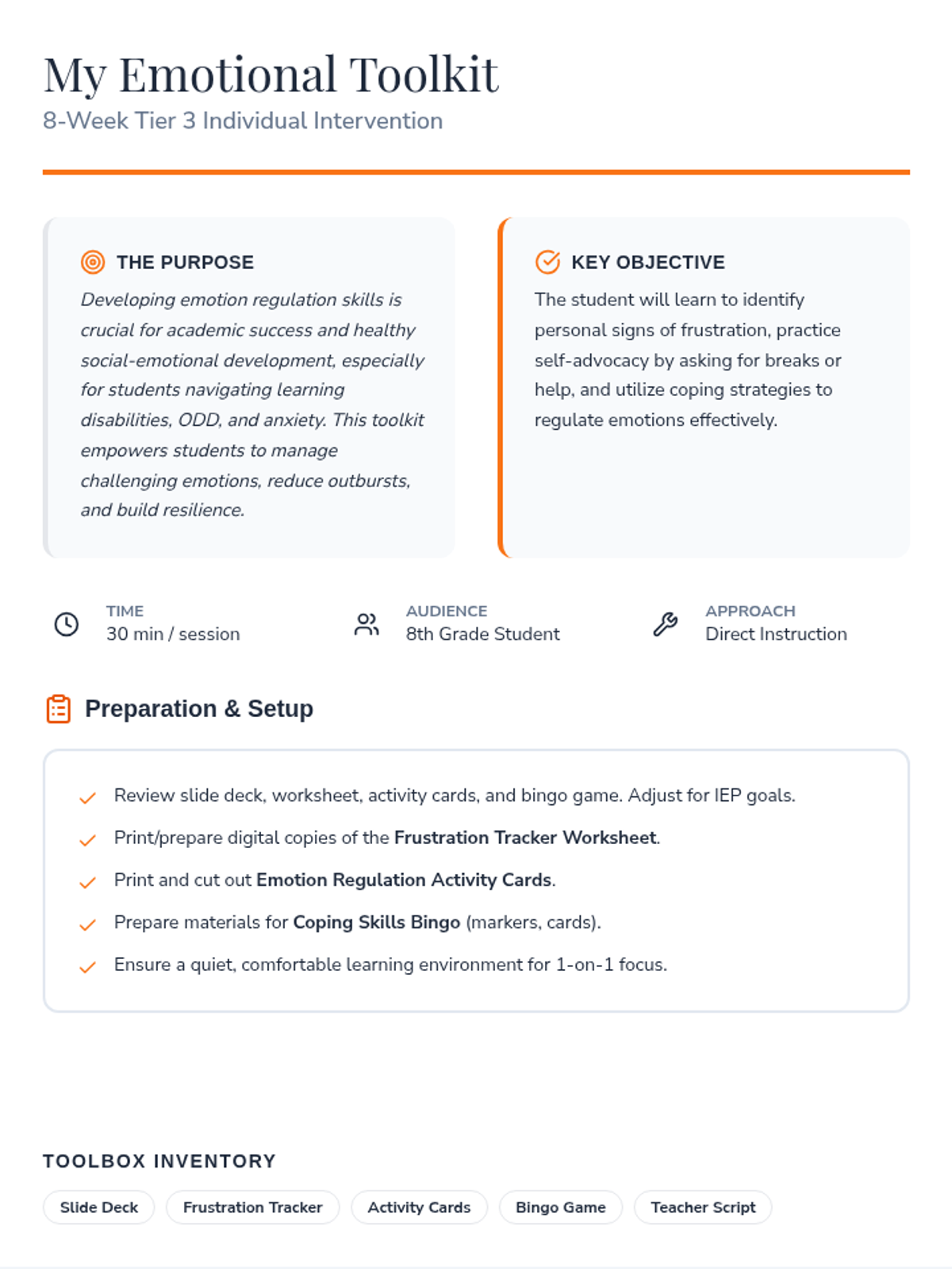 An 8-week individual Tier 3 intervention for 8th-grade students focusing on emotion regulation, frustration management, and self-advocacy. This sequence uses a 'Toolkit' theme to empower students with specific learning disabilities, ODD, and anxiety.