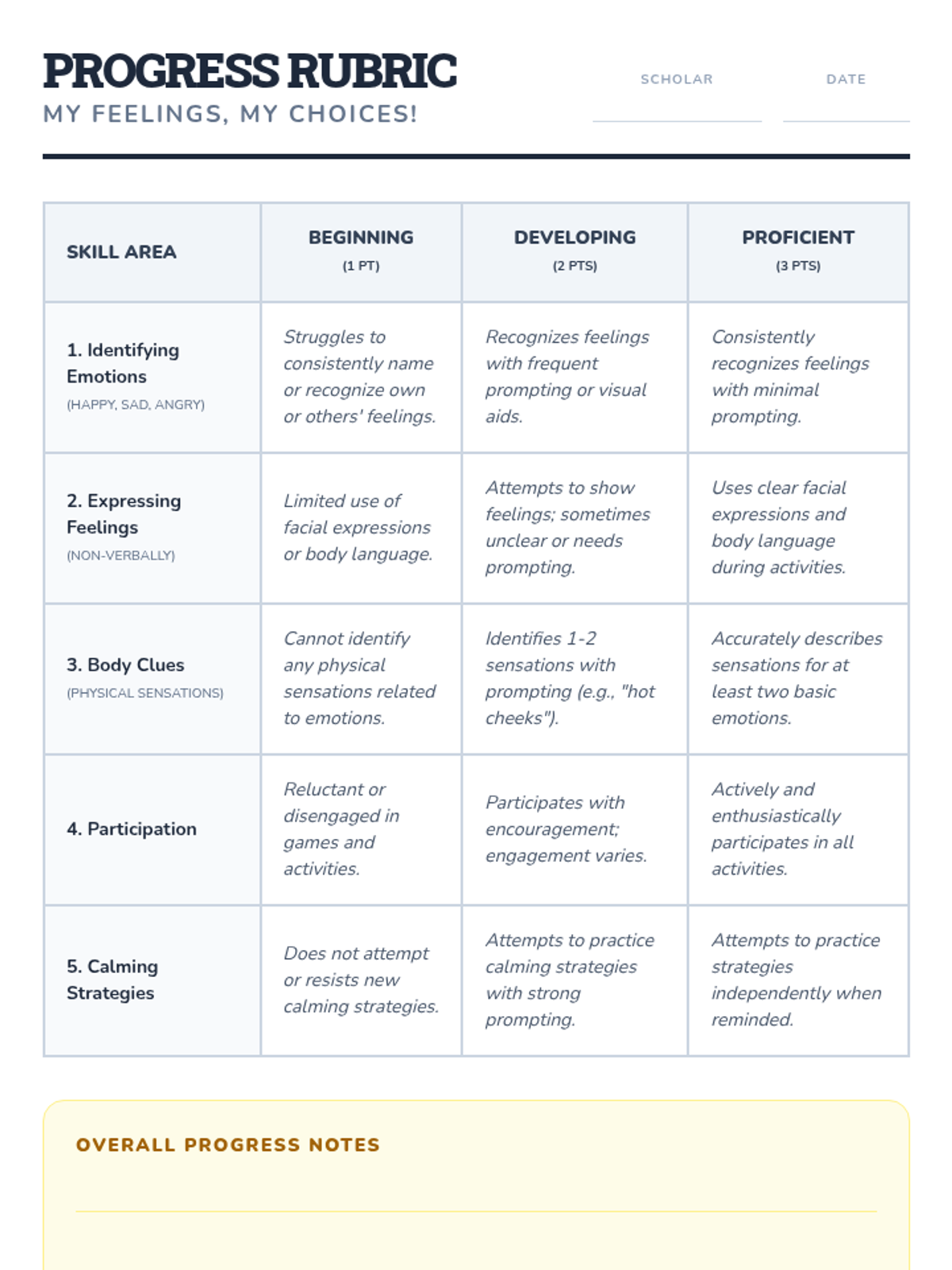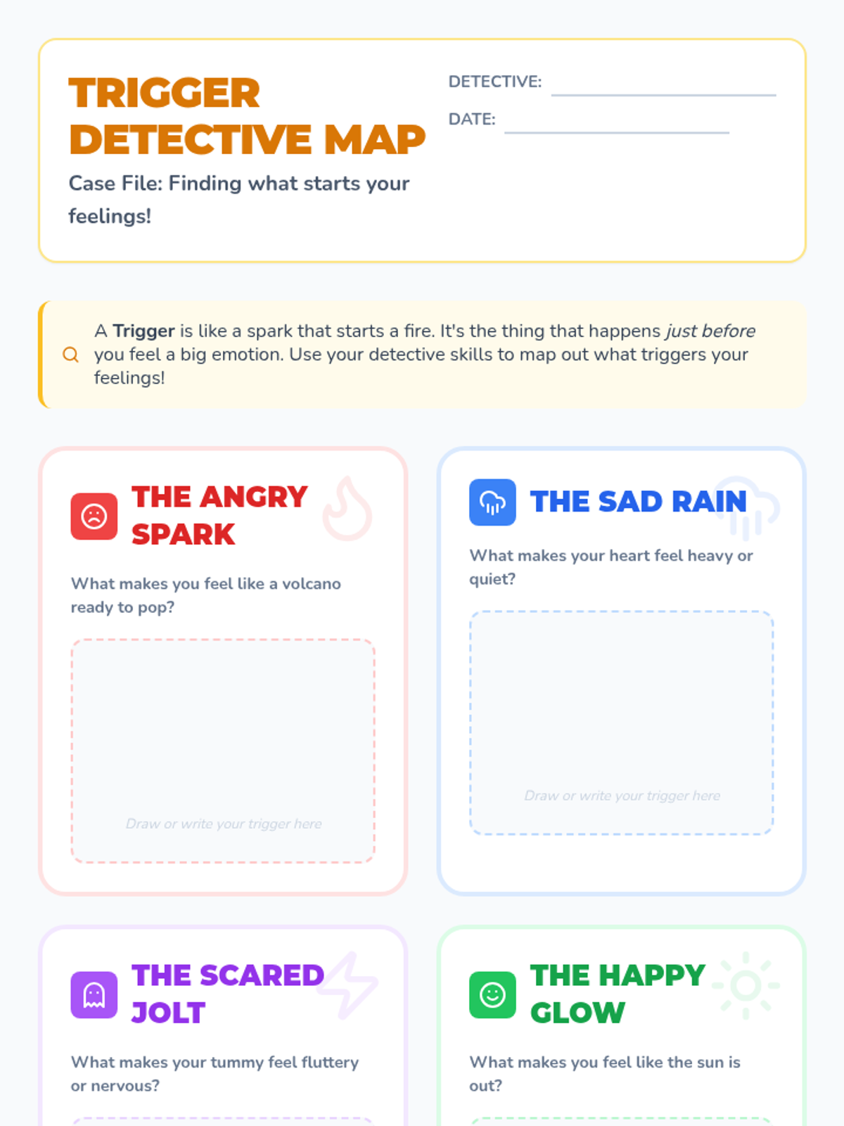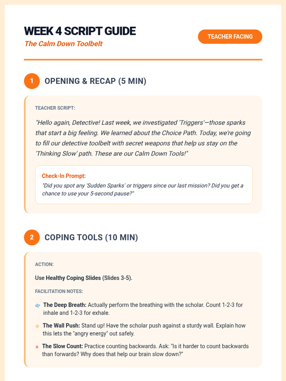 An 8-week Tier 3 intervention for a 2nd-grade scholar with ADHD, focusing on emotional literacy, self-regulation, conflict resolution, and impulse control through a 'Feeling Detective' theme.