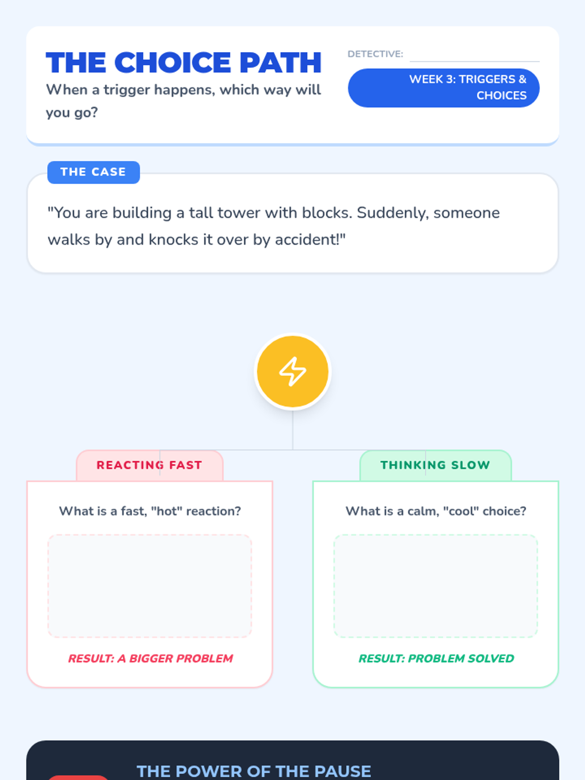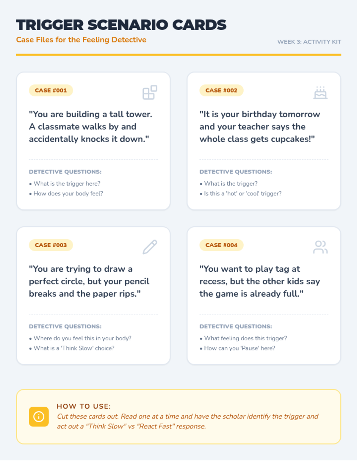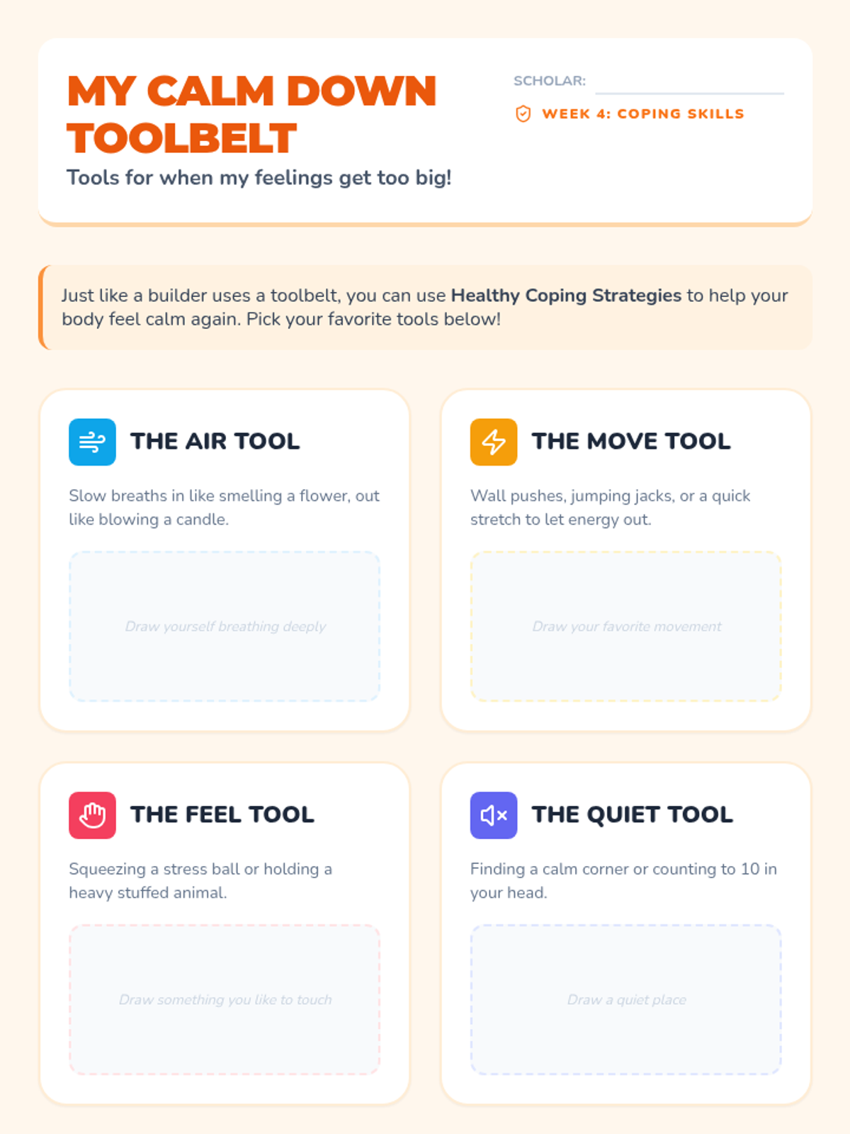 An 8-week Tier 3 intervention for a 2nd-grade scholar with ADHD, focusing on emotional literacy, self-regulation, conflict resolution, and impulse control through a 'Feeling Detective' theme.