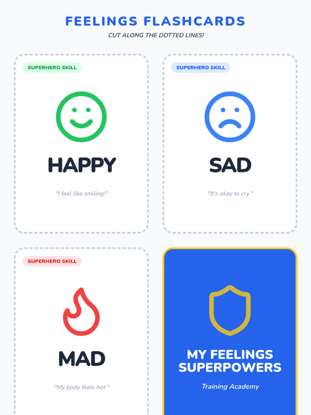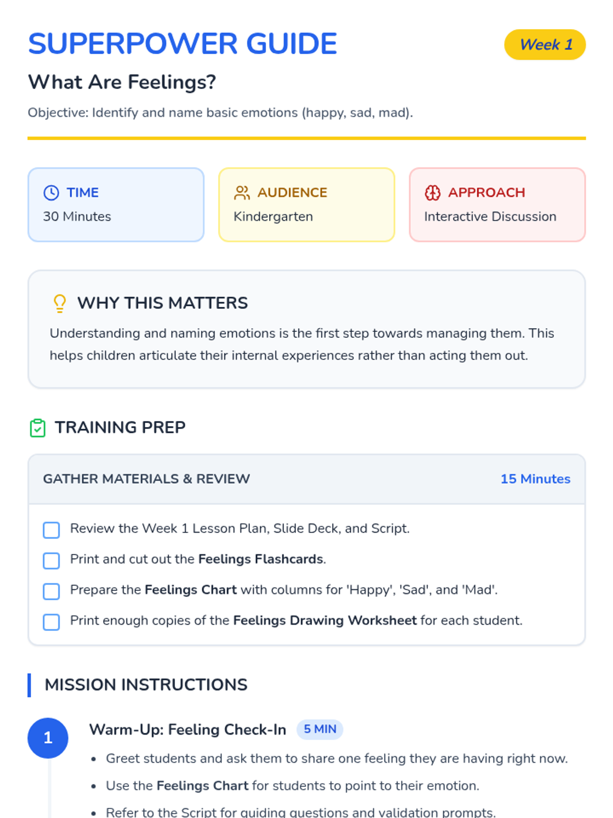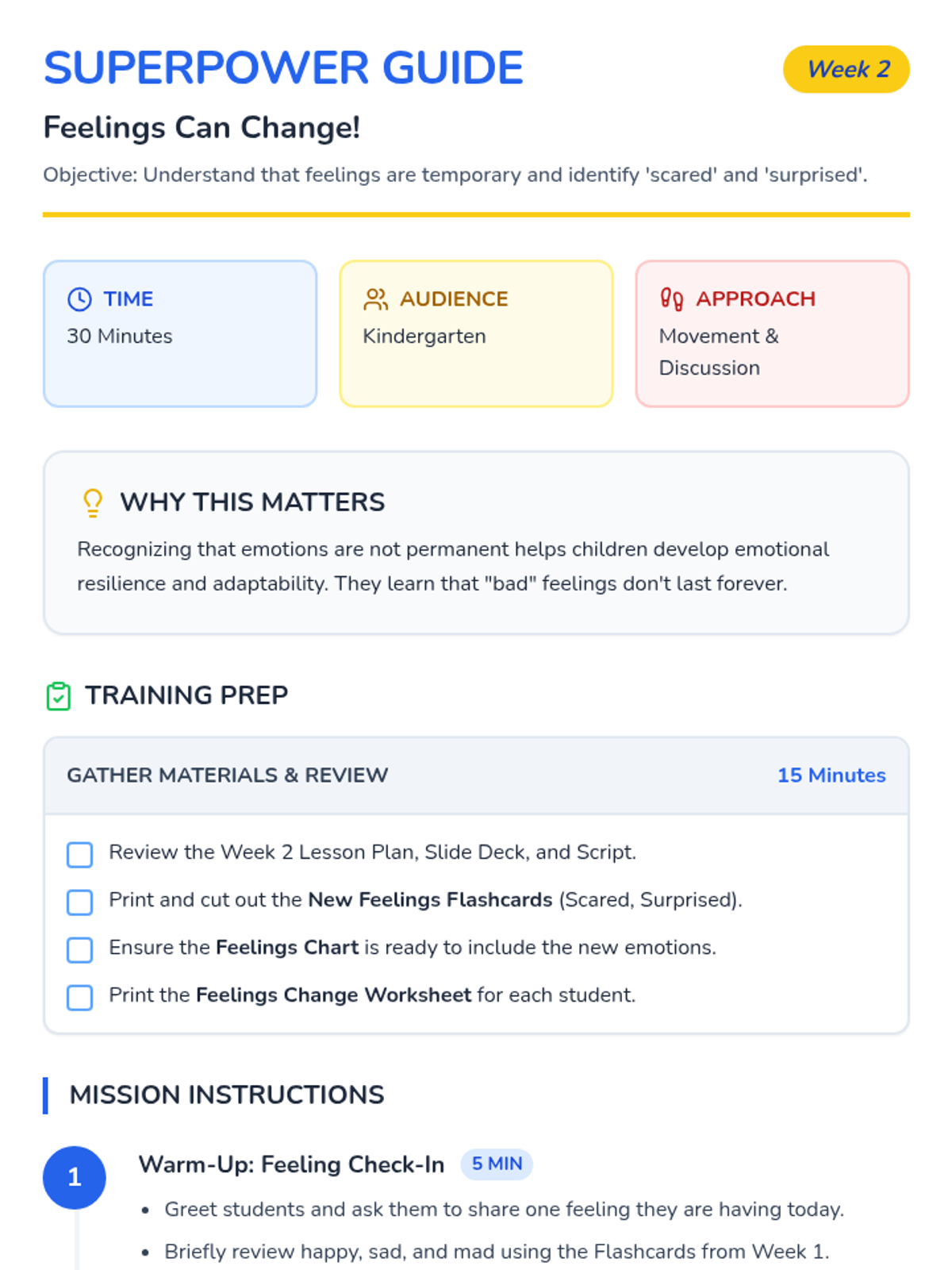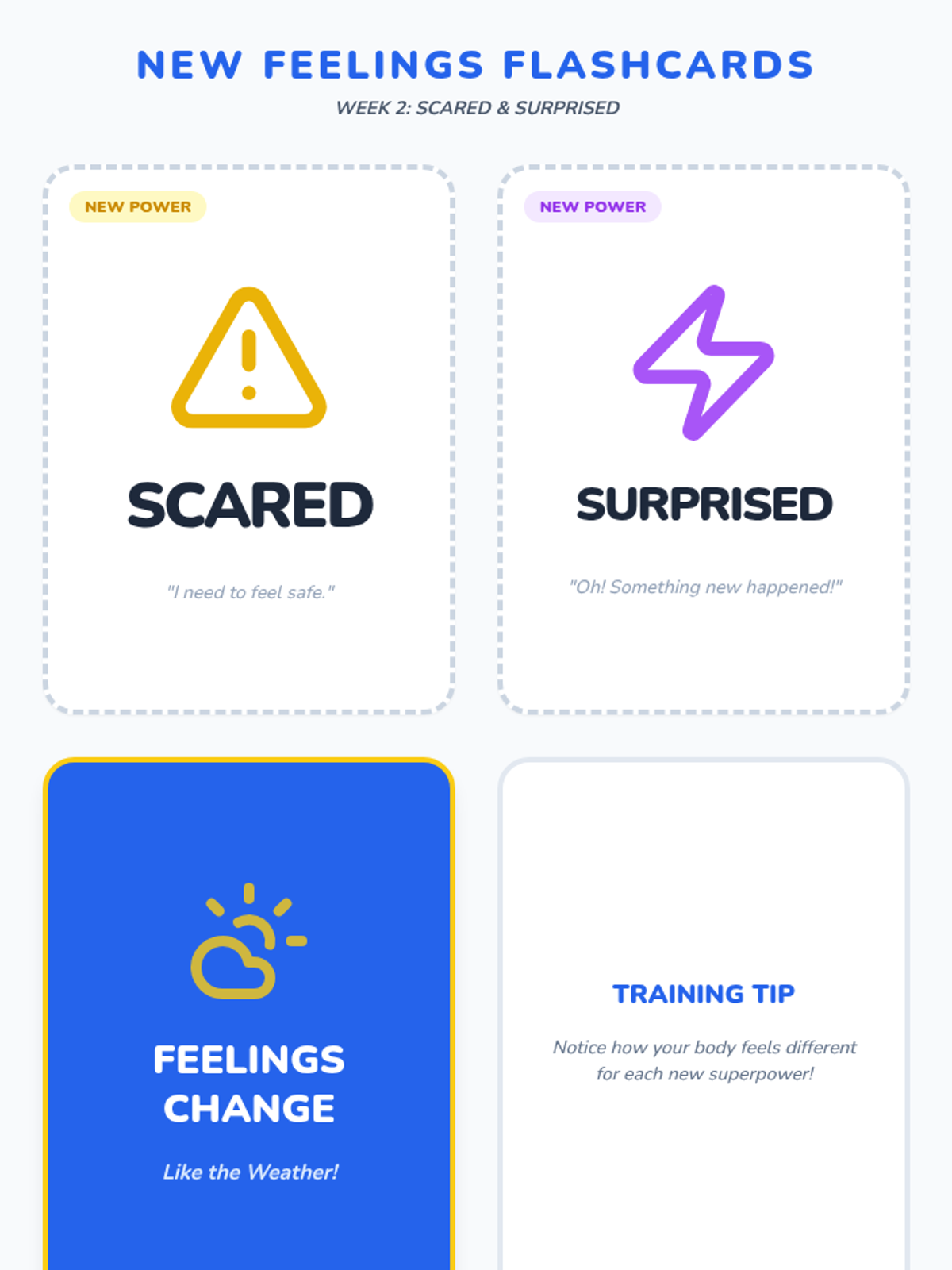 An 8-week Tier 2 group program for Kindergarten students focused on emotional literacy, coping skills, and help-seeking. Students learn to identify feelings, understand that emotions change, build empathy, and practice self-regulation using a "Superpower" theme.