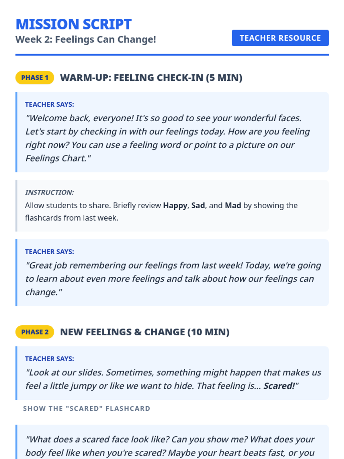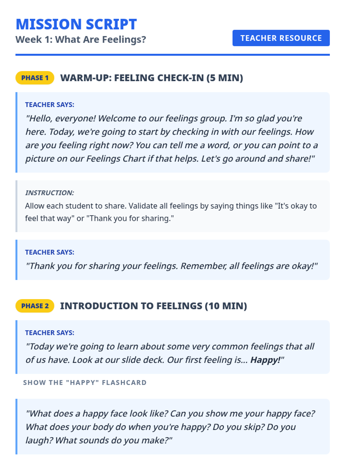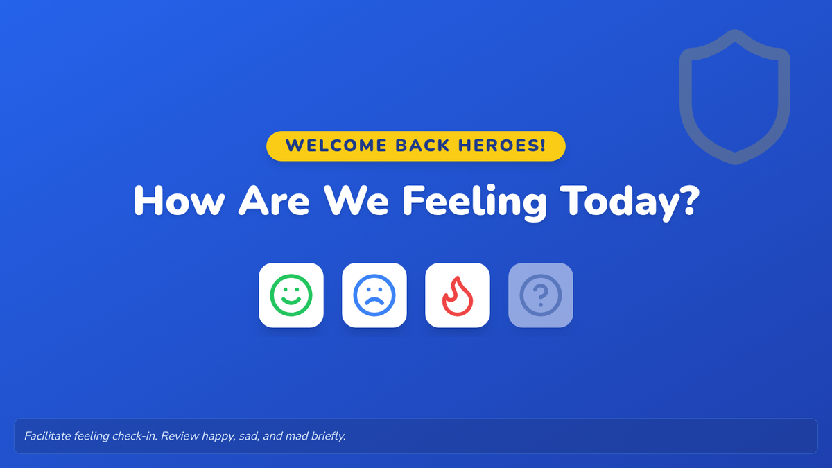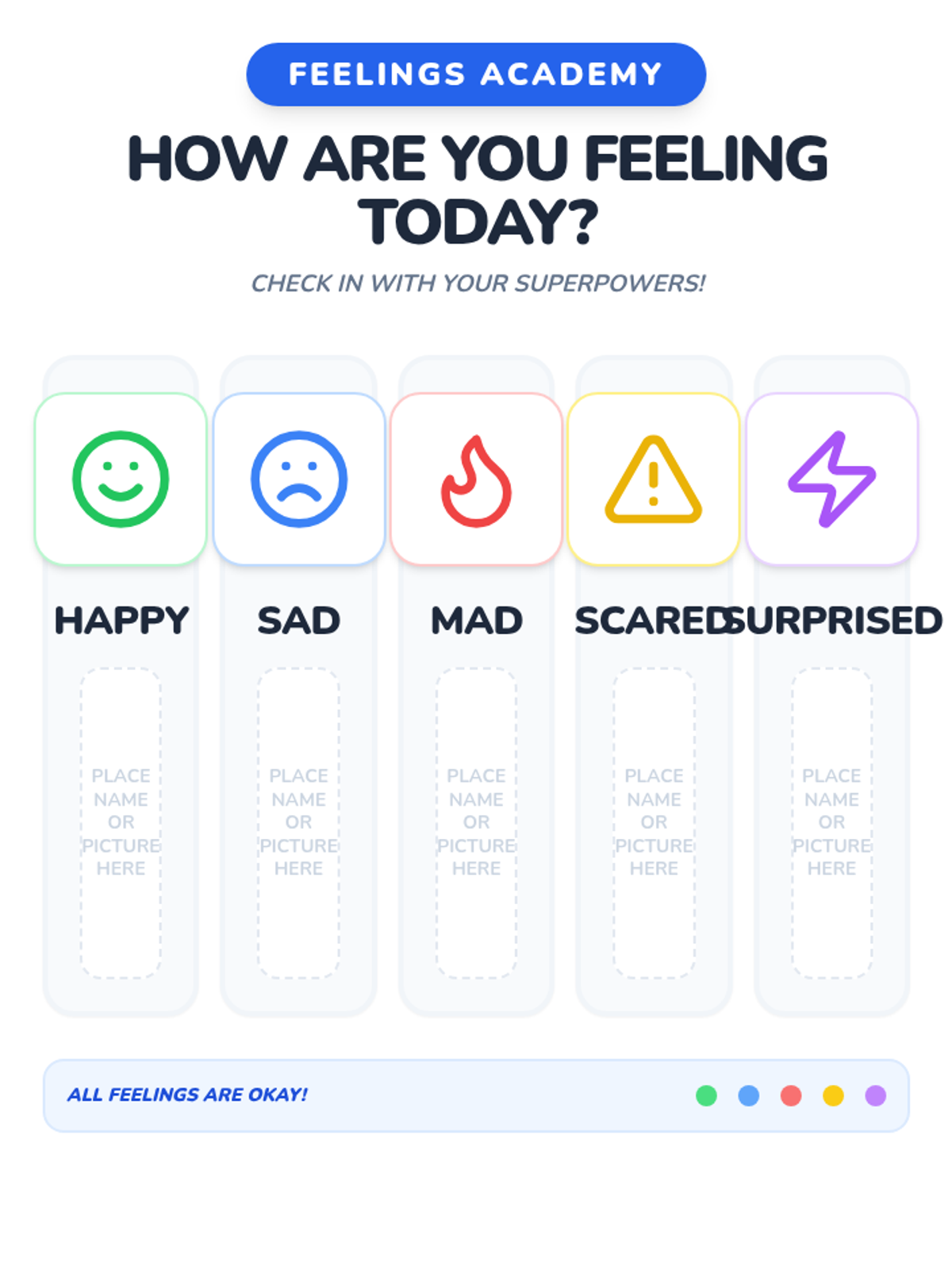 An 8-week Tier 2 group program for Kindergarten students focused on emotional literacy, coping skills, and help-seeking. Students learn to identify feelings, understand that emotions change, build empathy, and practice self-regulation using a "Superpower" theme.