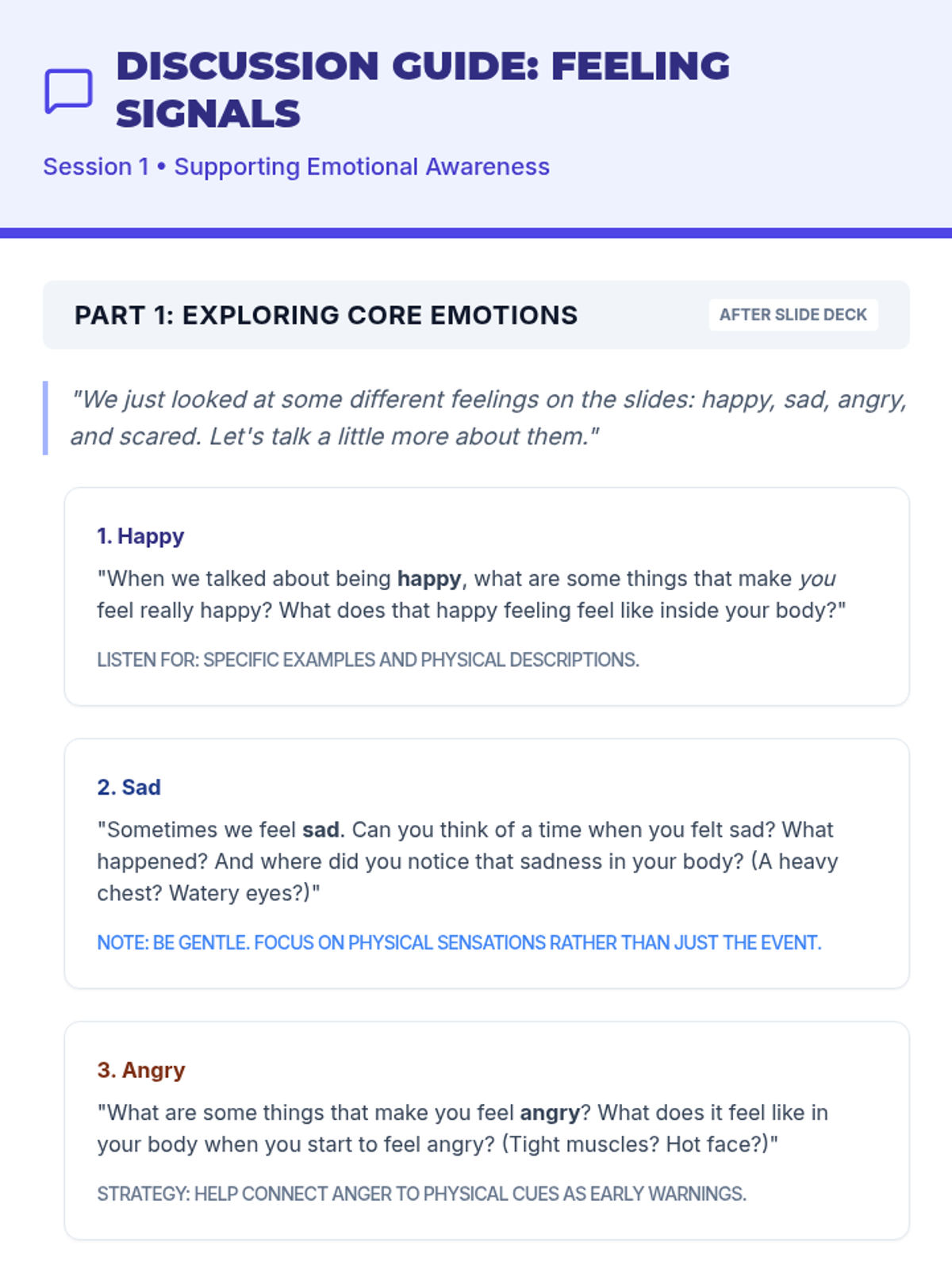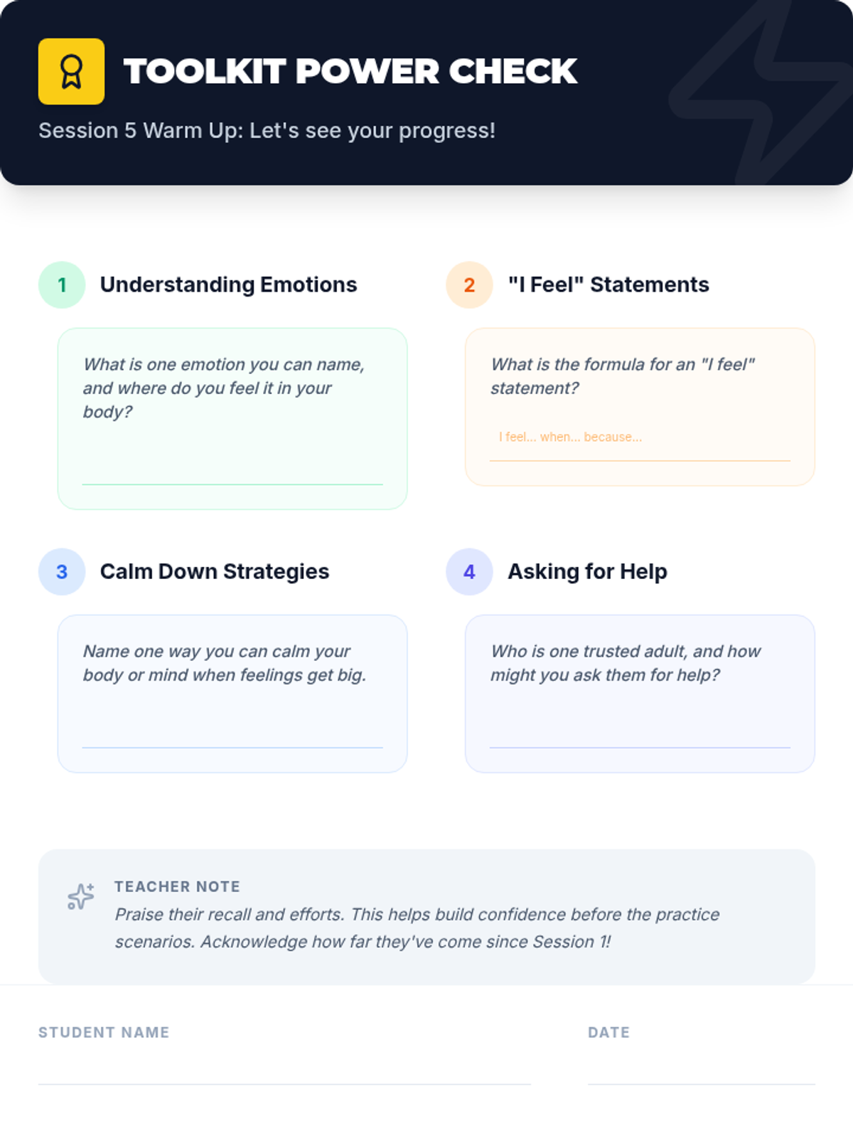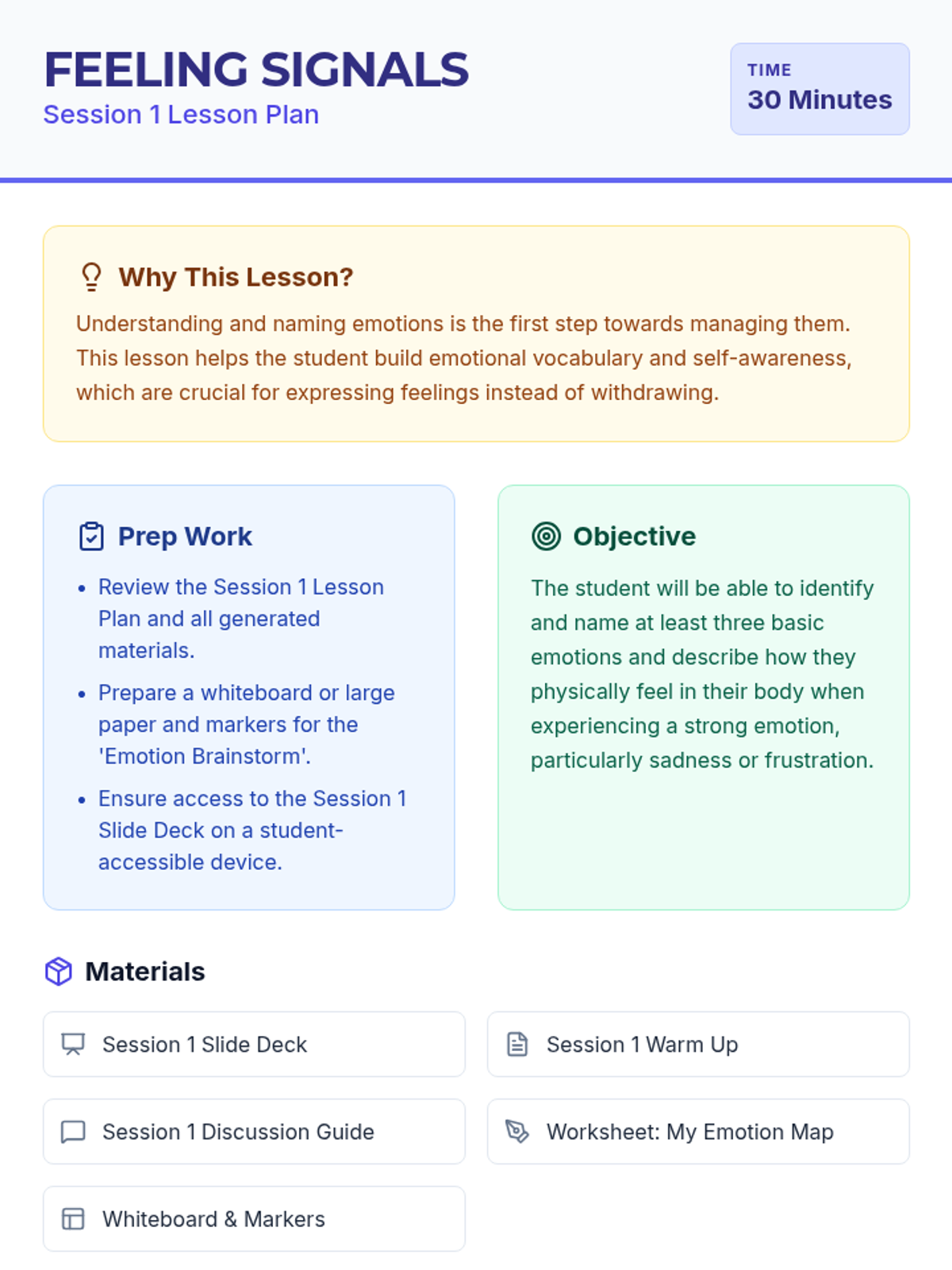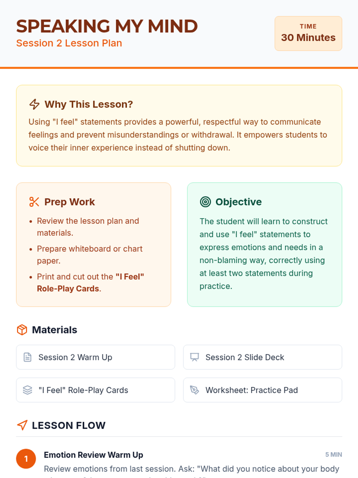 A 5-session, Tier 3 individual intervention series for 4th-grade students focused on emotional literacy, communication skills, and self-advocacy. The series helps students identify physical signals of emotions, use "I feel" statements, implement calming strategies, and seek help from trusted adults.