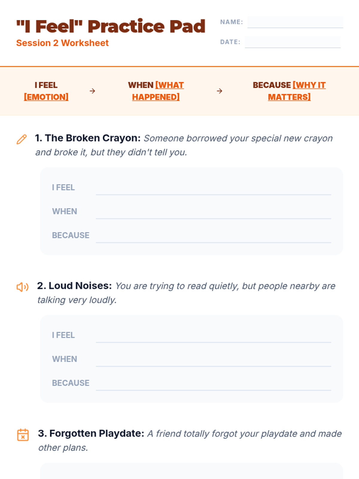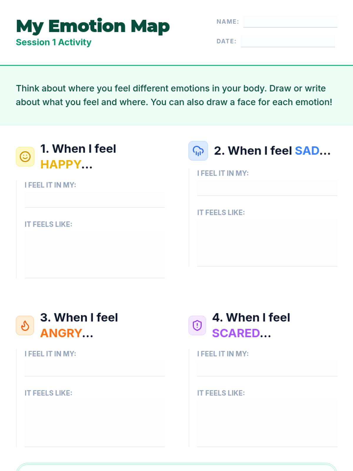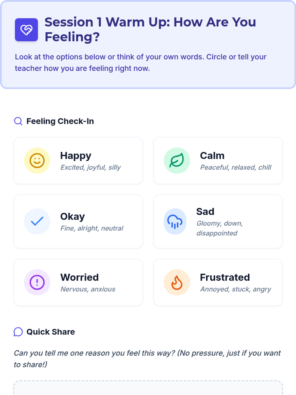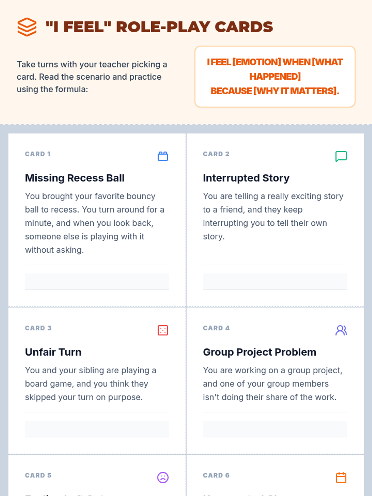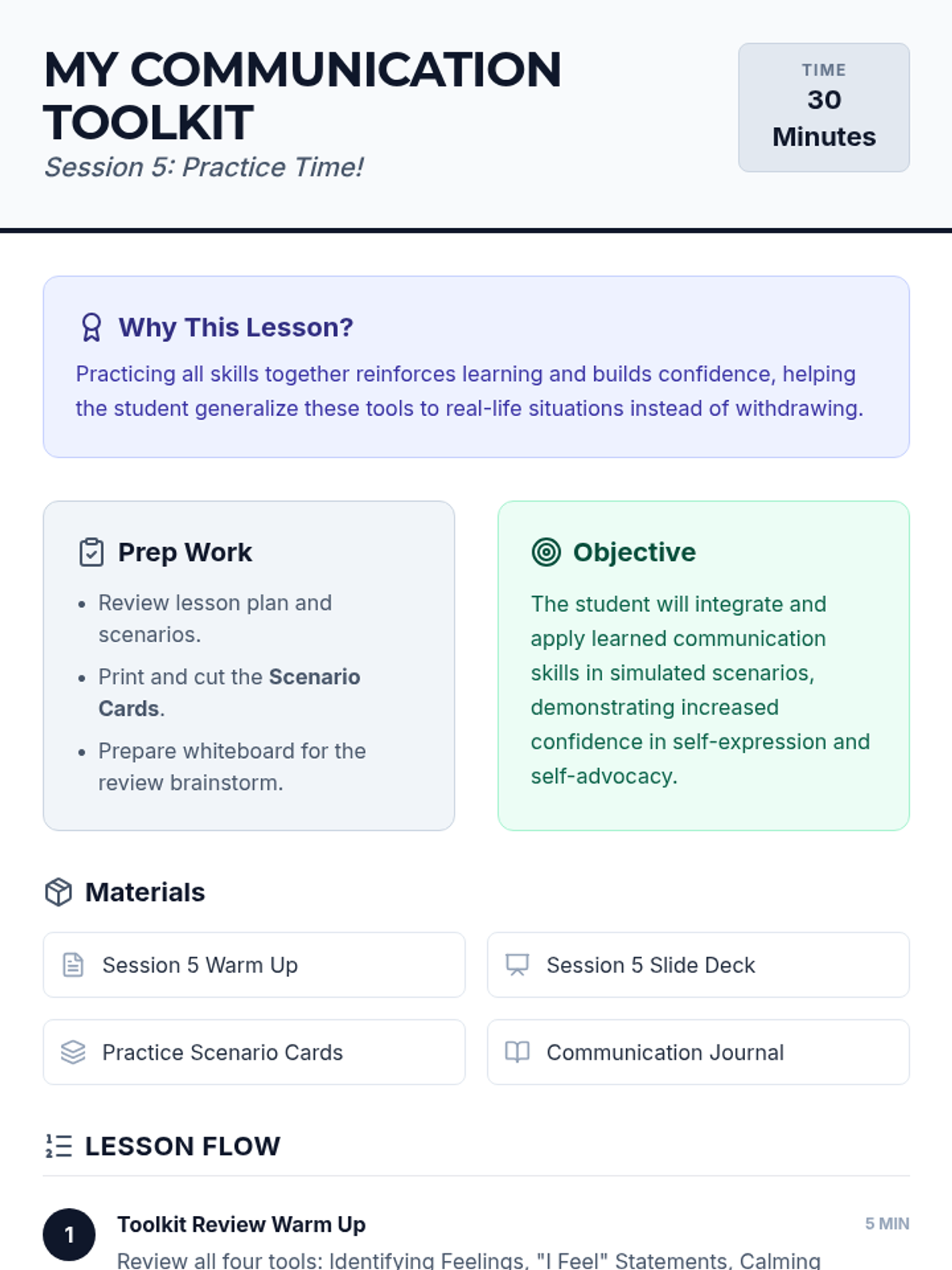 A 5-session, Tier 3 individual intervention series for 4th-grade students focused on emotional literacy, communication skills, and self-advocacy. The series helps students identify physical signals of emotions, use "I feel" statements, implement calming strategies, and seek help from trusted adults.