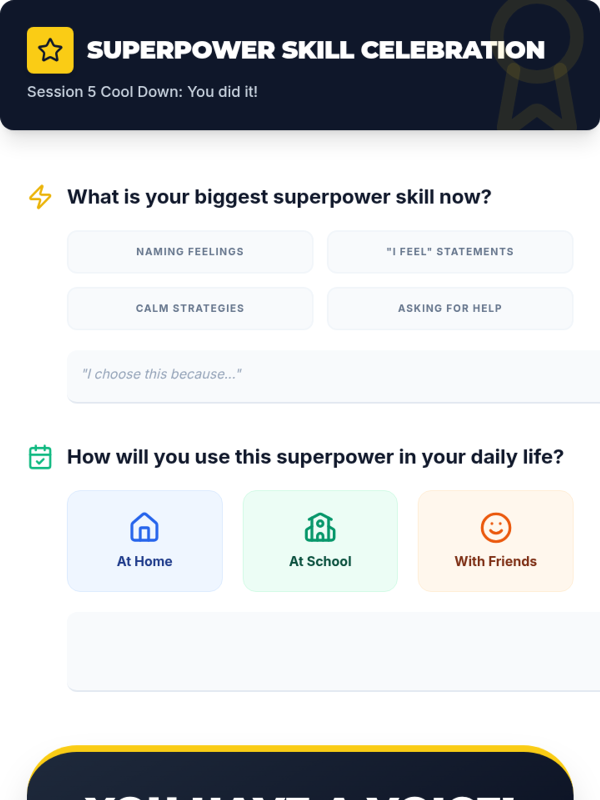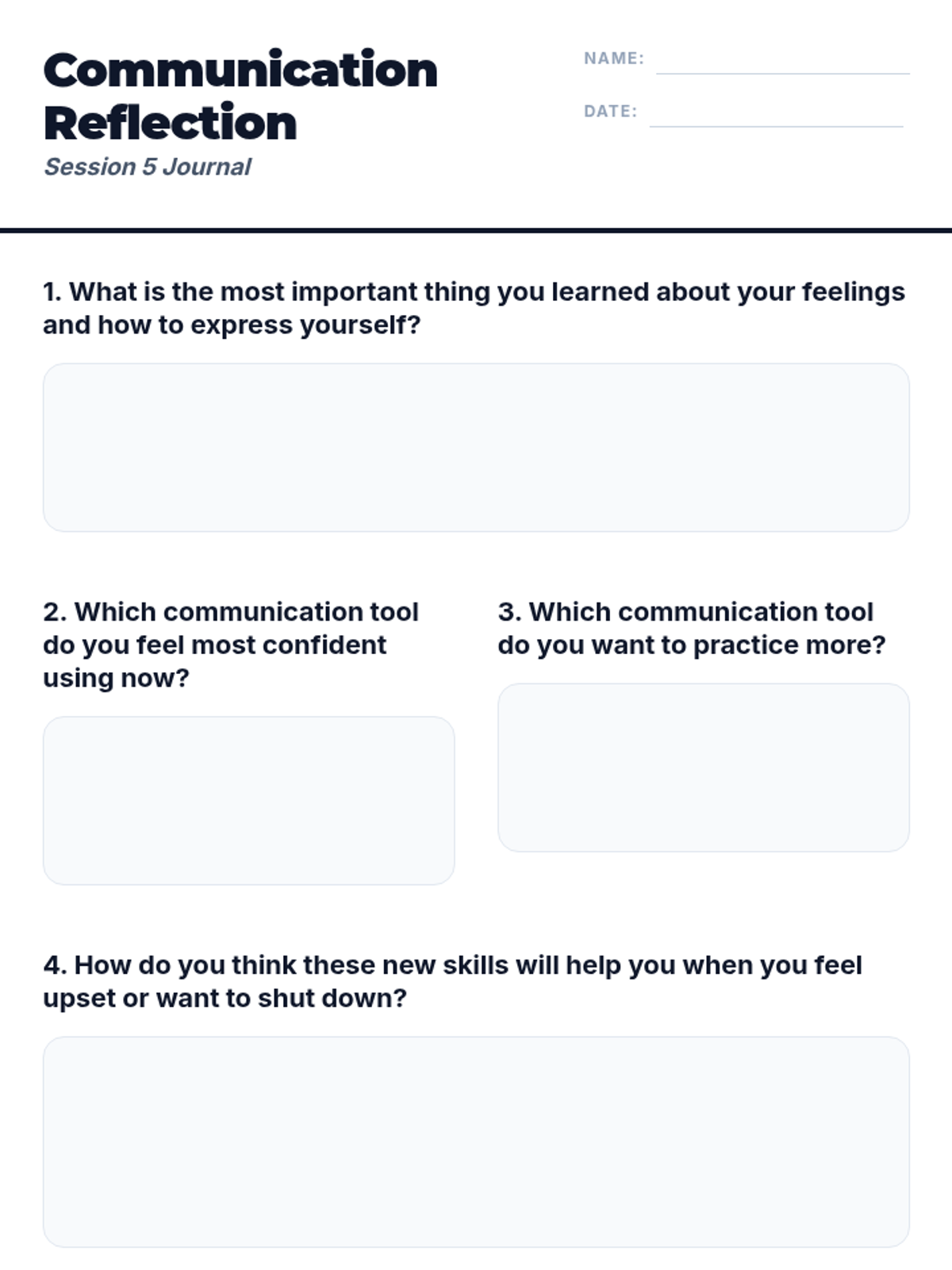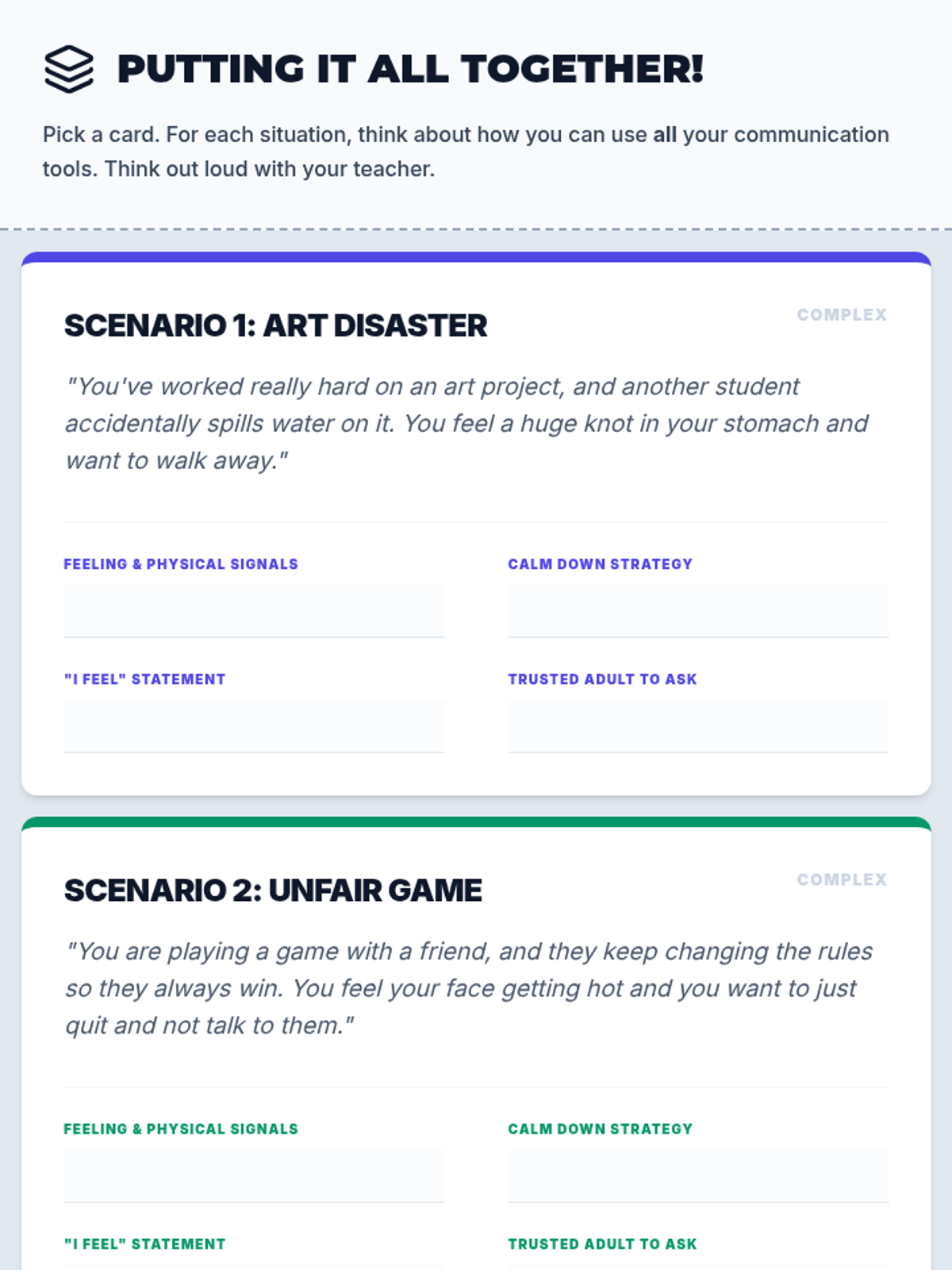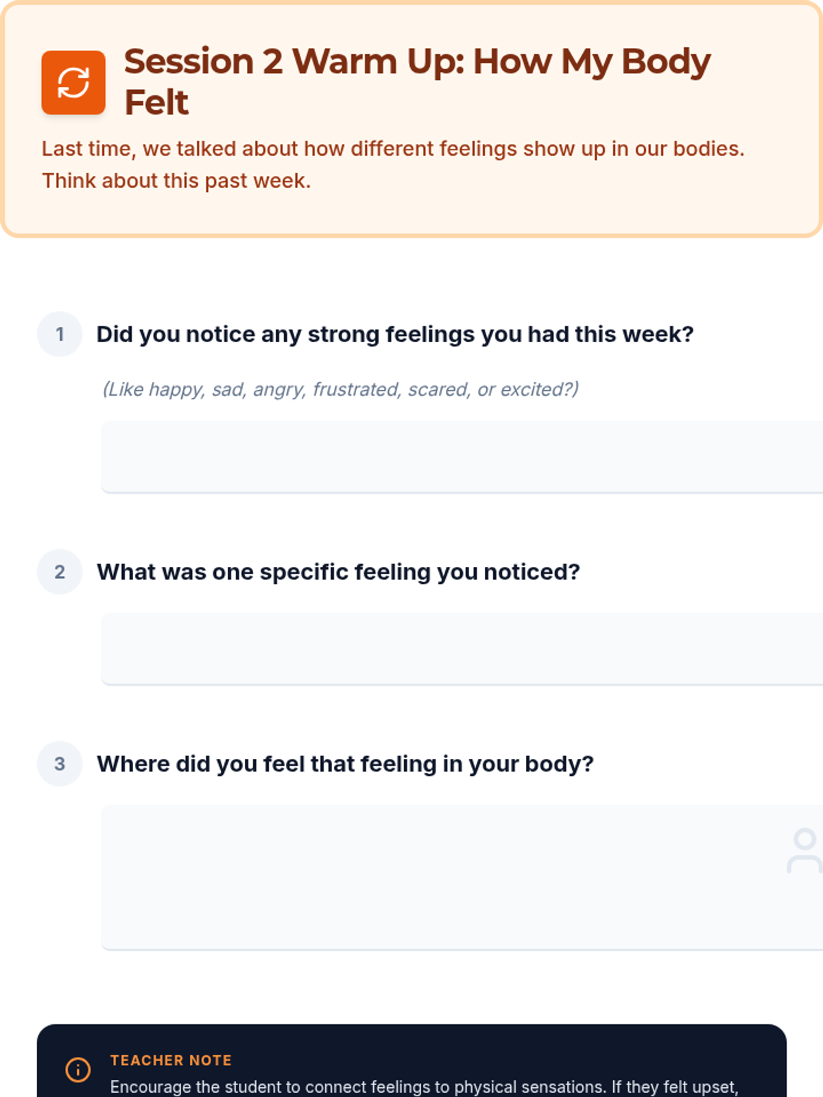 A 5-session, Tier 3 individual intervention series for 4th-grade students focused on emotional literacy, communication skills, and self-advocacy. The series helps students identify physical signals of emotions, use "I feel" statements, implement calming strategies, and seek help from trusted adults.