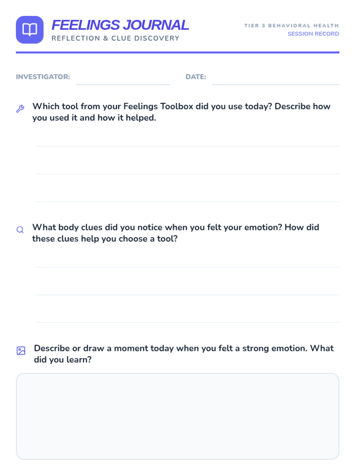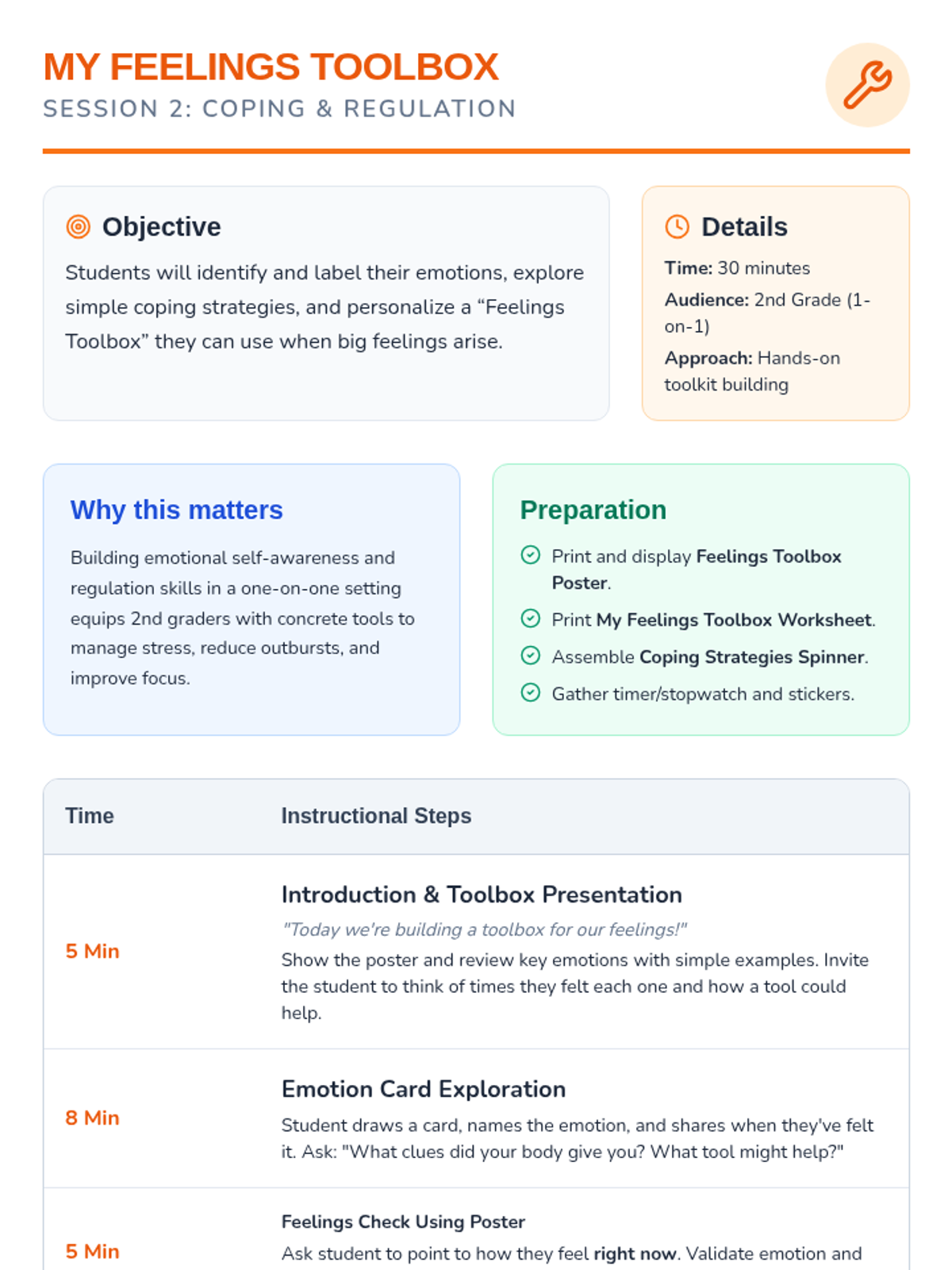 A Tier 3 behavioral health sequence for 2nd graders to build emotional intelligence and self-regulation. Students learn to identify body clues and build a personalized toolkit of coping strategies.