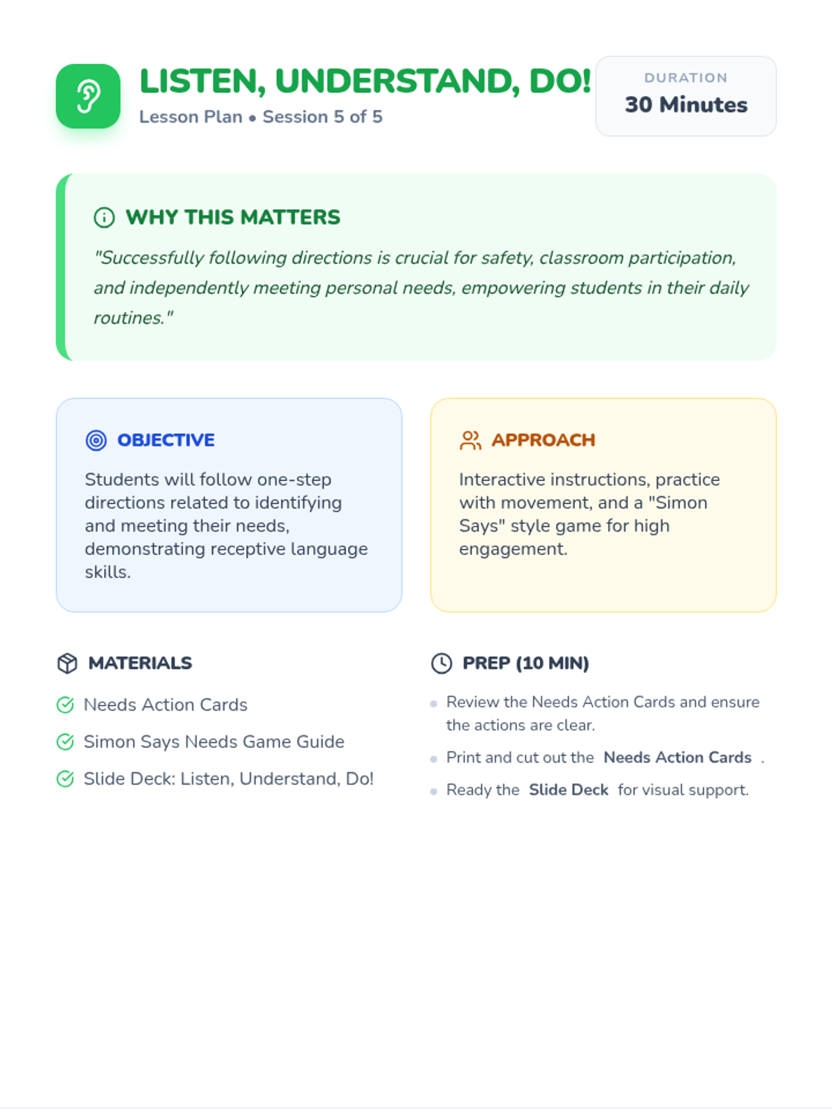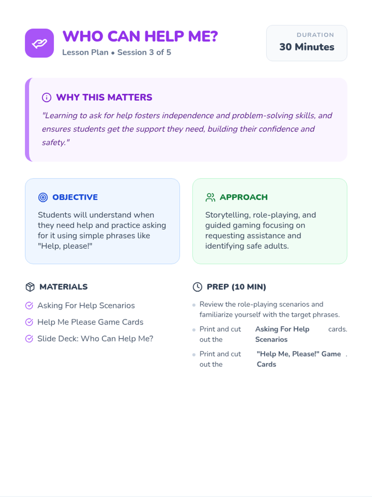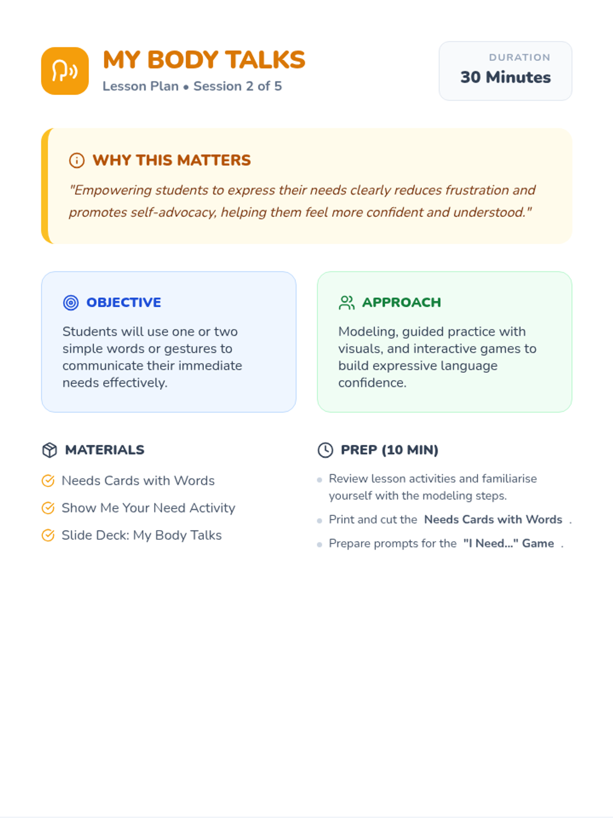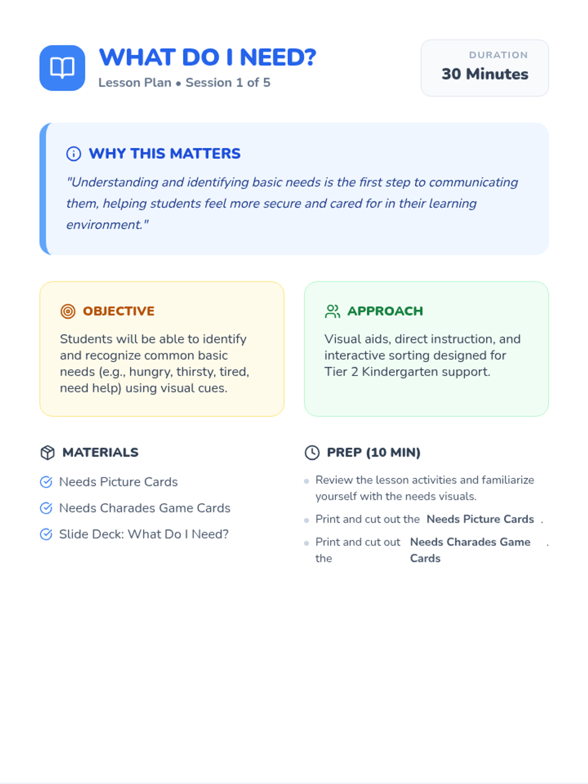A five-session Tier 2 intervention designed for kindergarten students to improve receptive and expressive language by learning to communicate basic needs, feelings, and requests for help.