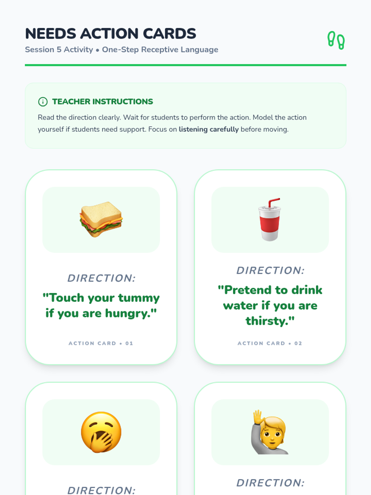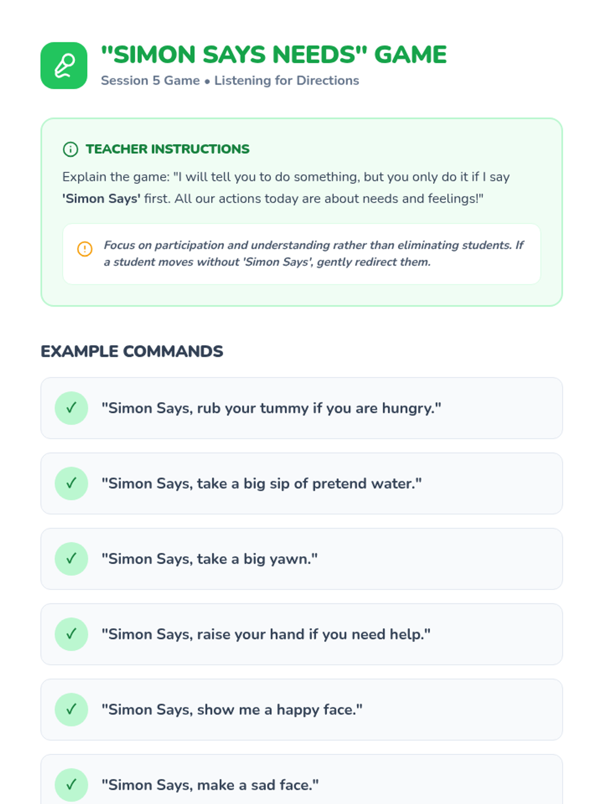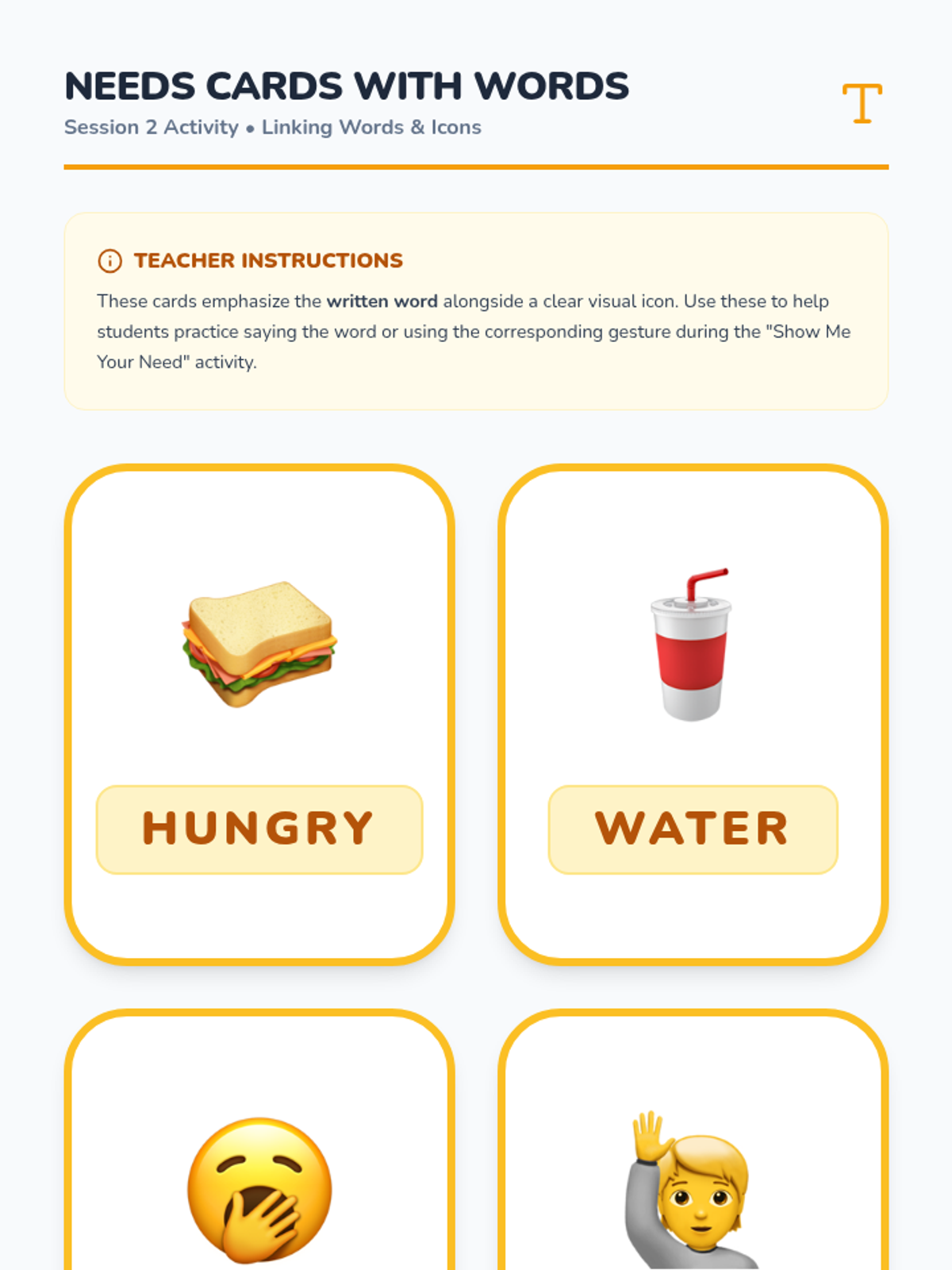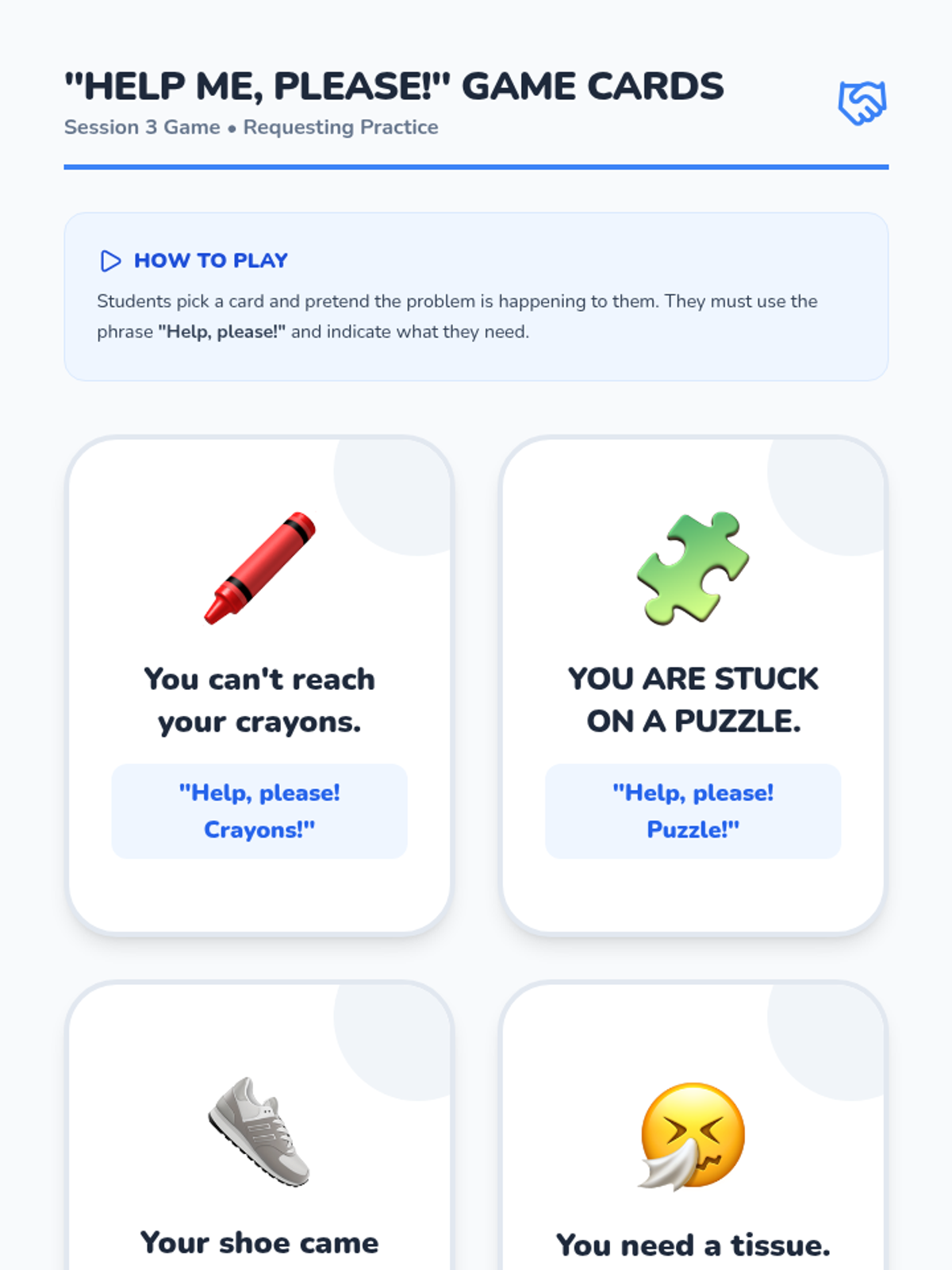 A five-session Tier 2 intervention designed for kindergarten students to improve receptive and expressive language by learning to communicate basic needs, feelings, and requests for help.