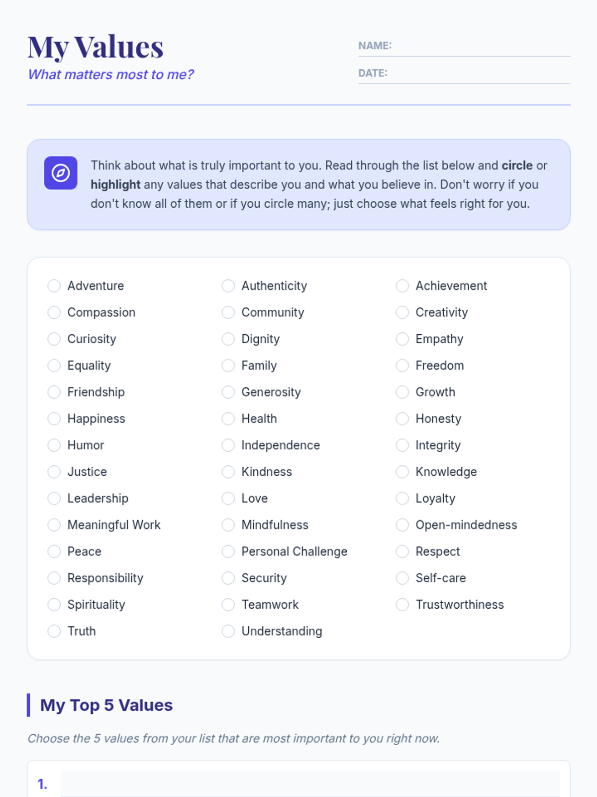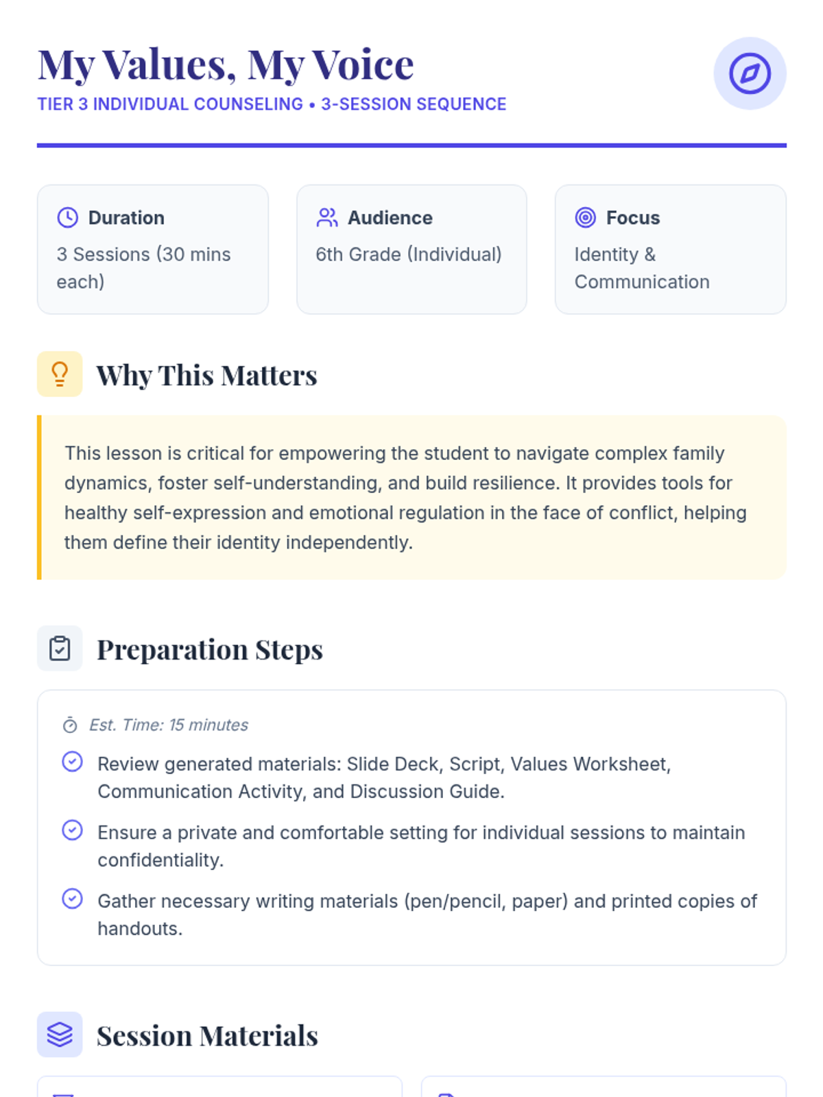 A three-session individual counseling sequence for 6th graders to explore personal values, navigate family conflict, and develop respectful communication and coping skills.