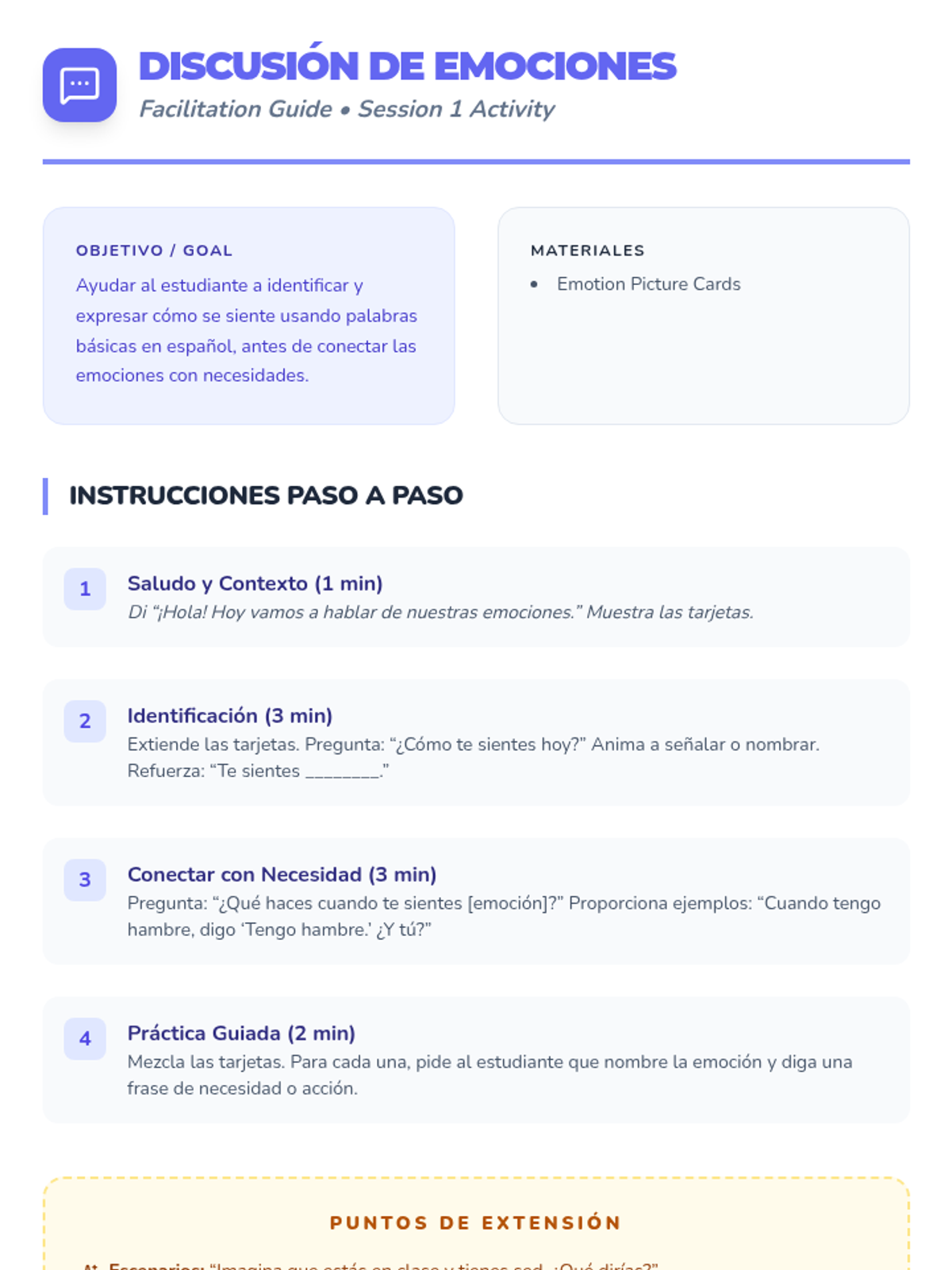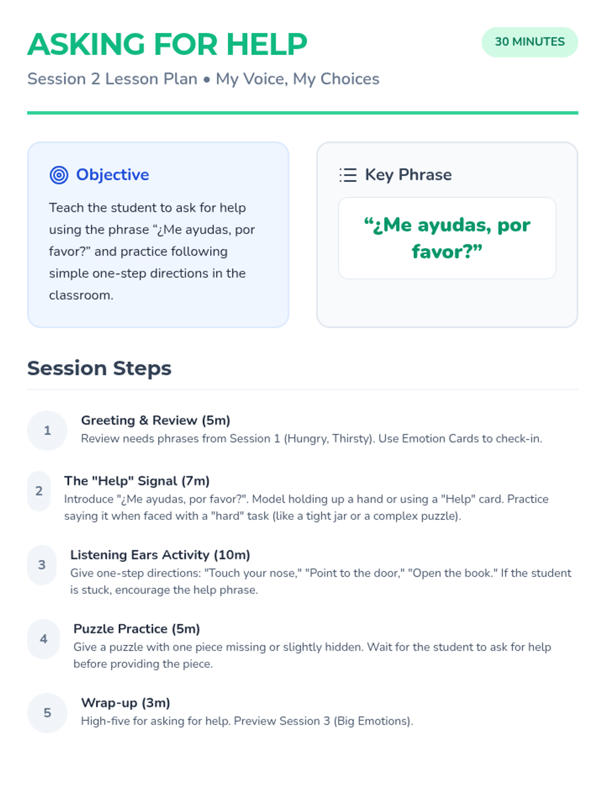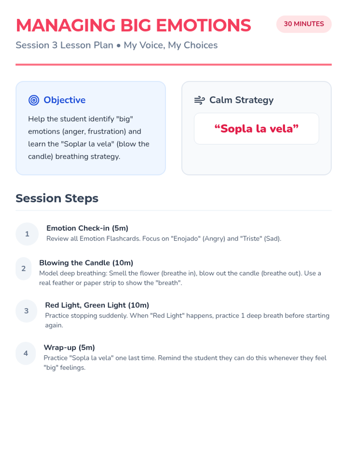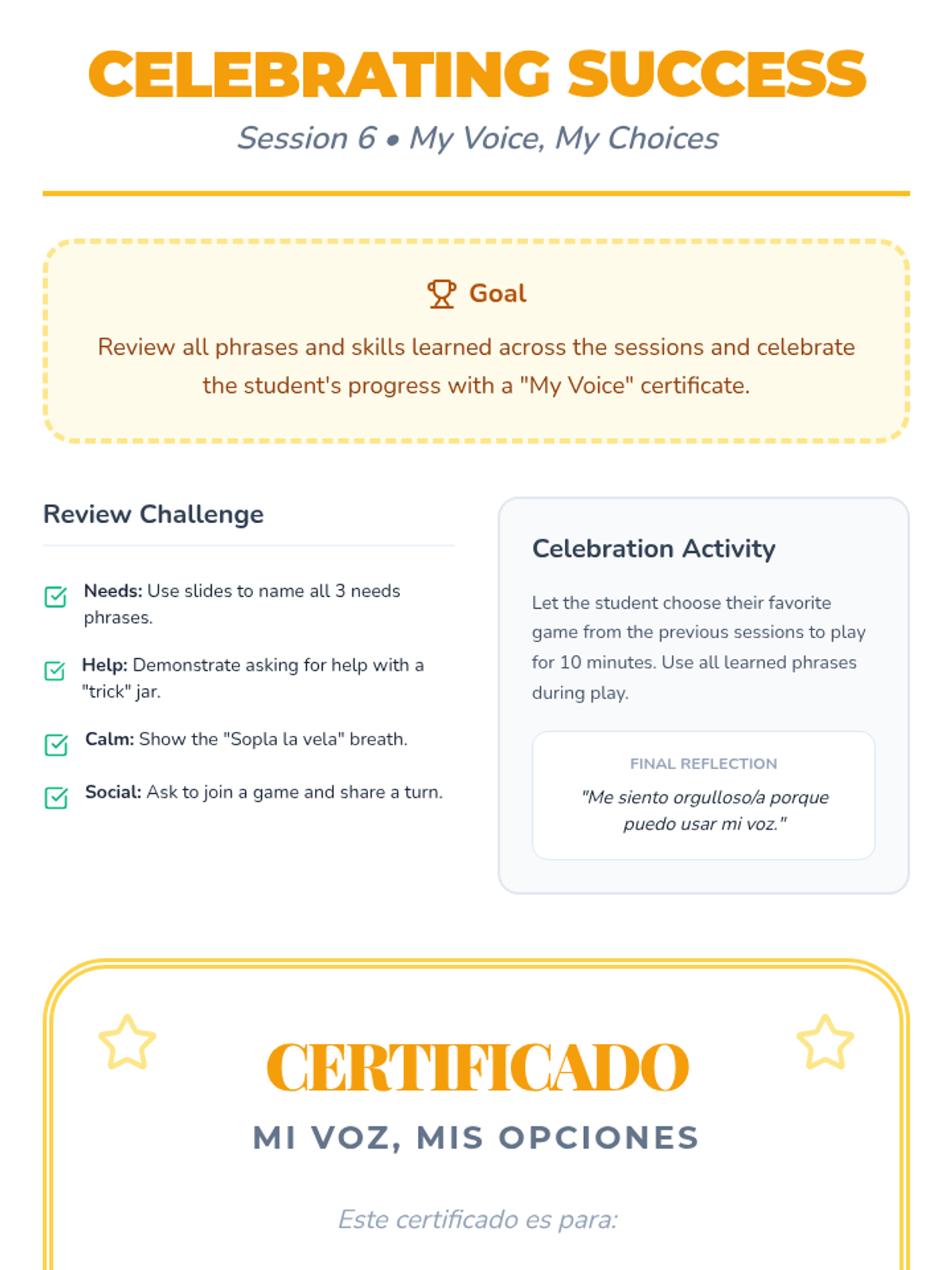 A 6-session individual intervention for Spanish-speaking kindergarten students to build communication skills, self-regulation, and classroom confidence. Each session focuses on a specific behavioral or language goal using interactive tools.