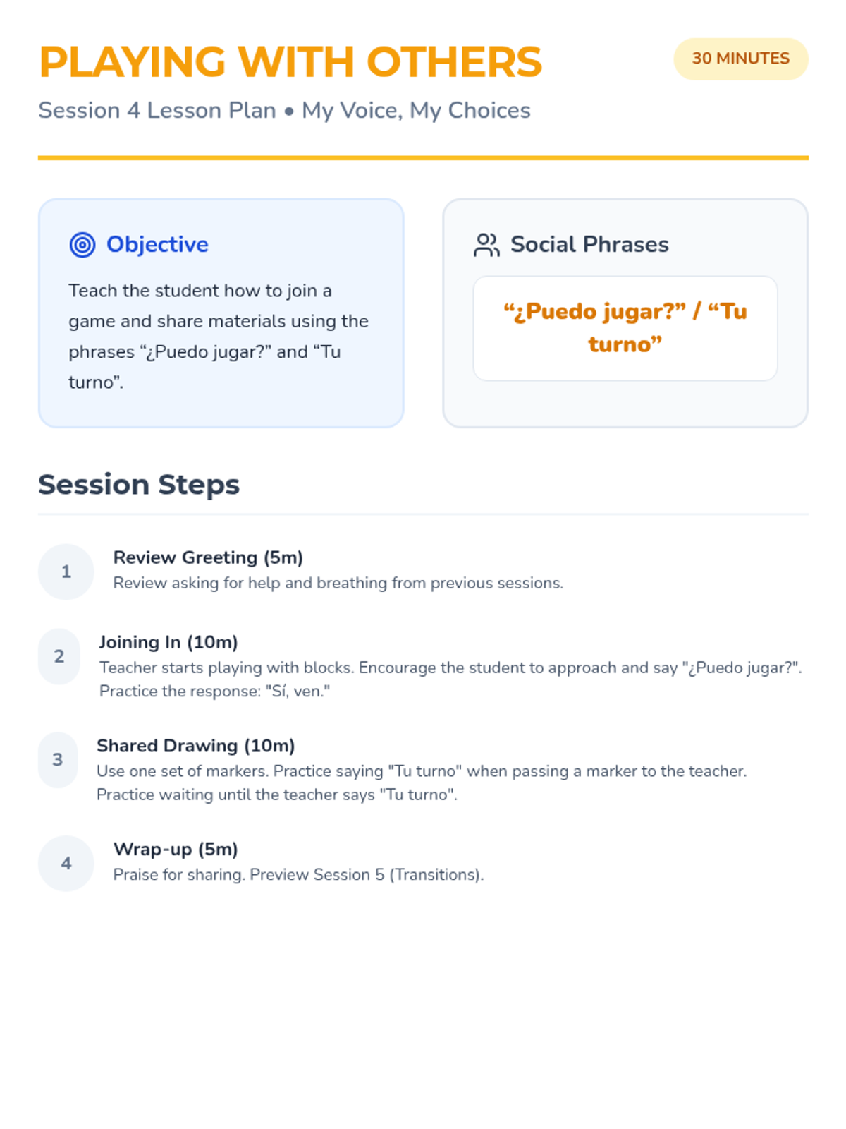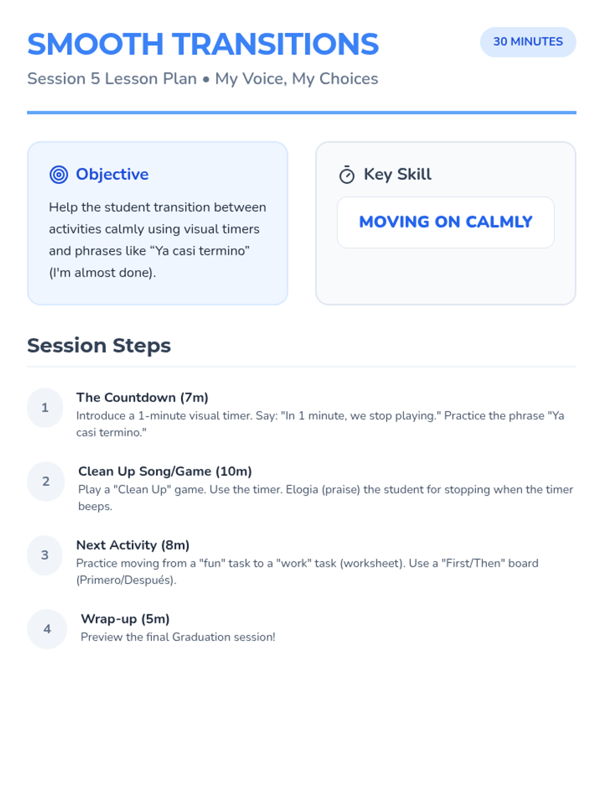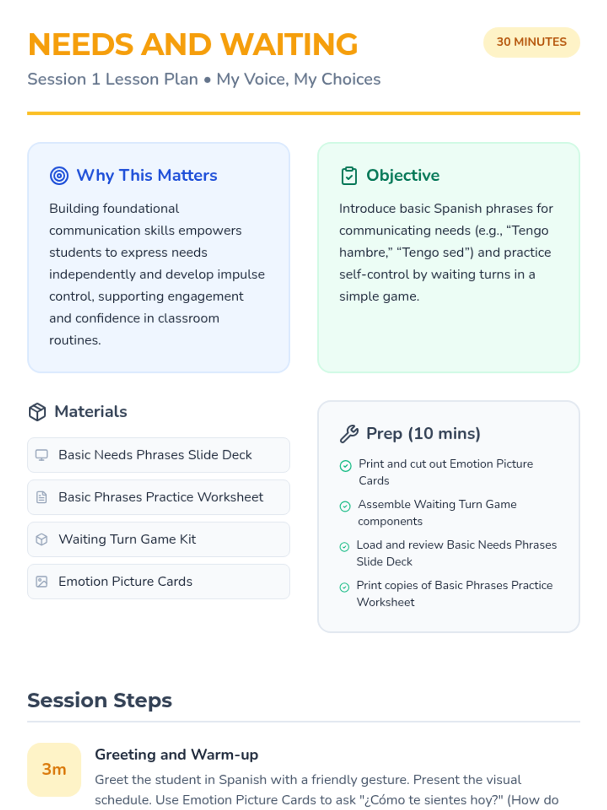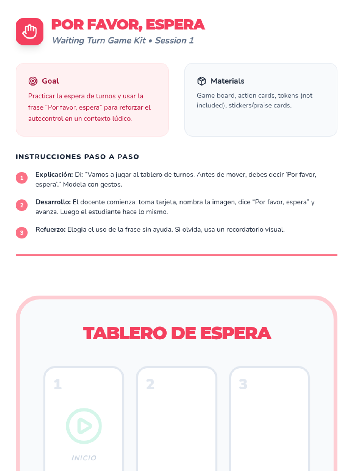 A 6-session individual intervention for Spanish-speaking kindergarten students to build communication skills, self-regulation, and classroom confidence. Each session focuses on a specific behavioral or language goal using interactive tools.