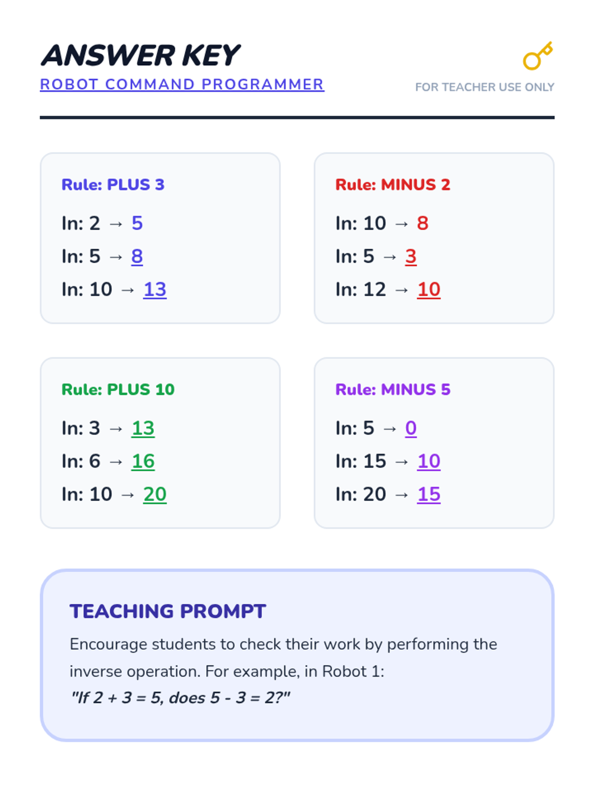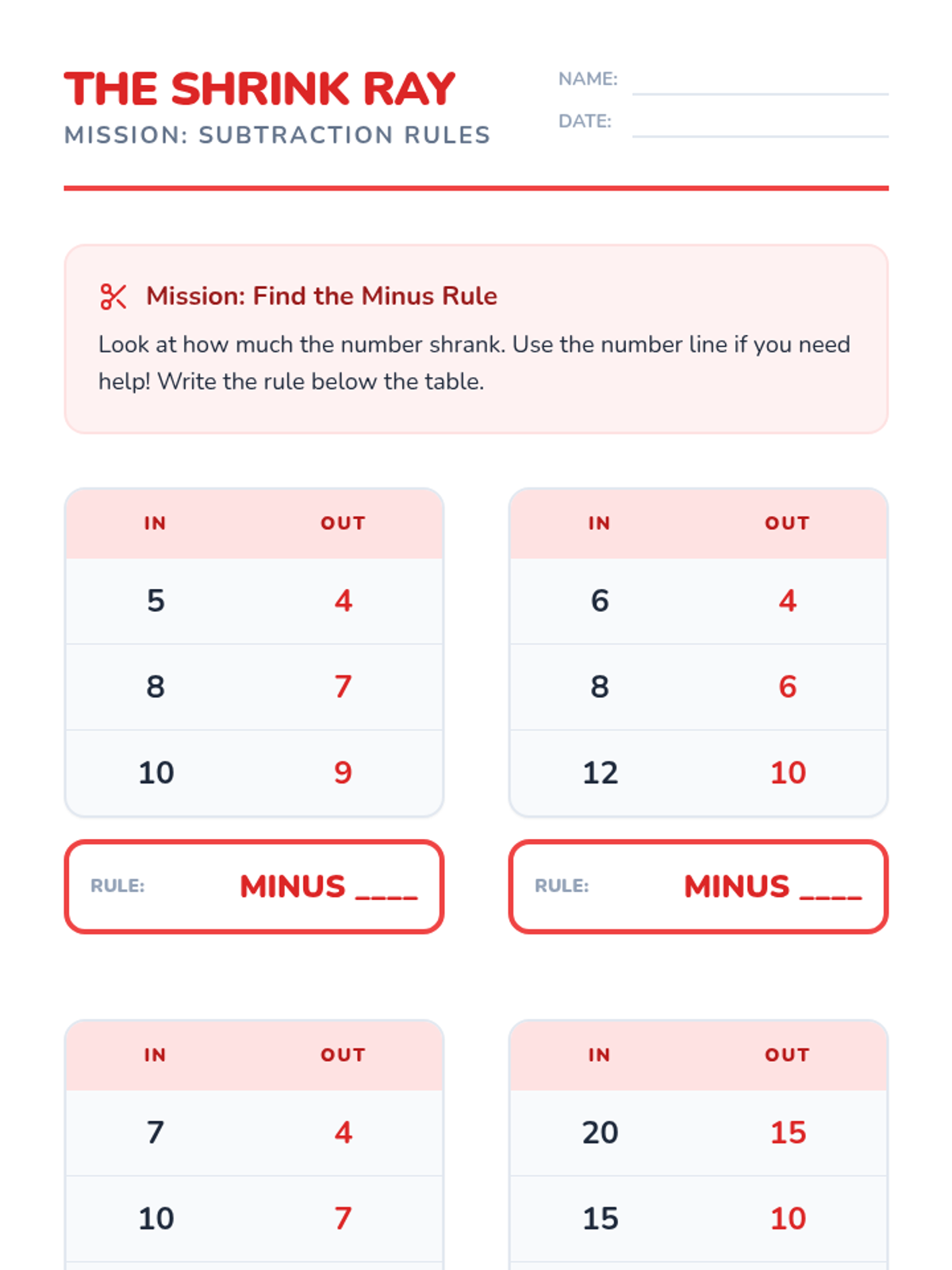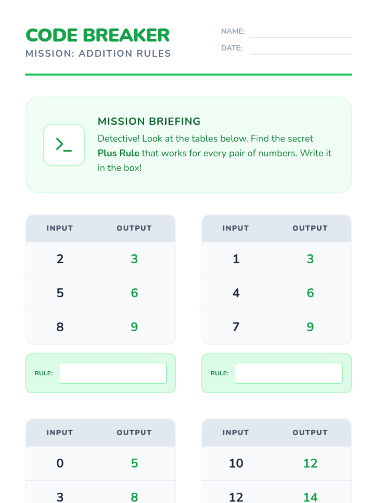 A 1st Grade sequence exploring quantitative relationships through the concept of 'Function Machines.' Students learn to identify and apply addition and subtraction rules to predict outcomes and create their own mathematical patterns.