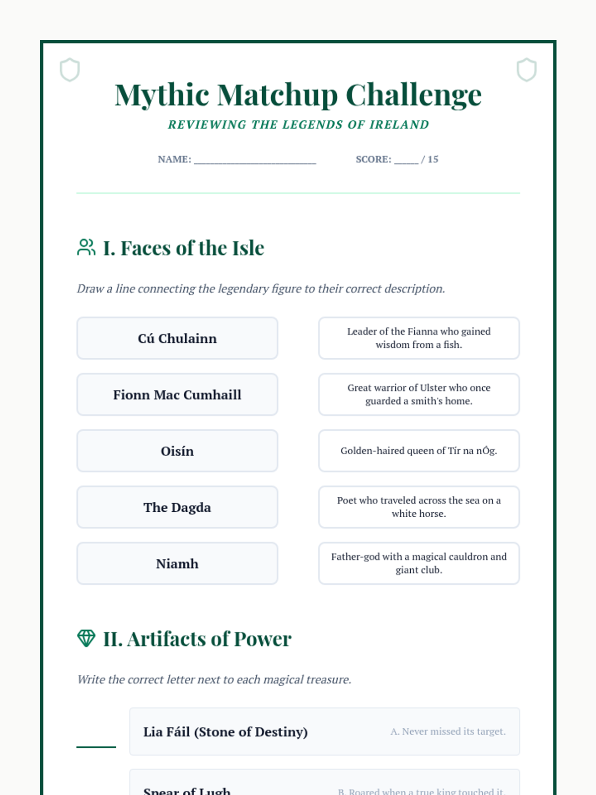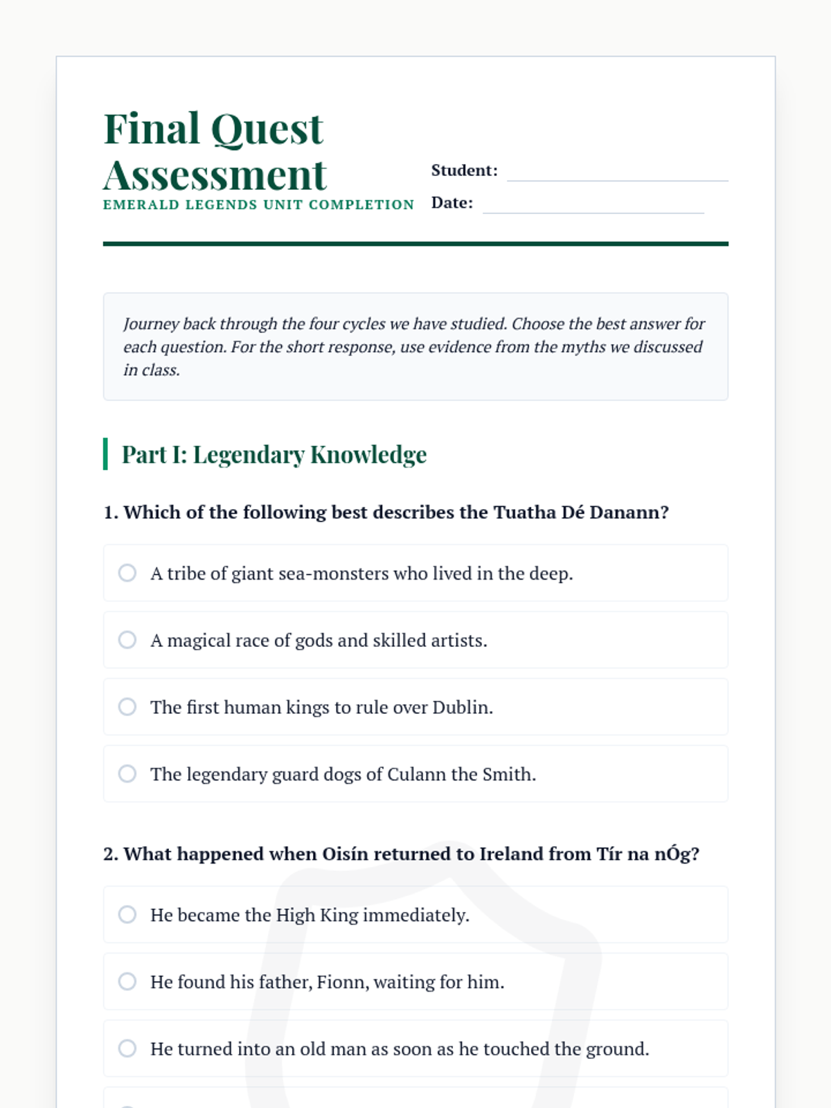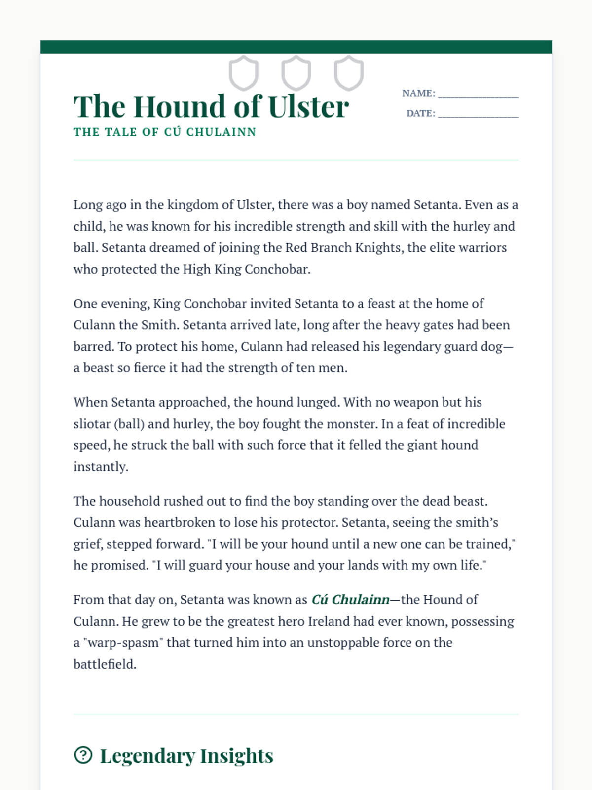 A week-long exploration of Irish mythology, covering the Tuatha Dé Danann, the Ulster Cycle, the Fenian Cycle, and the magical Otherworld. Students will read classic legends, analyze character traits, and organize the various cycles of Irish lore.