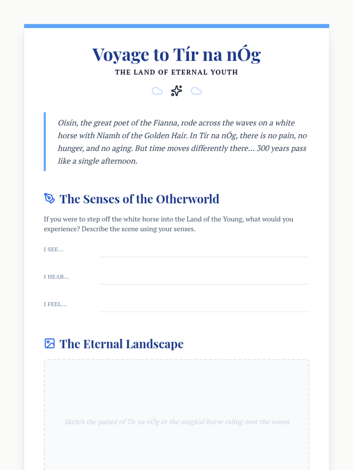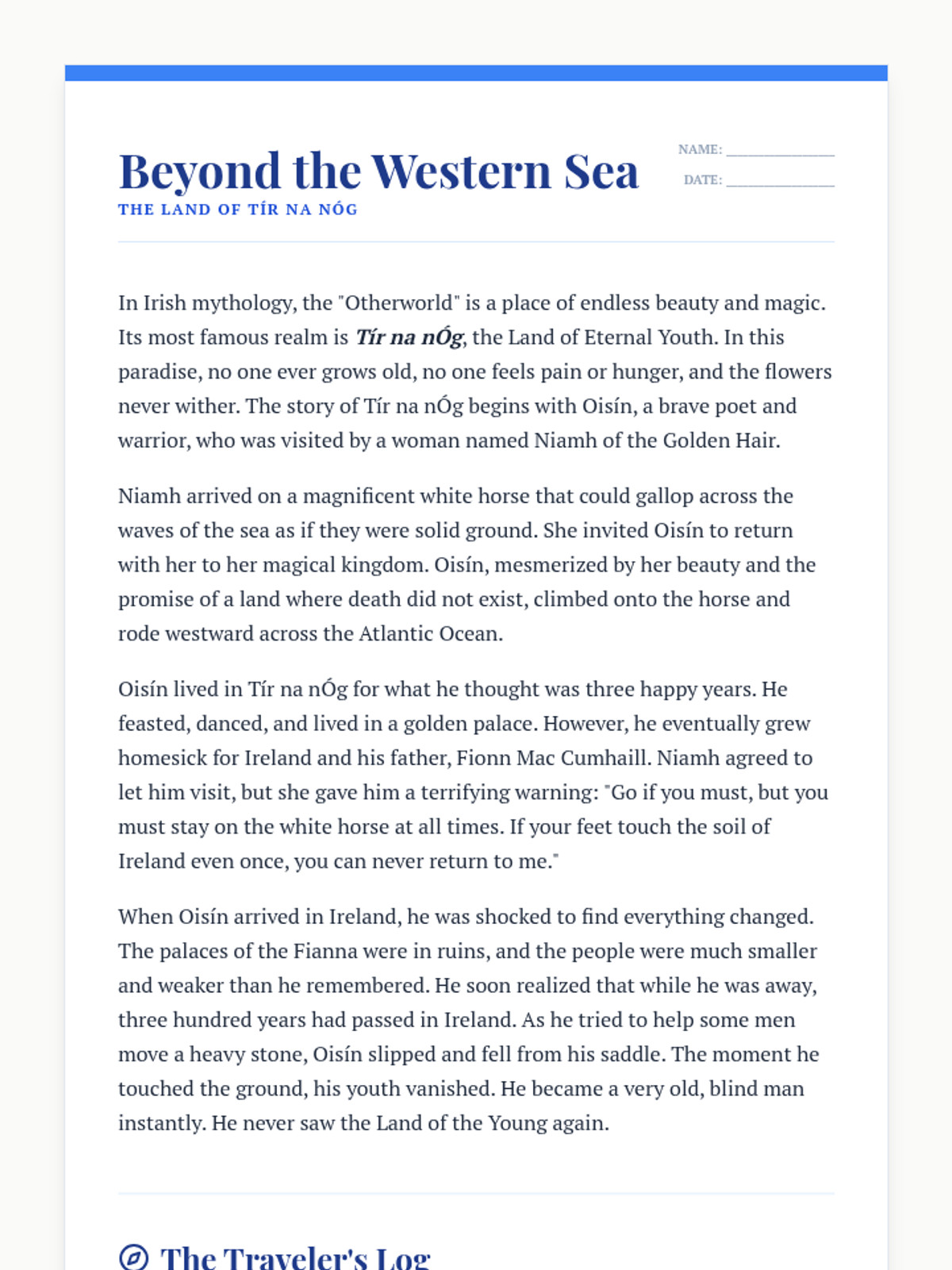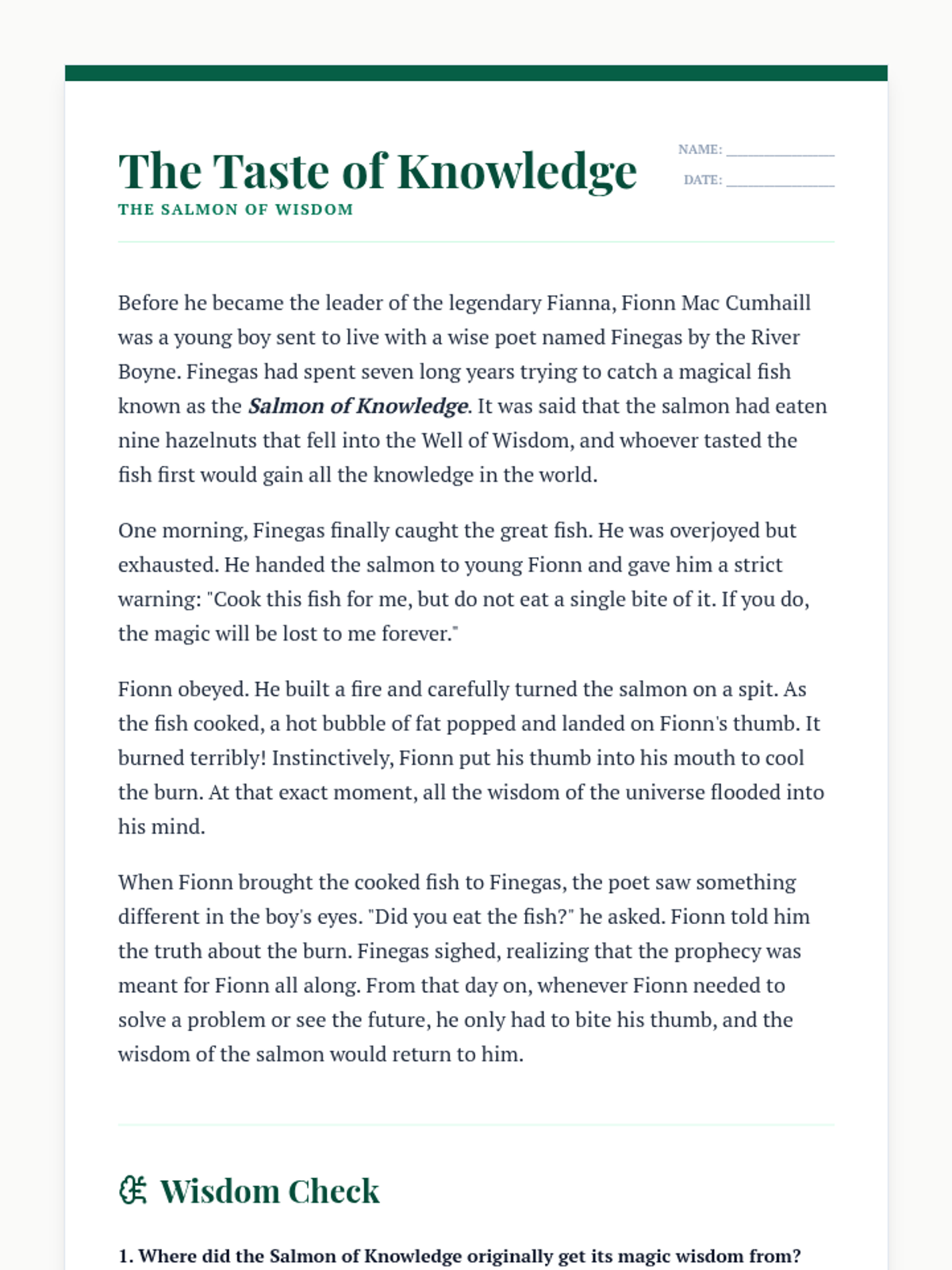 A week-long exploration of Irish mythology, covering the Tuatha Dé Danann, the Ulster Cycle, the Fenian Cycle, and the magical Otherworld. Students will read classic legends, analyze character traits, and organize the various cycles of Irish lore.