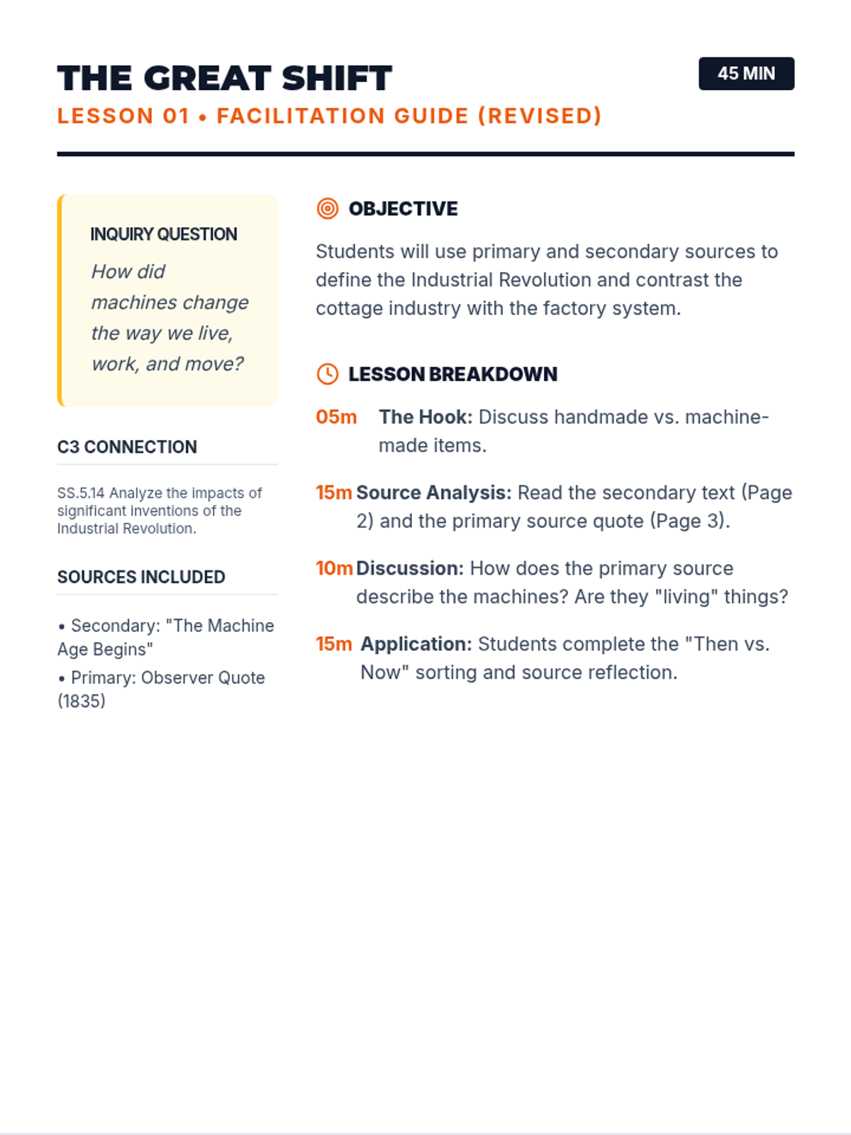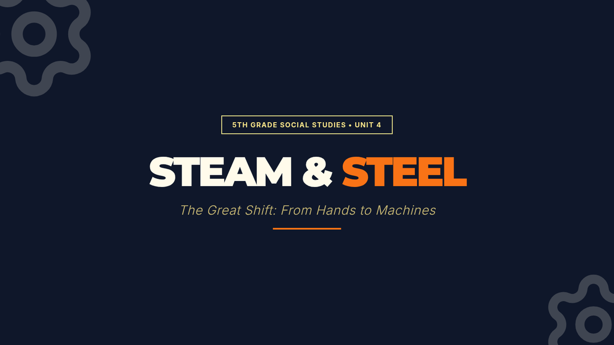 A 20-lesson inquiry unit for 5th grade exploring the Industrial Revolution's impact on innovation, movement, urbanization, and living conditions using the C3 Framework. Students investigate how steam and steel transformed the American landscape and society from 1800 to 1900.