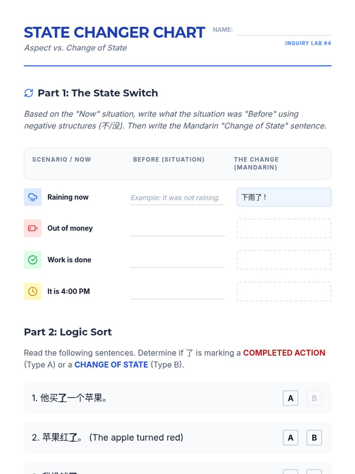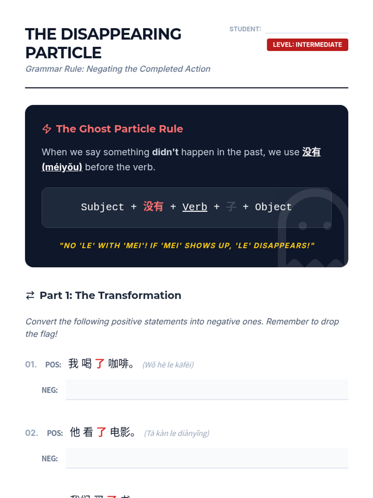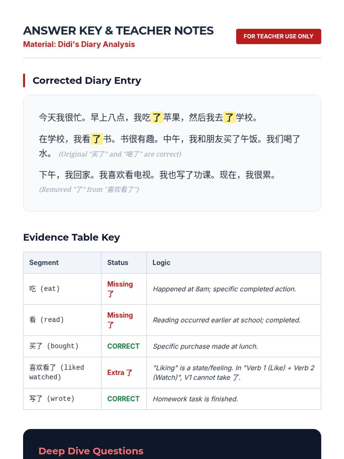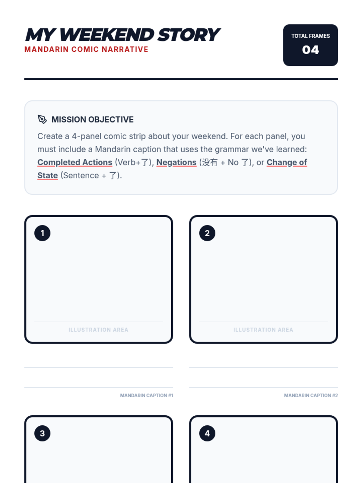 This sequence guides 8th-grade Mandarin students through the multi-faceted use of the particle 'le'. It covers completed actions, negation rules, and change of state, culminating in a personal narrative project.