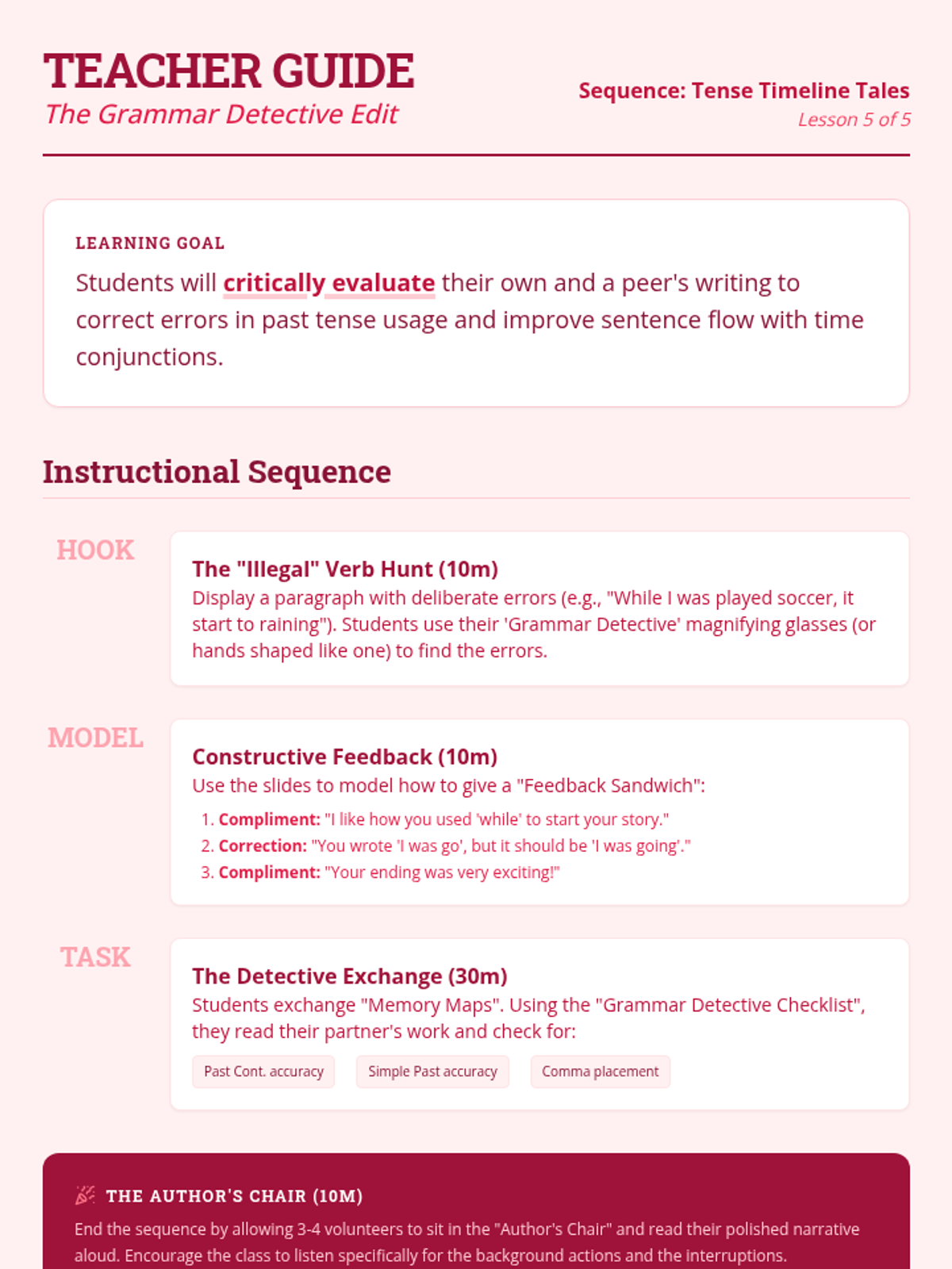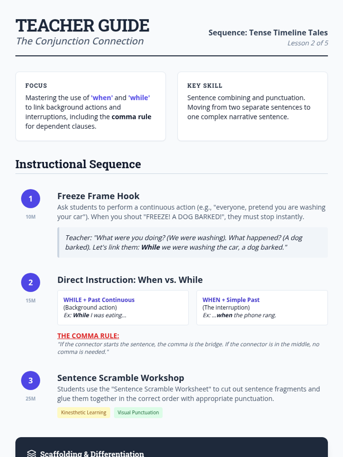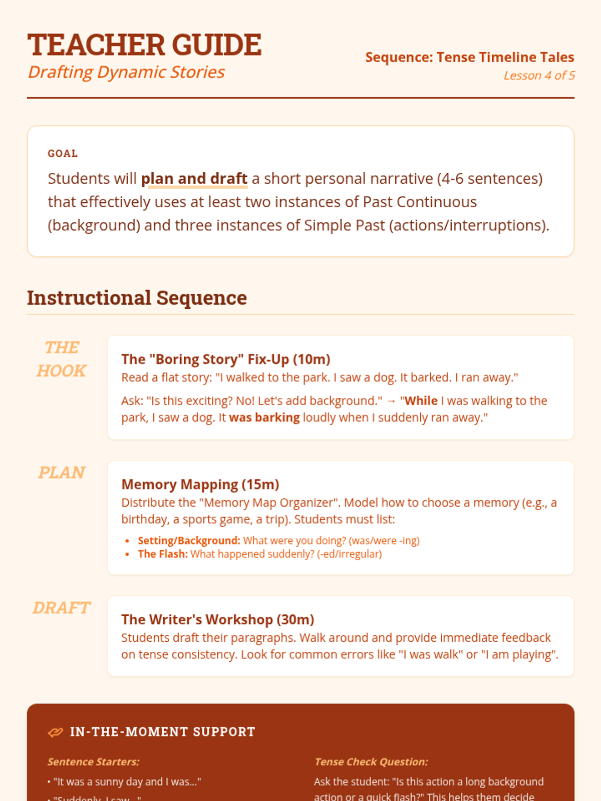 A comprehensive 5-lesson sequence for 4th Grade ESL students to master the use of Simple Past and Past Continuous tenses in storytelling. Students progress from identifying tenses to using conjunctions 'when' and 'while', mastering irregular verbs, and drafting personal narratives.