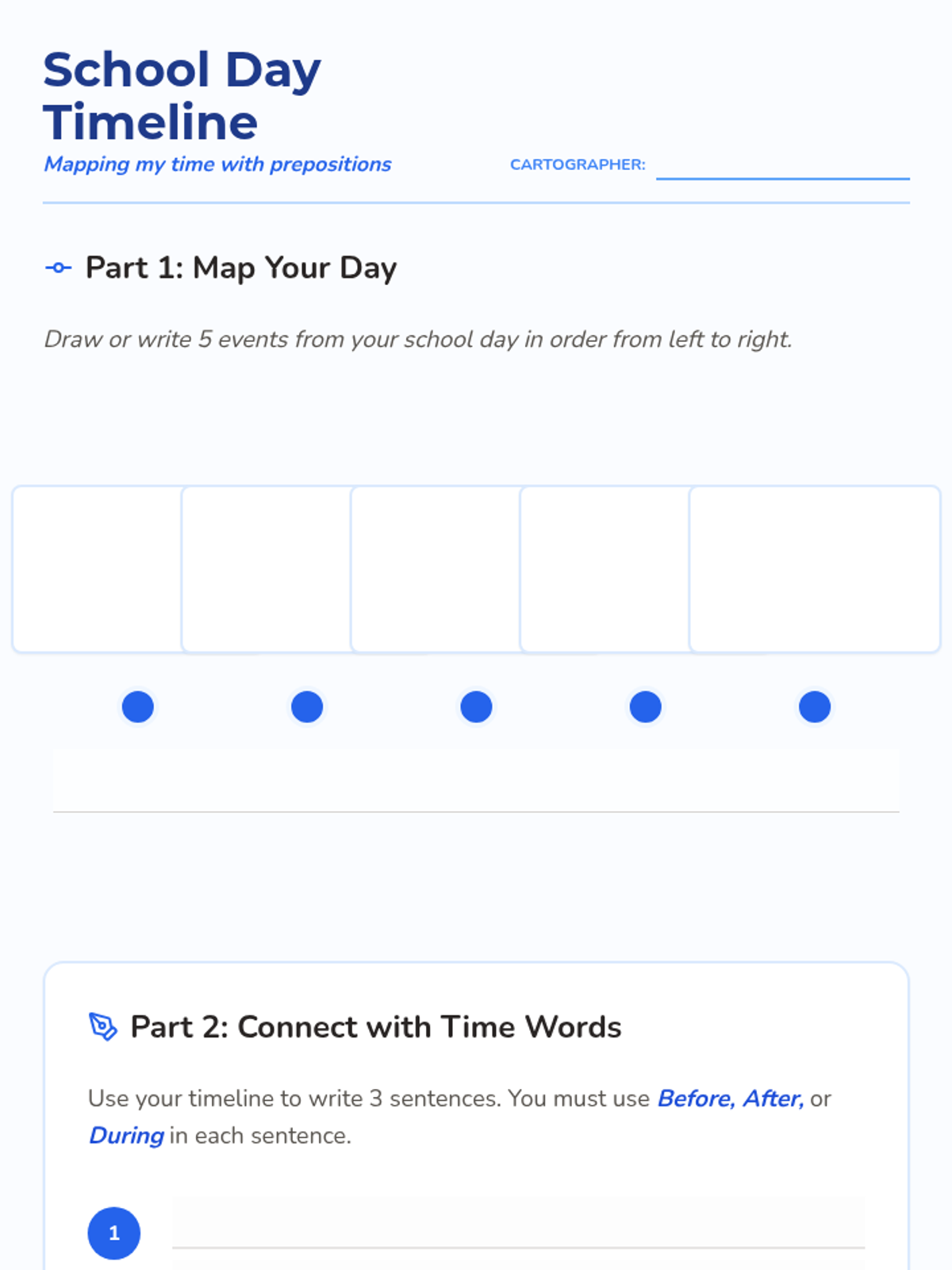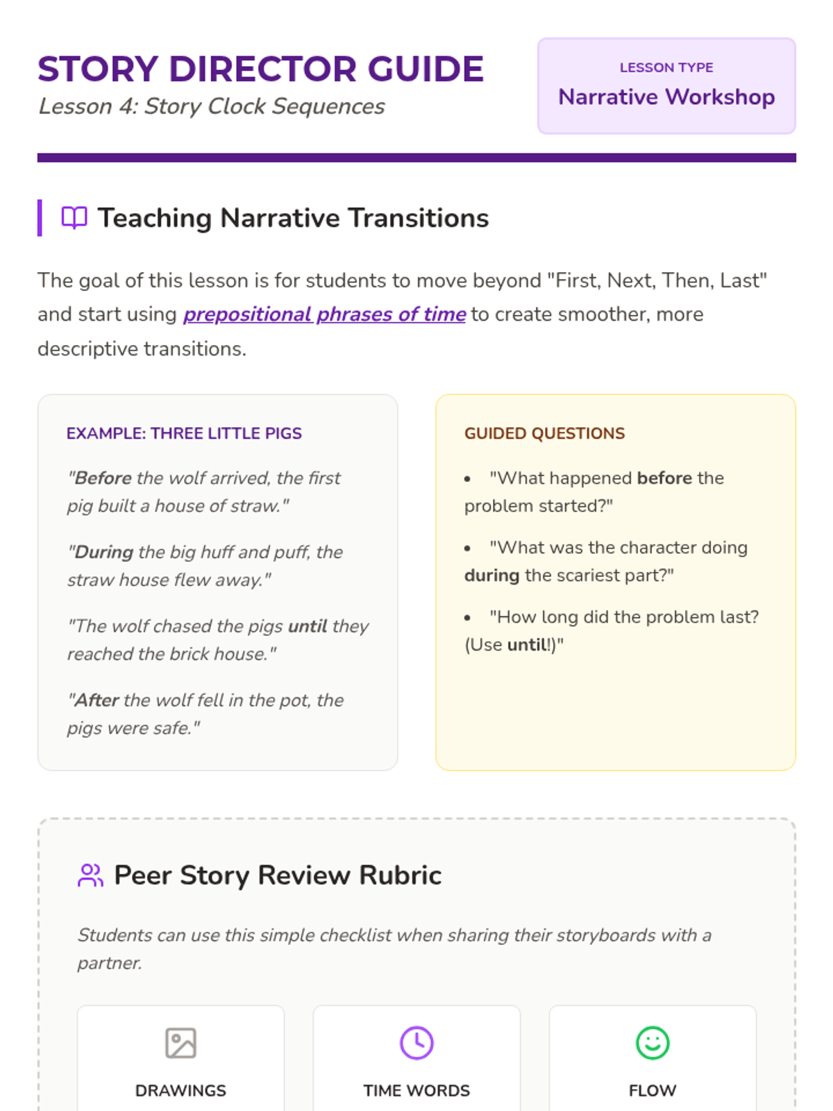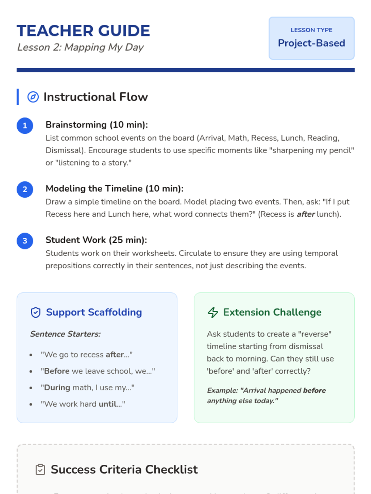 A 5-lesson series for 2nd graders focusing on temporal prepositions (before, after, during, until) and their role in sequencing events, narrative structure, and procedural writing. Students transition from identifying time words in recipes to creating timelines and writing their own 'how-to' guides.