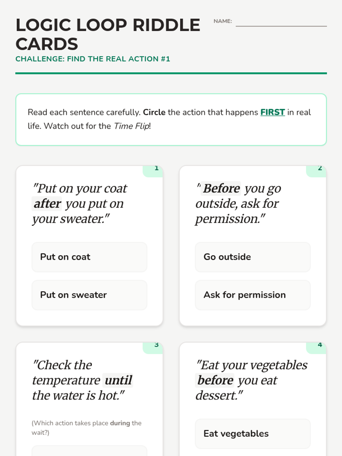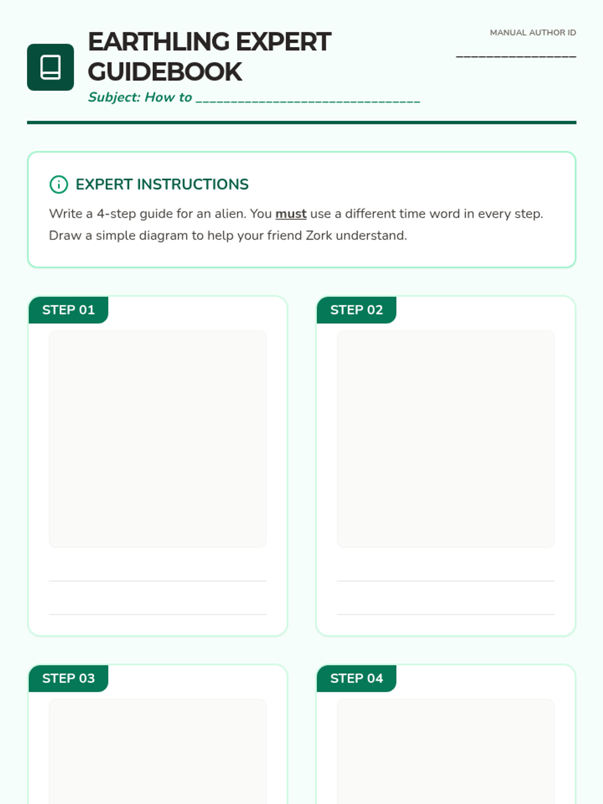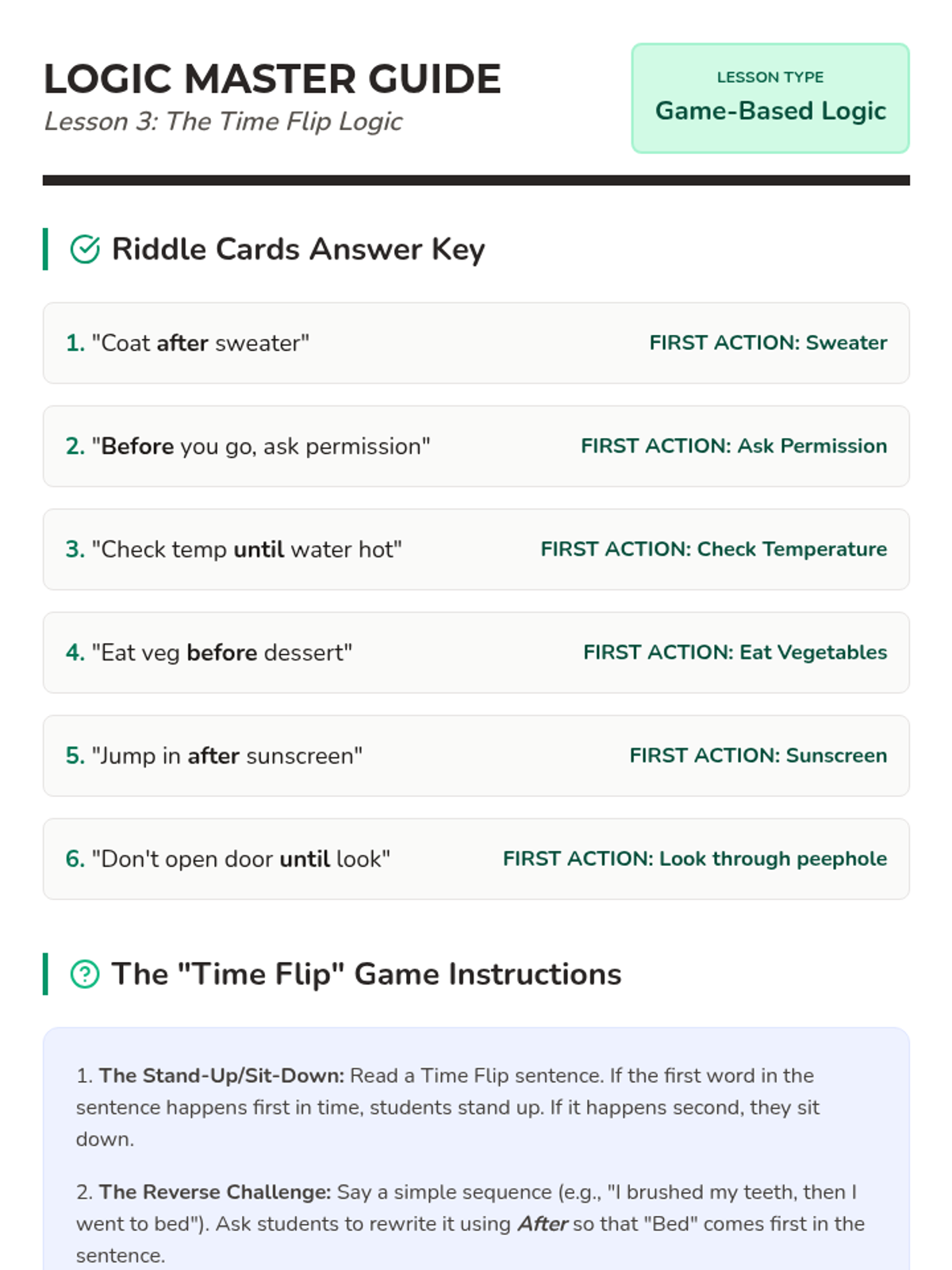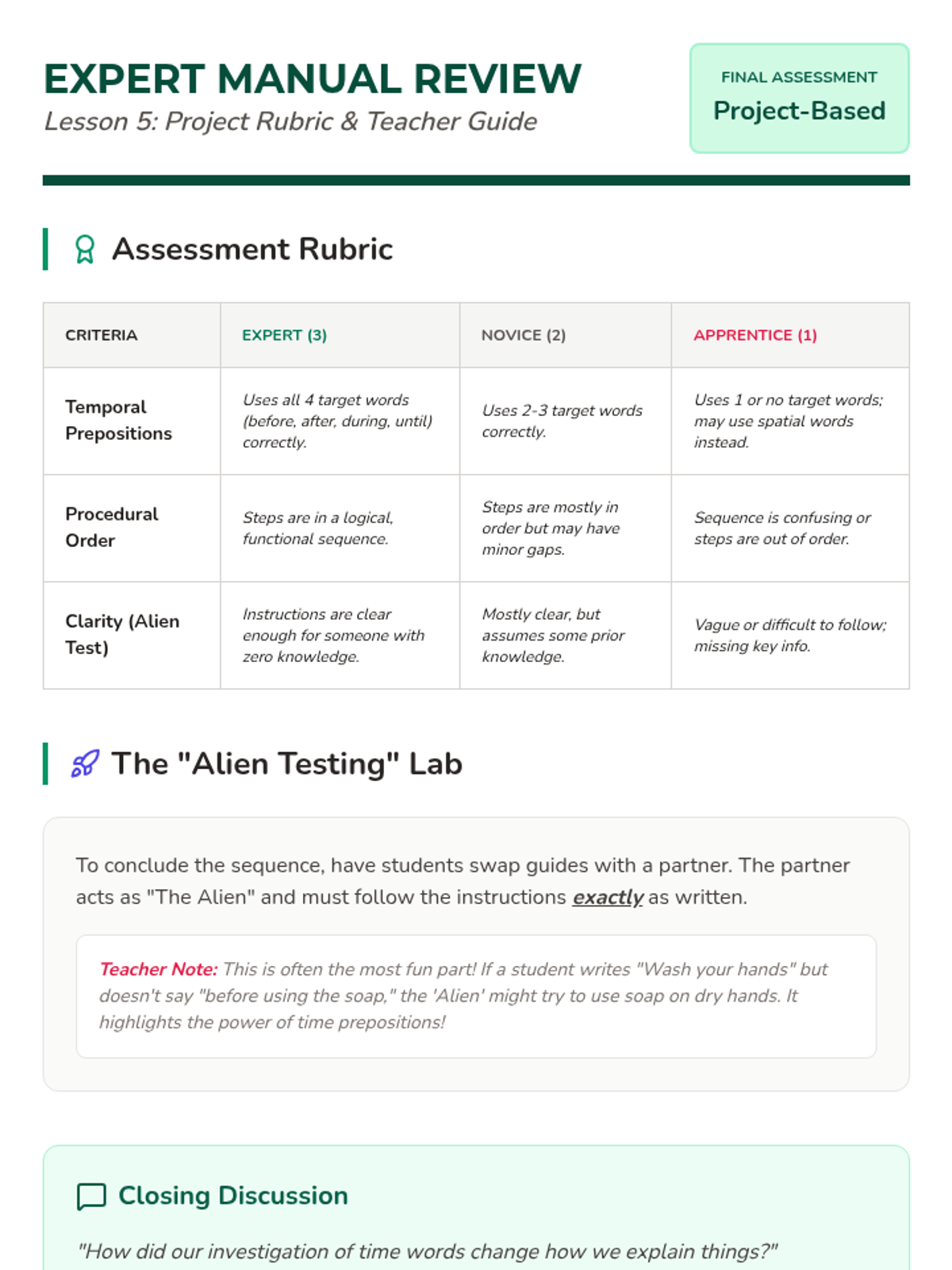 A 5-lesson series for 2nd graders focusing on temporal prepositions (before, after, during, until) and their role in sequencing events, narrative structure, and procedural writing. Students transition from identifying time words in recipes to creating timelines and writing their own 'how-to' guides.