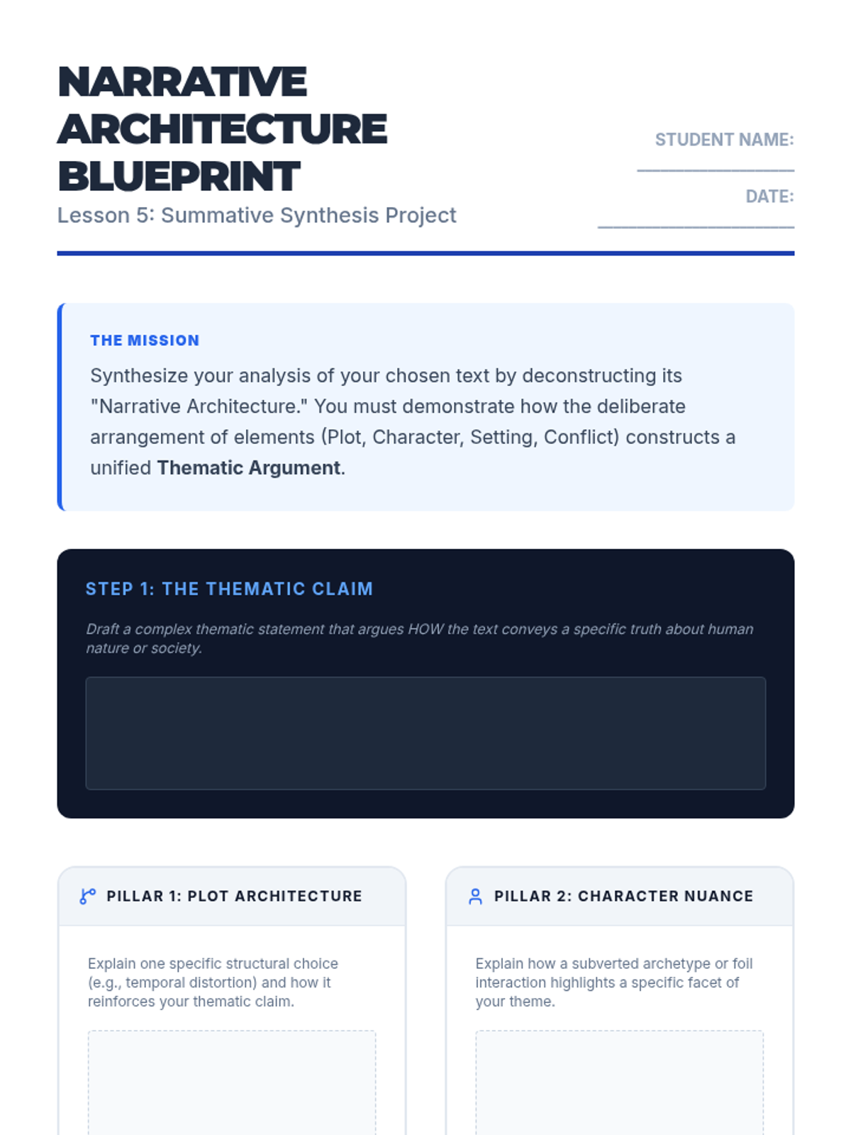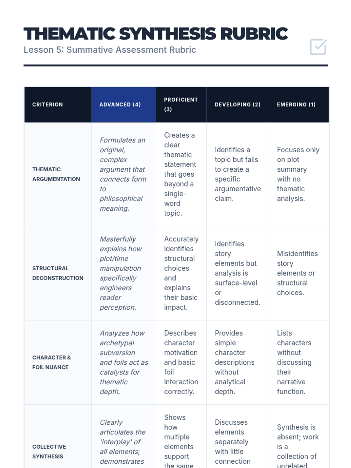 A high-level literary analysis sequence for 12th-grade students focusing on how authors manipulate plot, character, setting, and conflict to construct complex thematic resonance. Students transition from identifying elements to deconstructing narrative architecture in short fiction.