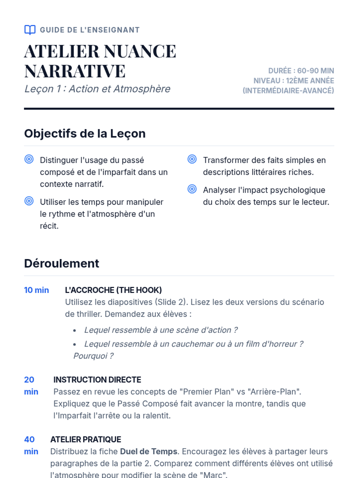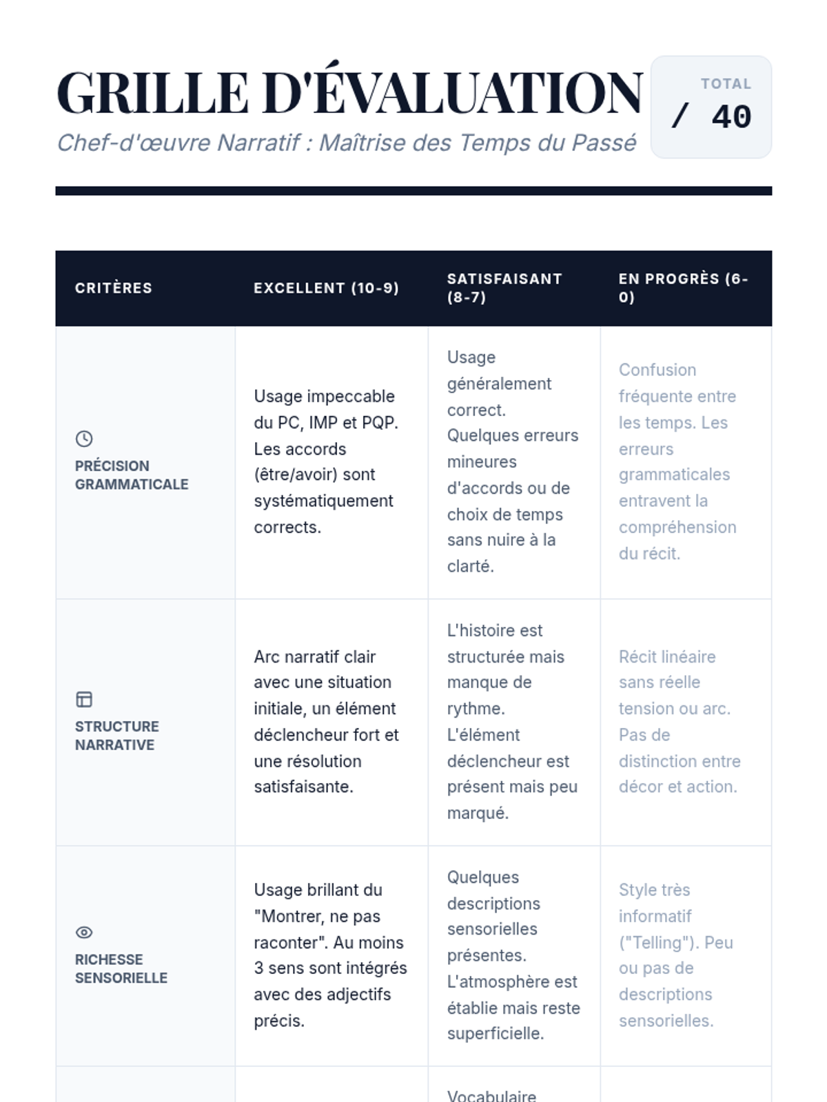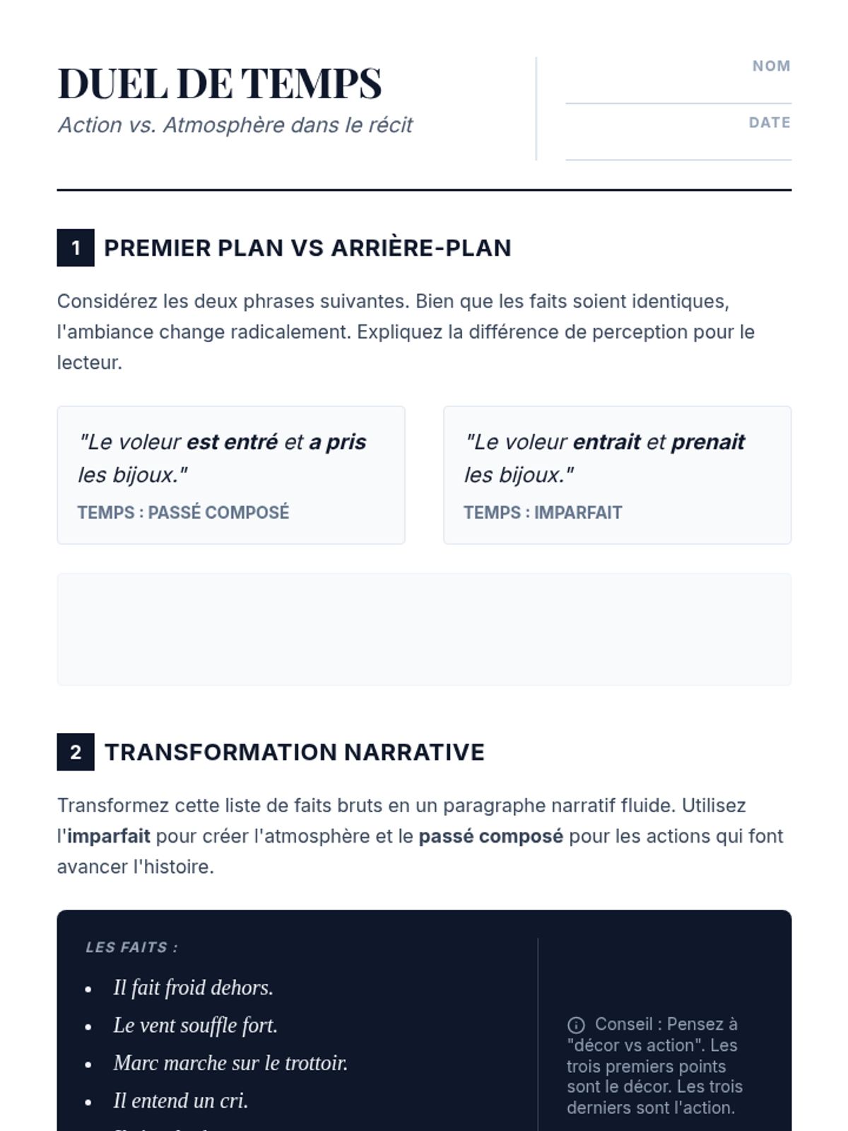 A comprehensive workshop-style sequence for advanced French students focusing on the mastery of past tenses (Pass\u00e9 Compos\u00e9, Imparfait, and Plus-que-parfait) to craft complex narrative arcs and atmospheric storytelling.