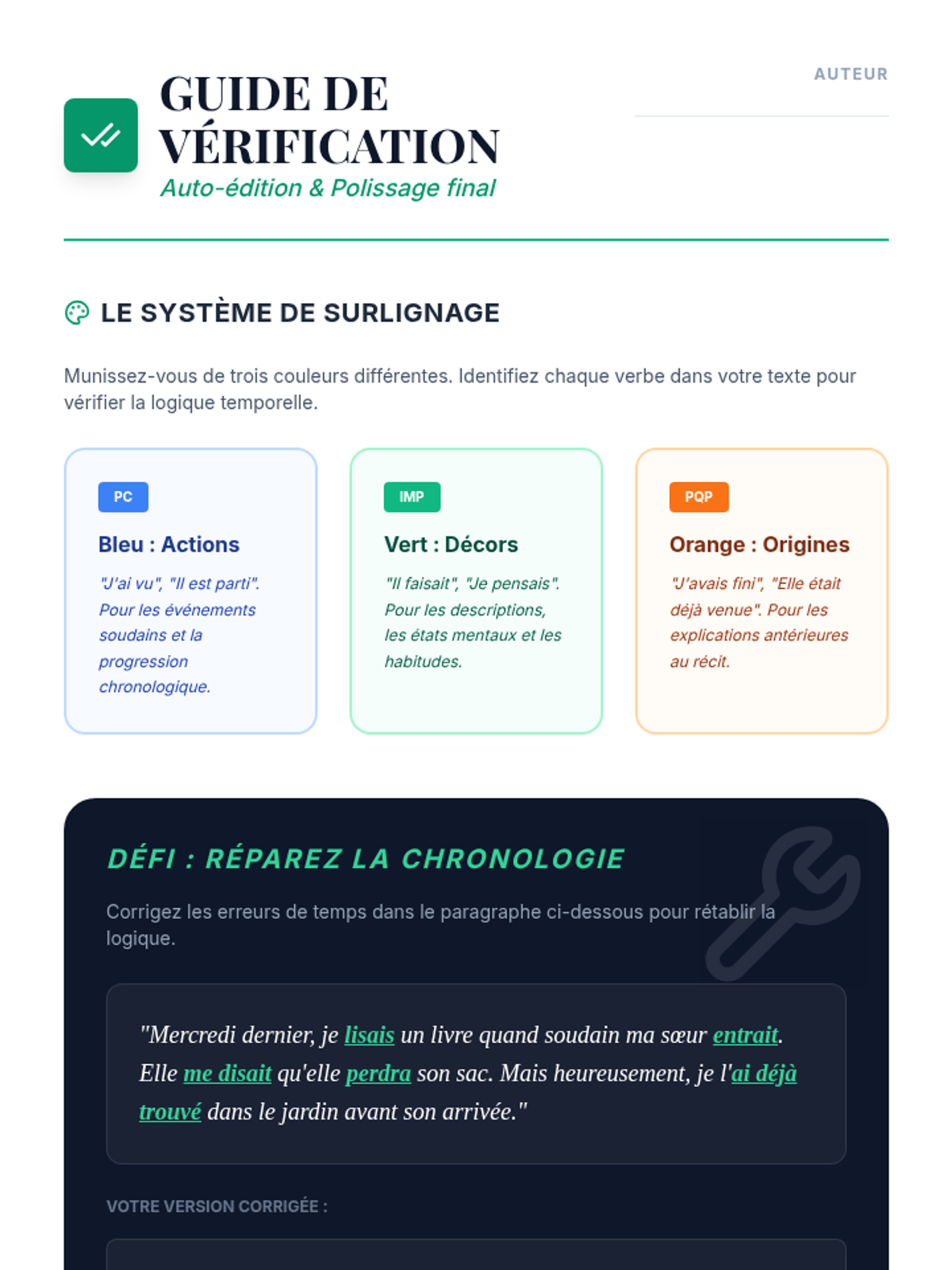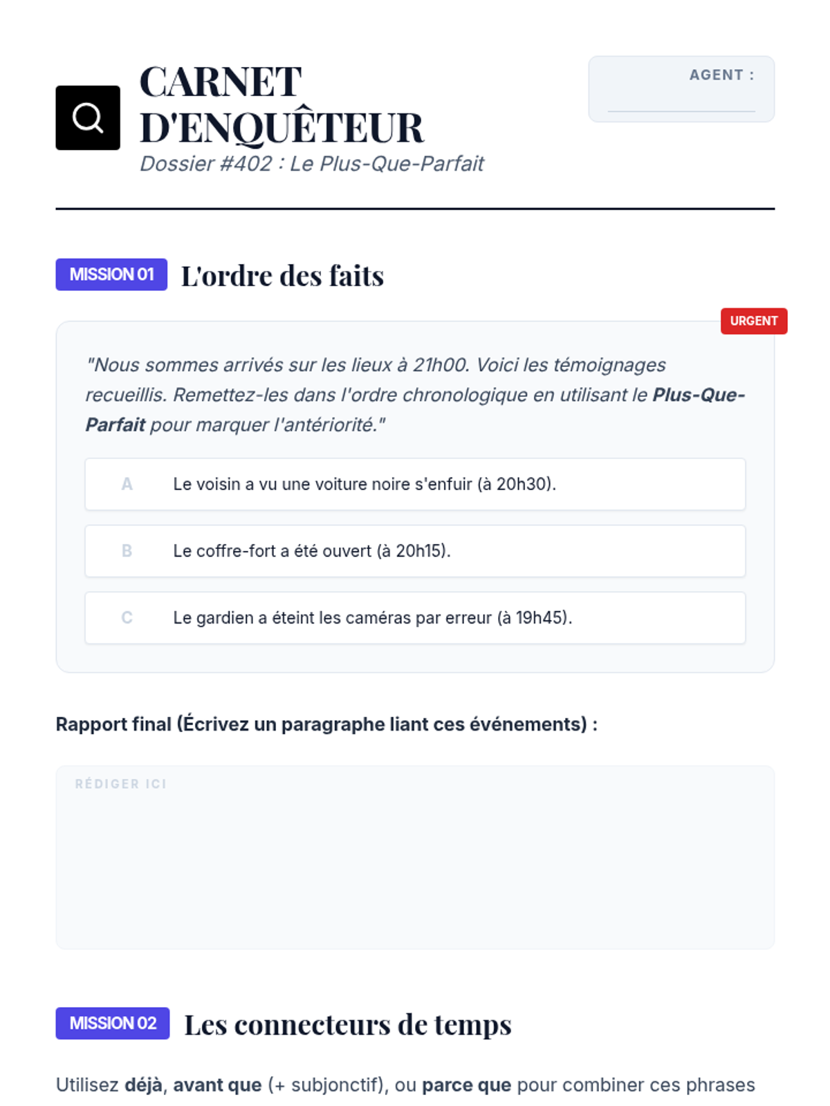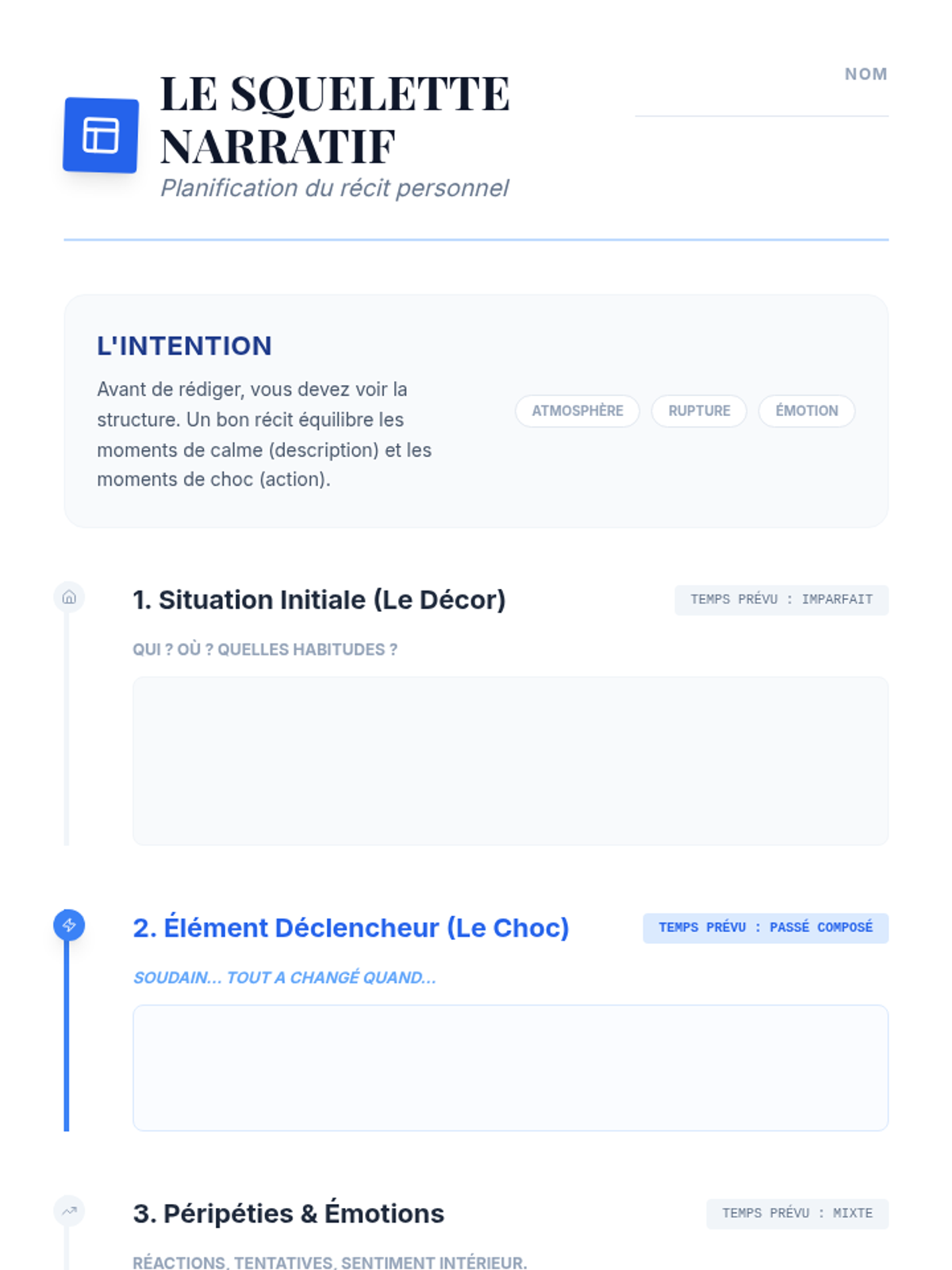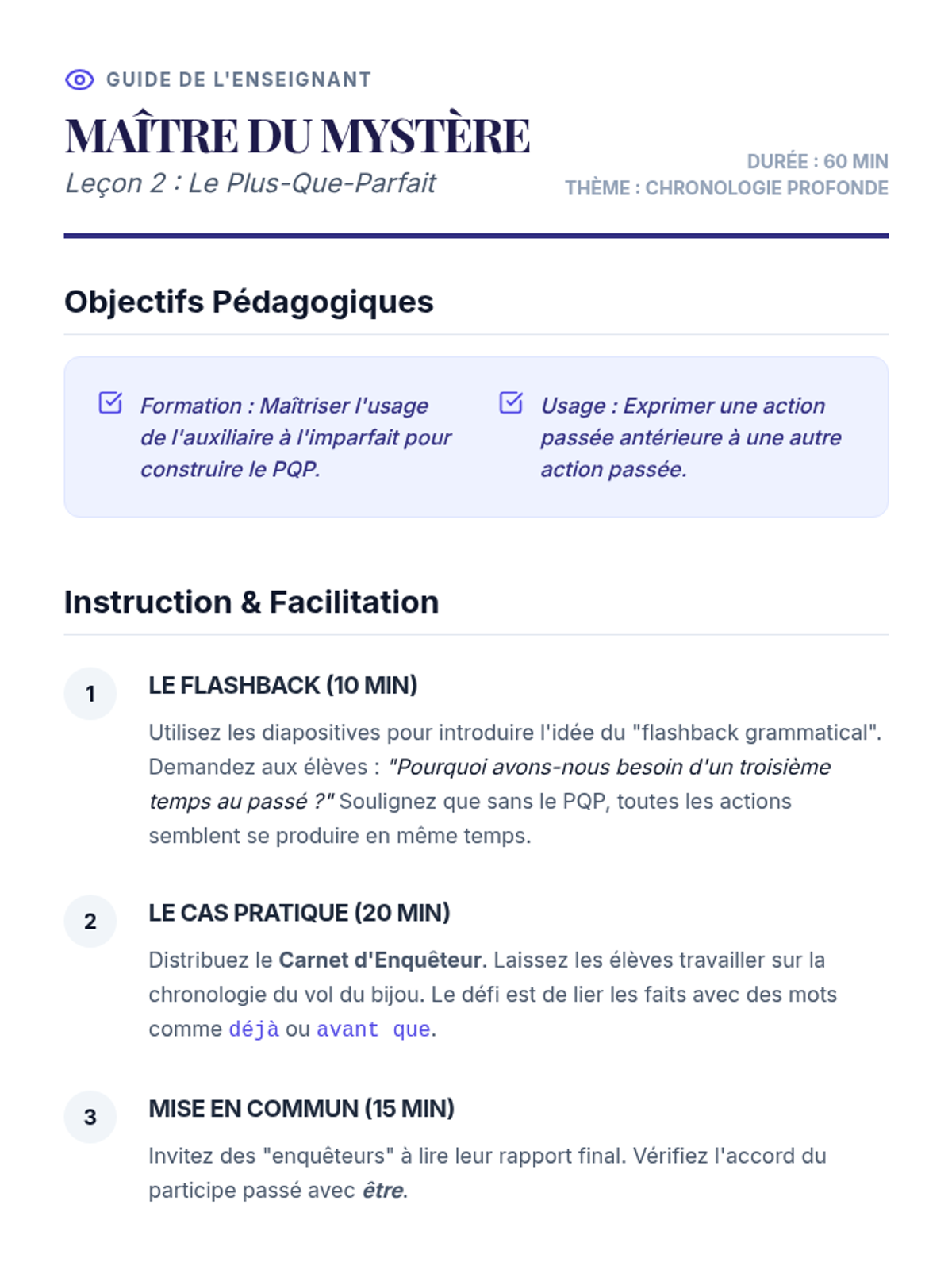 A comprehensive workshop-style sequence for advanced French students focusing on the mastery of past tenses (Pass\u00e9 Compos\u00e9, Imparfait, and Plus-que-parfait) to craft complex narrative arcs and atmospheric storytelling.
