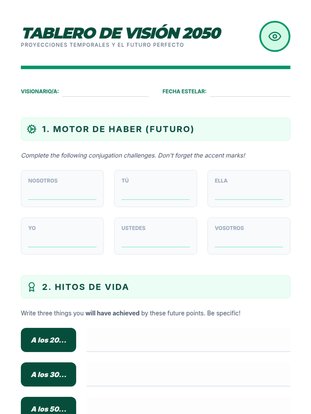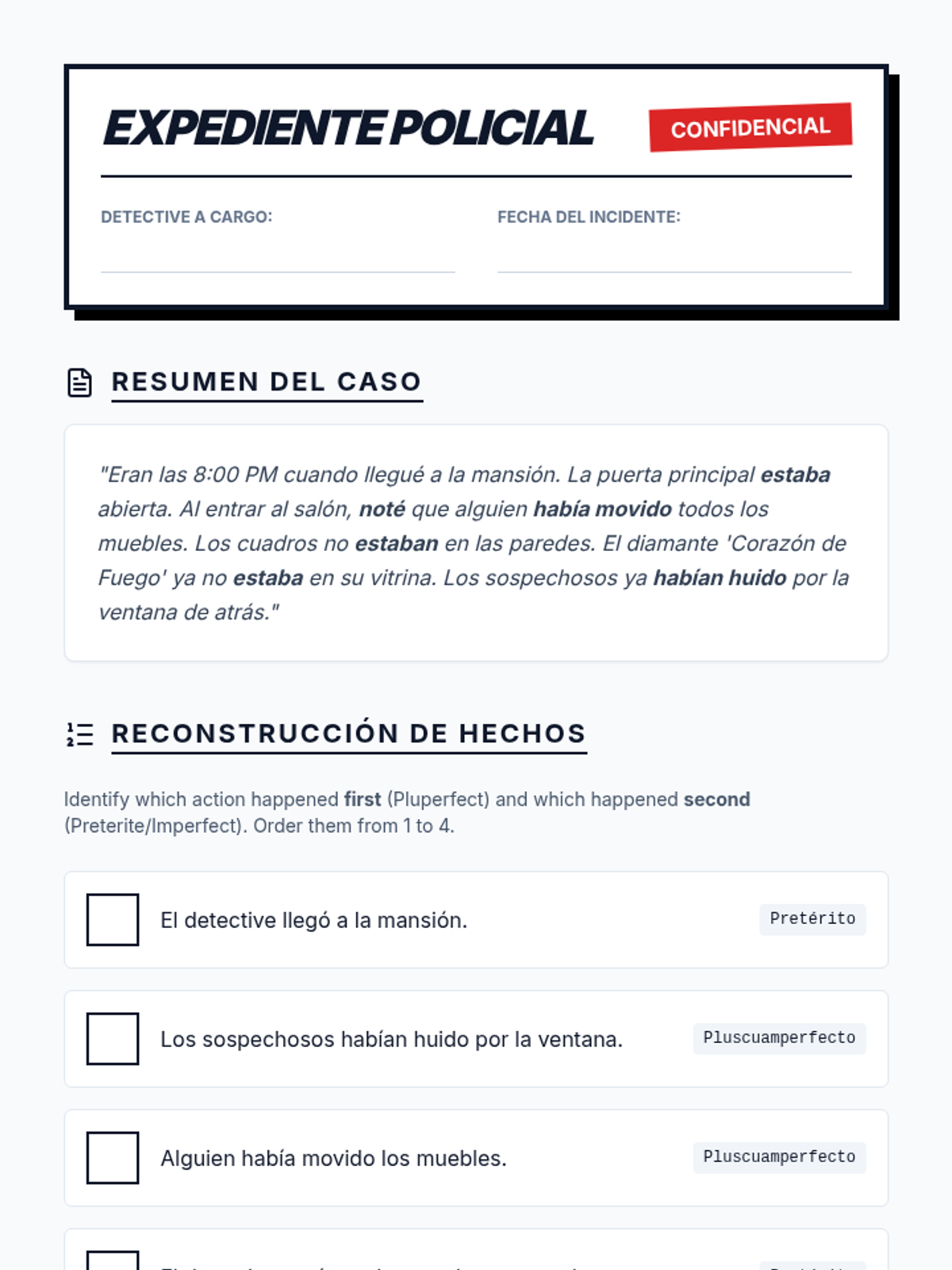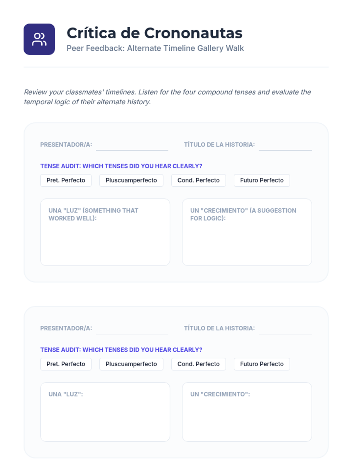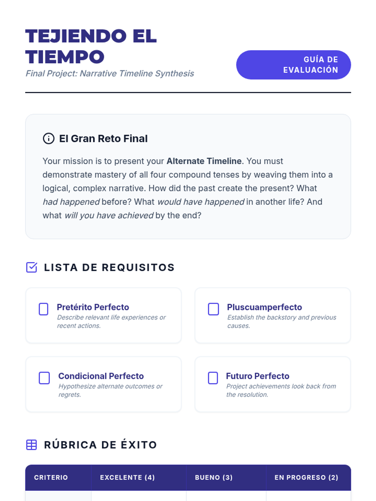 This project-based workshop guides advanced Spanish students through compound tenses by constructing a multi-layered narrative. Students master the present perfect, pluperfect, conditional perfect, and future perfect to articulate complex temporal relationships.