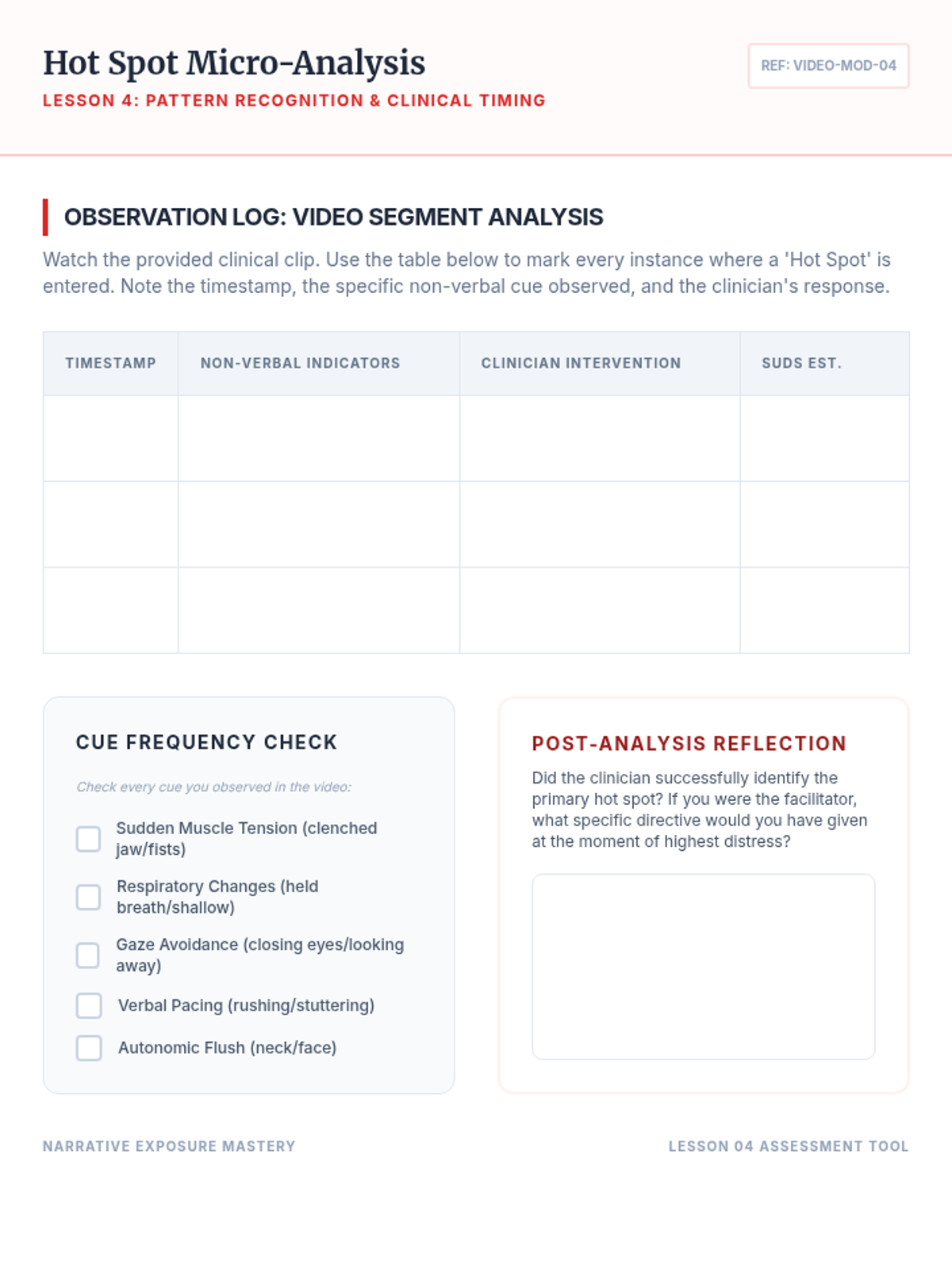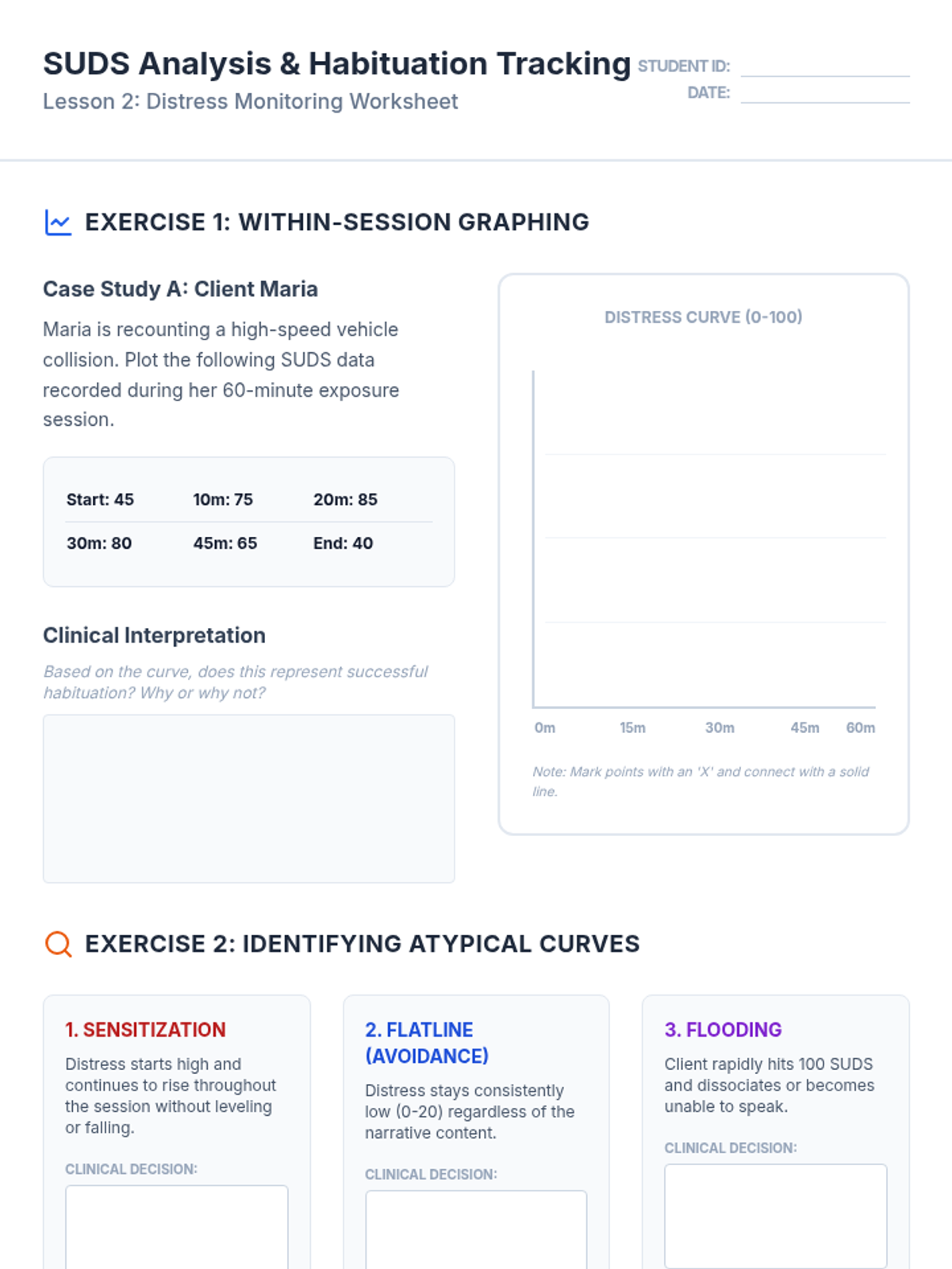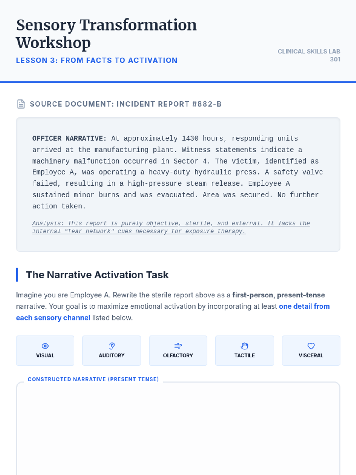 A graduate-level sequence focused on the clinical mechanics of imaginal exposure and trauma narrative construction. Students learn to facilitate the drafting process, monitor subjective distress, integrate sensory details, identify 'hot spots,' and manage client avoidance behaviors to ensure therapeutic habituation.