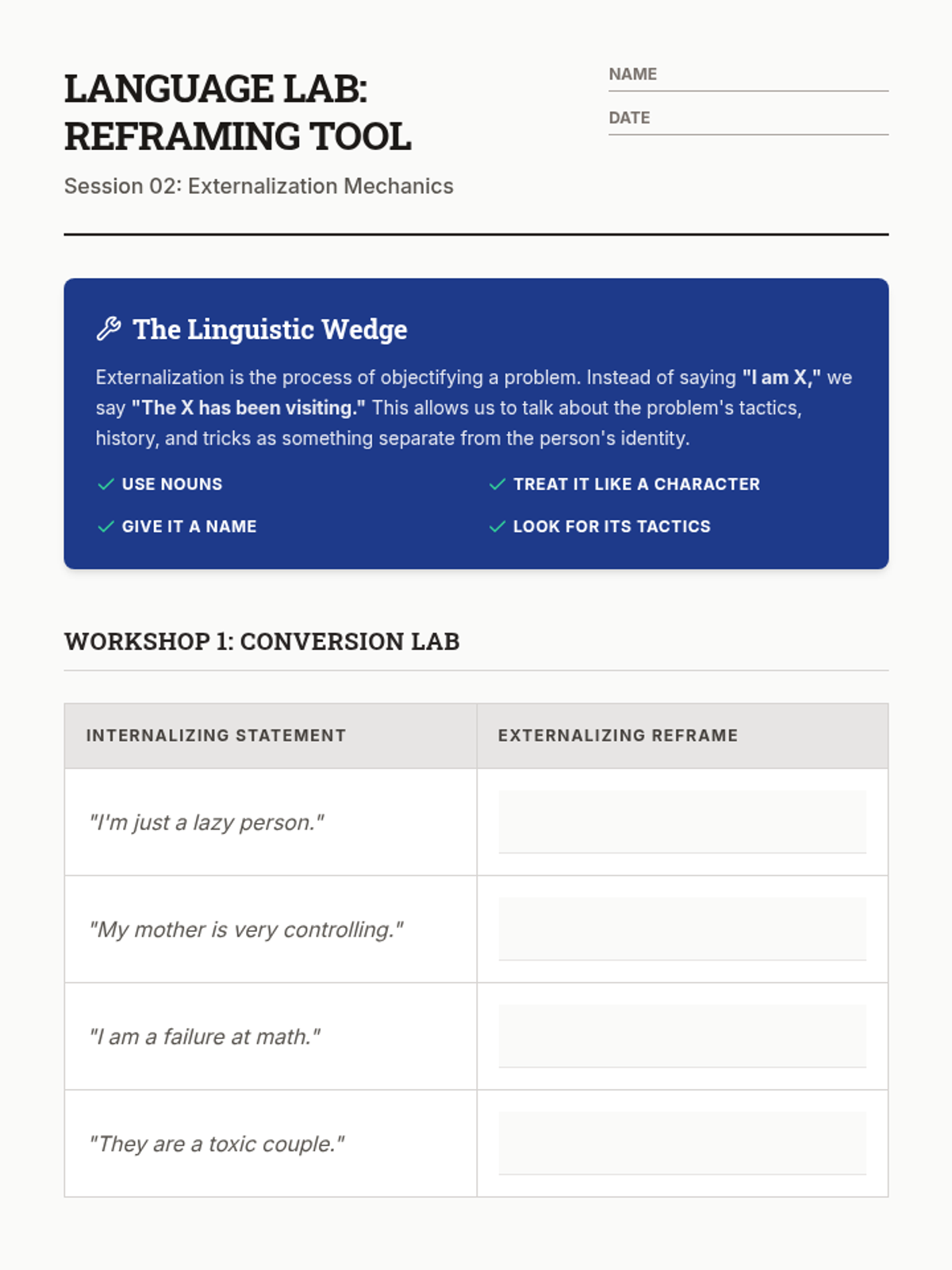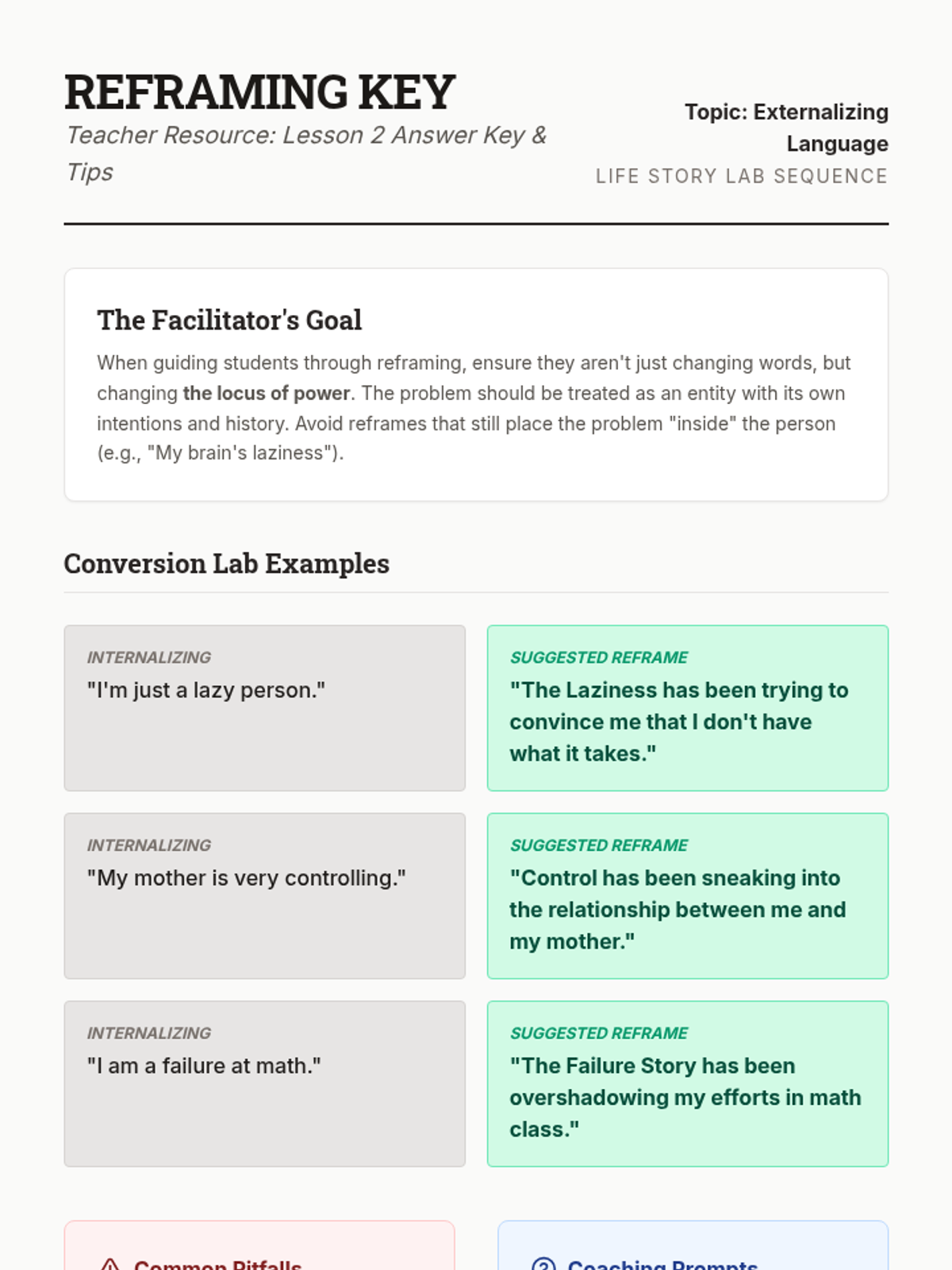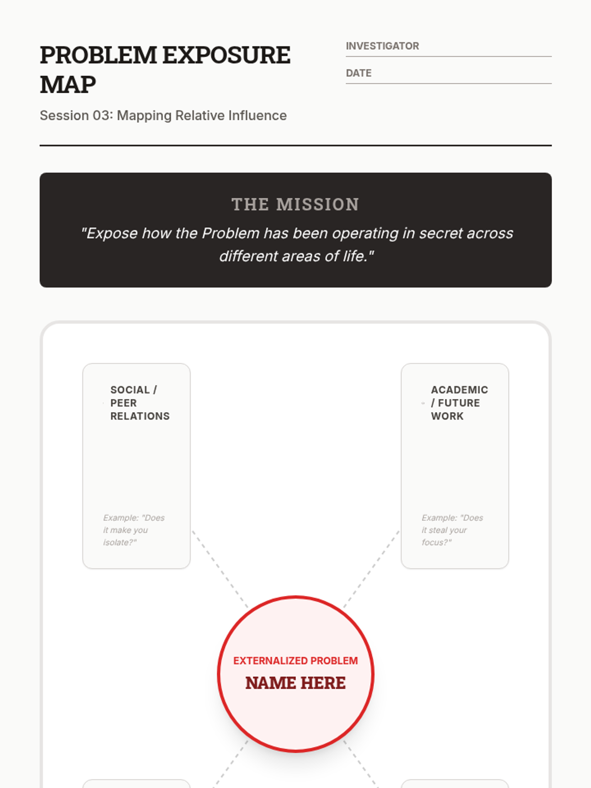 This sequence introduces 12th-grade students to Narrative Therapy, focusing on externalization. Students learn to separate people from their problems through linguistic reframing, mapping problem influences, and identifying 'unique outcomes' to build agency and new life stories.