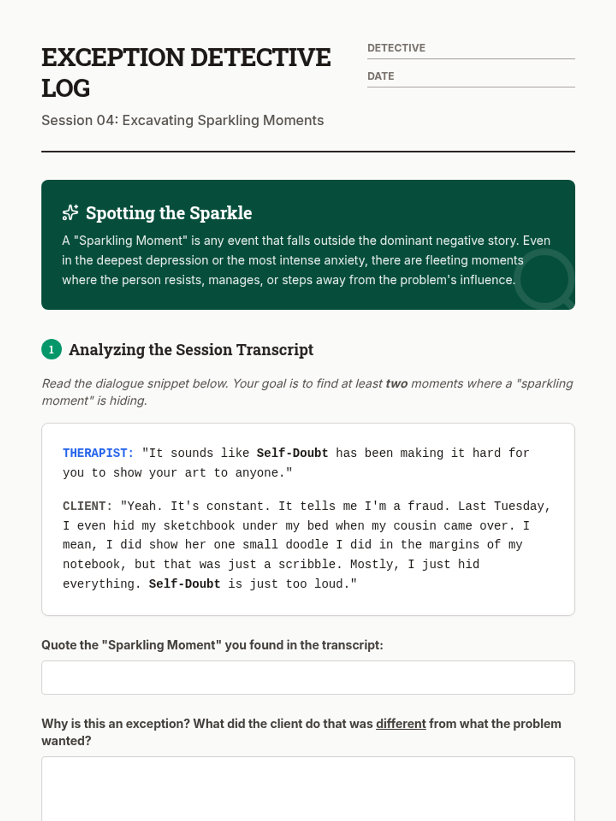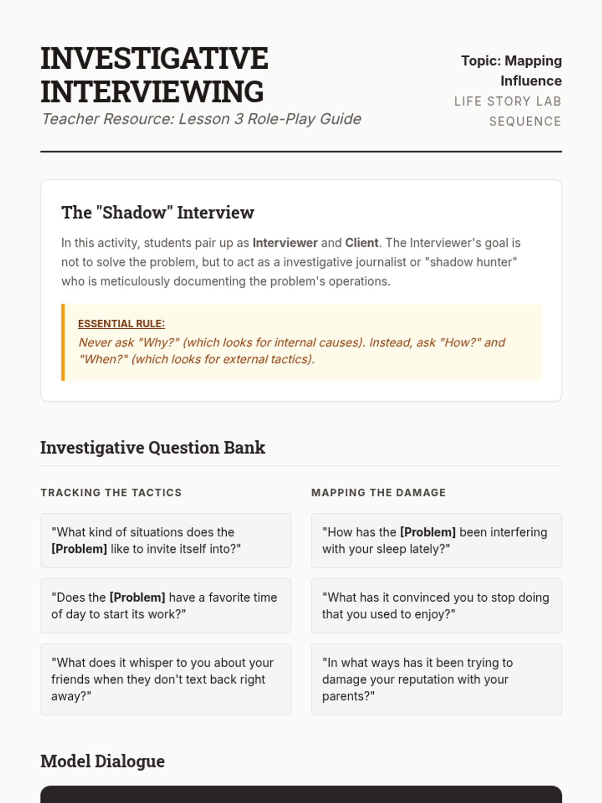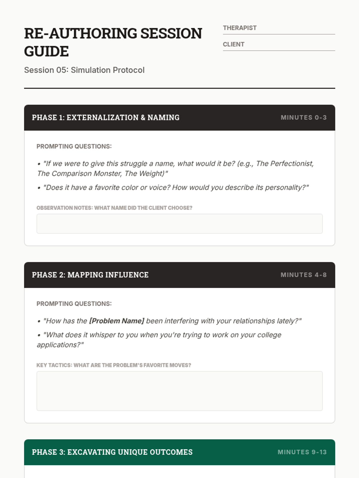 This sequence introduces 12th-grade students to Narrative Therapy, focusing on externalization. Students learn to separate people from their problems through linguistic reframing, mapping problem influences, and identifying 'unique outcomes' to build agency and new life stories.