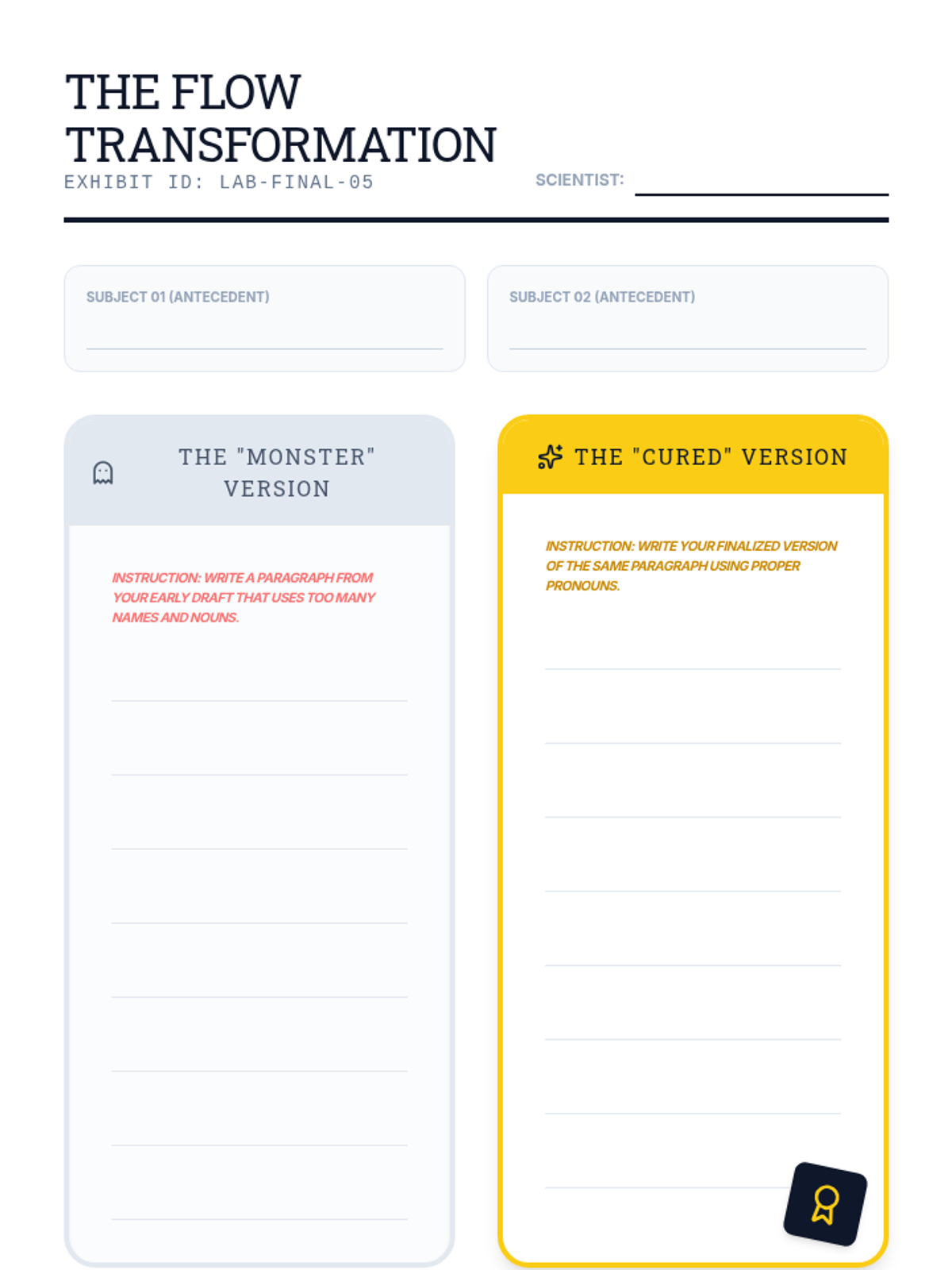 Students explore pronouns and antecedents as stylistic tools to improve narrative flow. They learn to replace repetitive nouns, manage multiple characters with clear pronoun references, and culminate in a polished character-driven story.