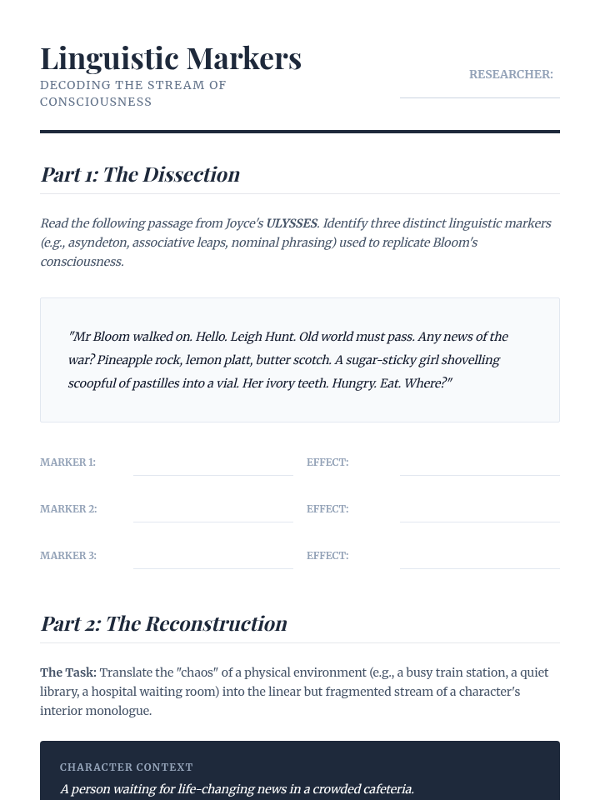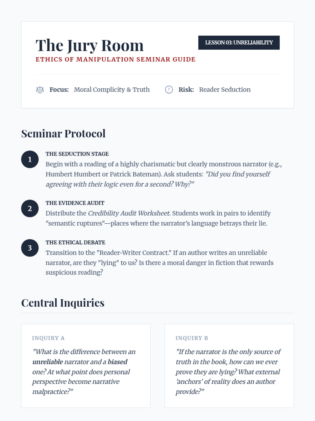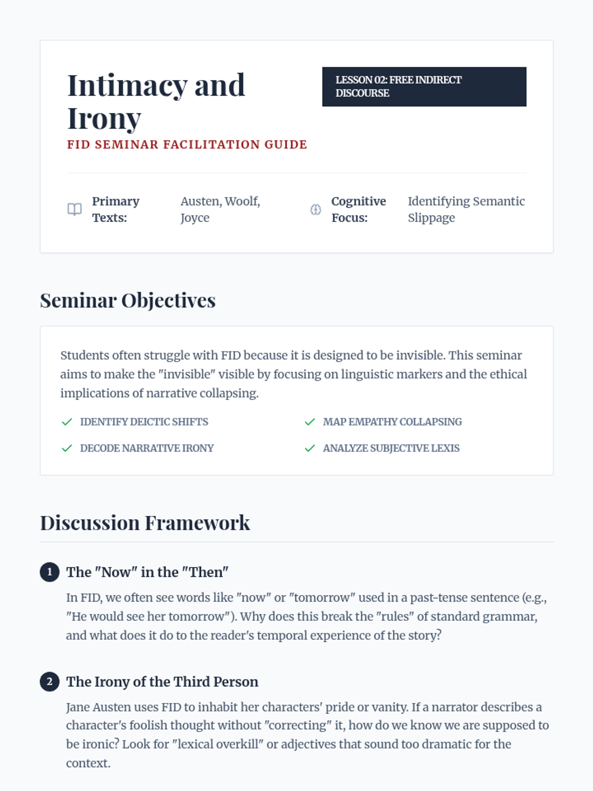 An undergraduate-level exploration of narratology, focusing on the mechanics of focalization, free indirect discourse, and the ethical implications of narrative voice. Students move beyond basic plot analysis to examine how the construction of consciousness on the page shapes reader perception and morality.