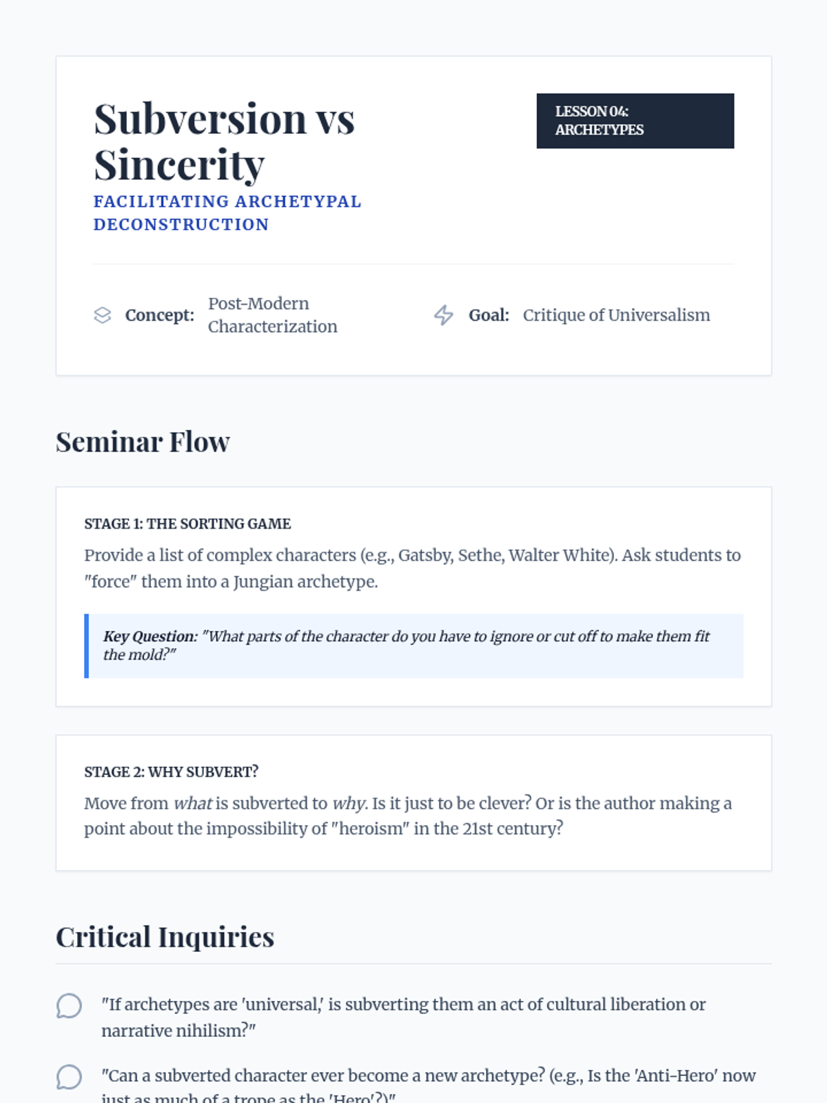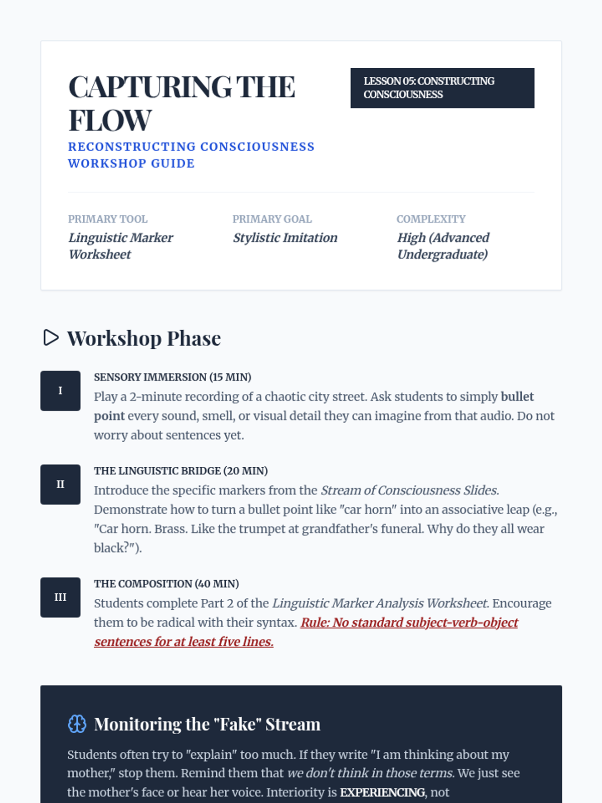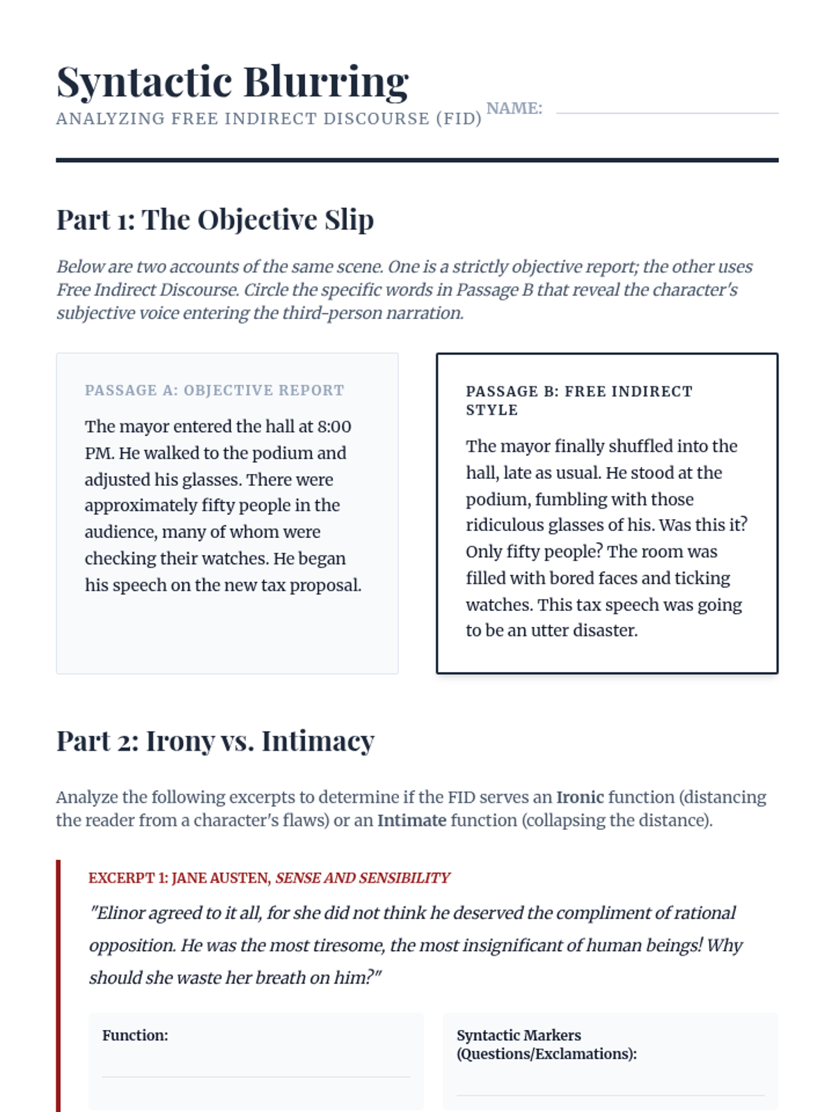 An undergraduate-level exploration of narratology, focusing on the mechanics of focalization, free indirect discourse, and the ethical implications of narrative voice. Students move beyond basic plot analysis to examine how the construction of consciousness on the page shapes reader perception and morality.