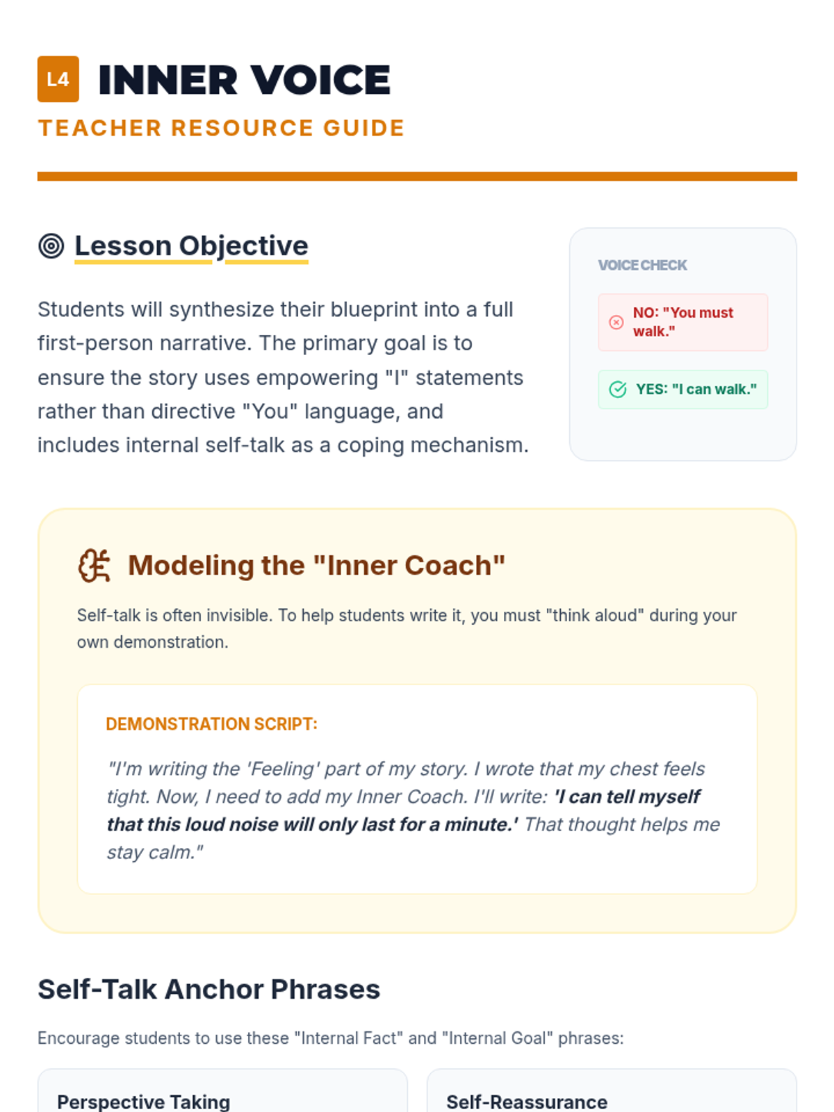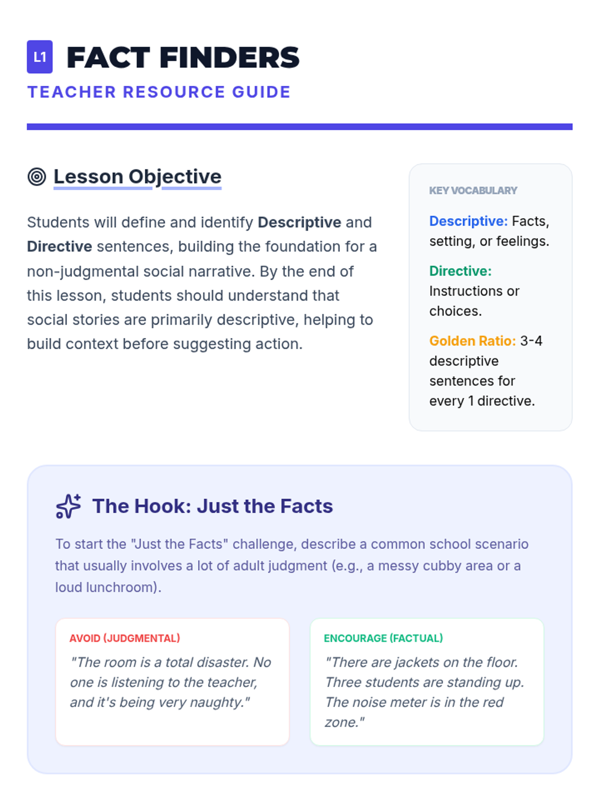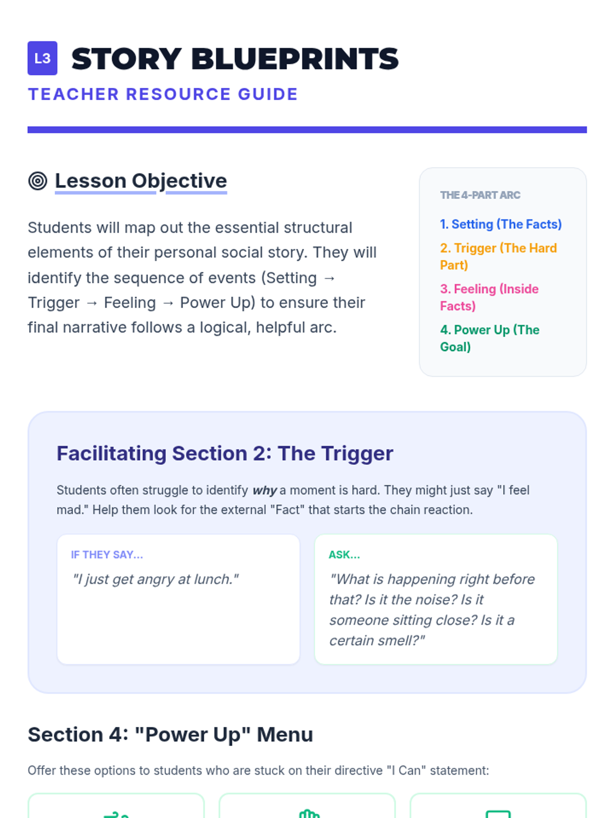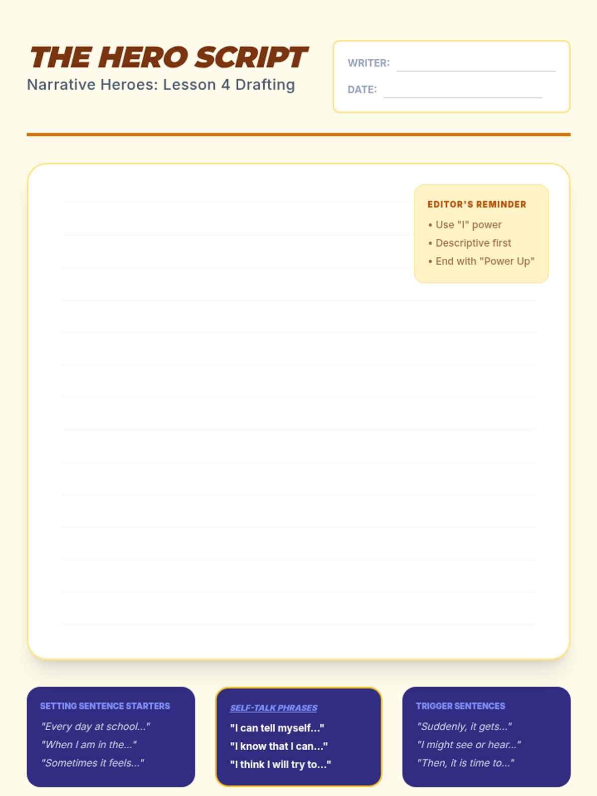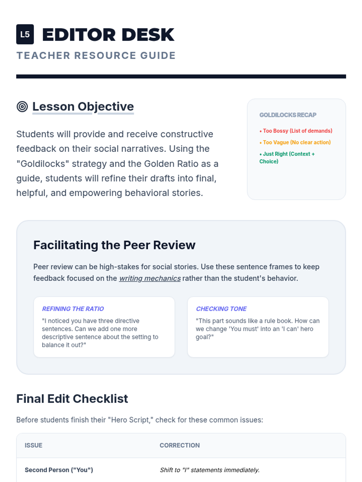 A 5-lesson sequence for 4th-grade students focused on the writing mechanics of personal social narratives. Students progress from distinguishing sentence types to drafting a complete, positively-framed behavioral story using first-person perspective and self-talk strategies.