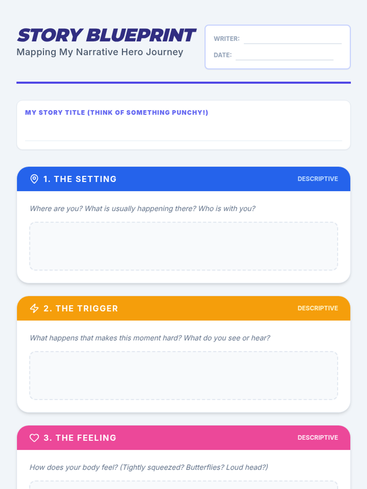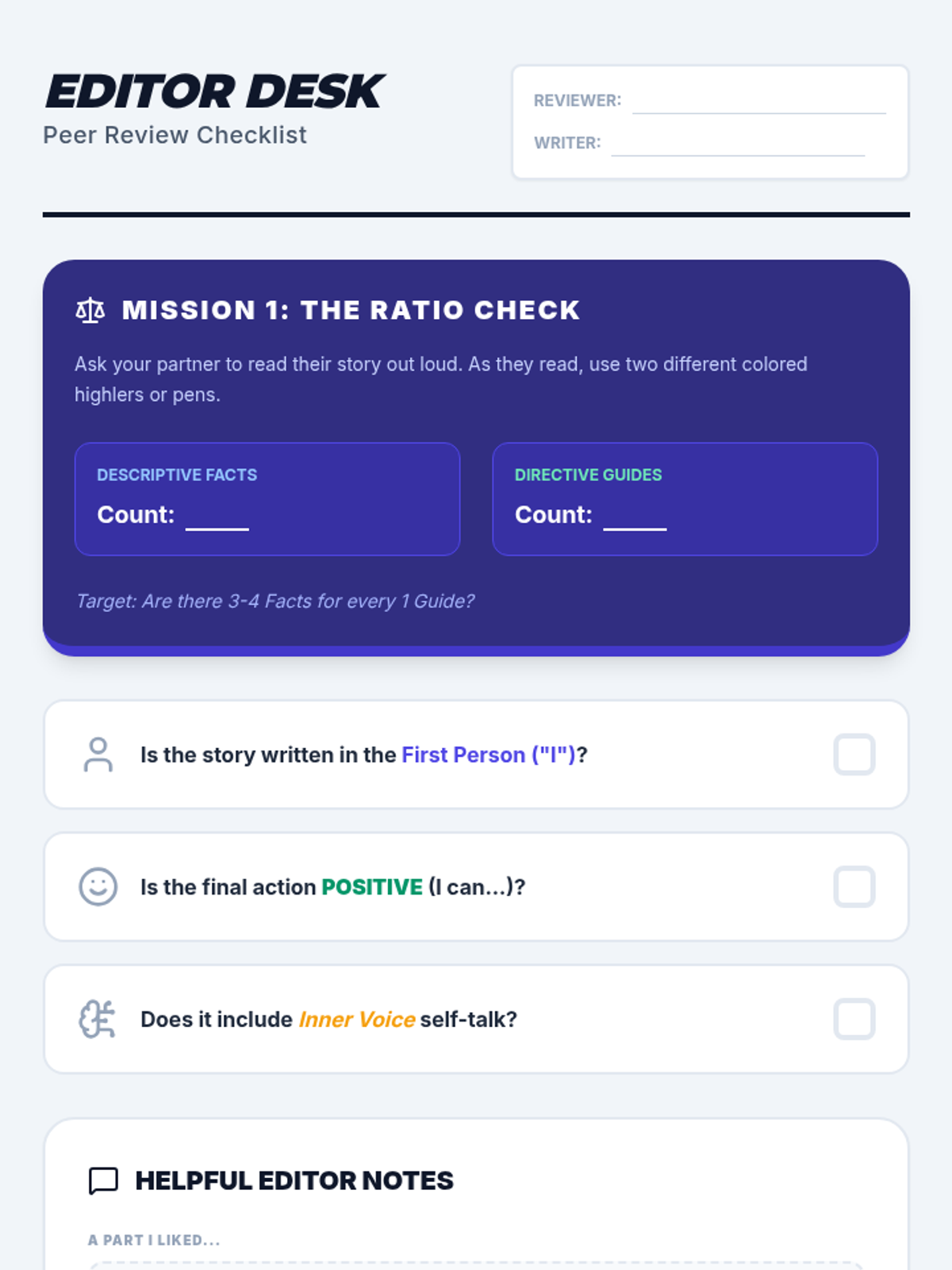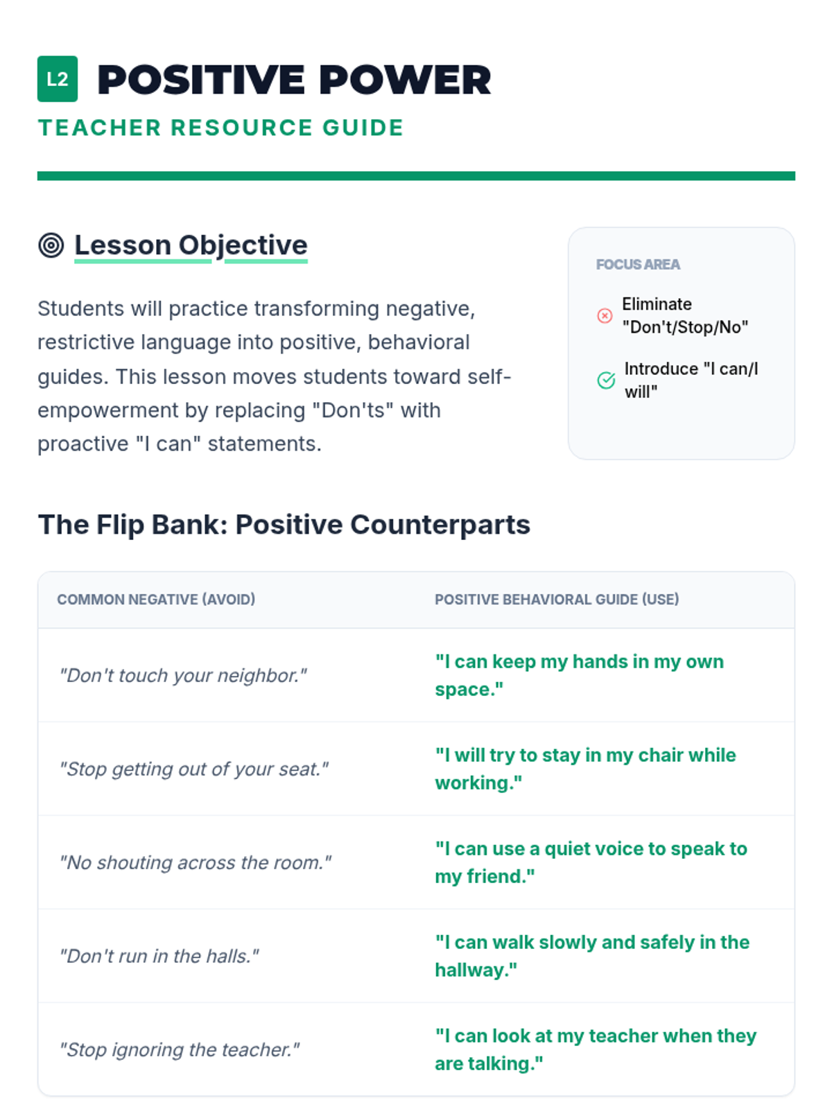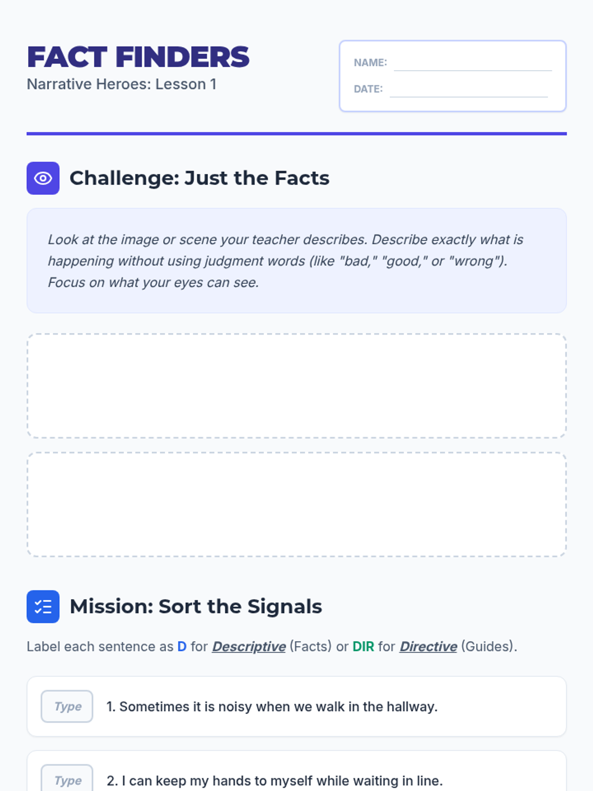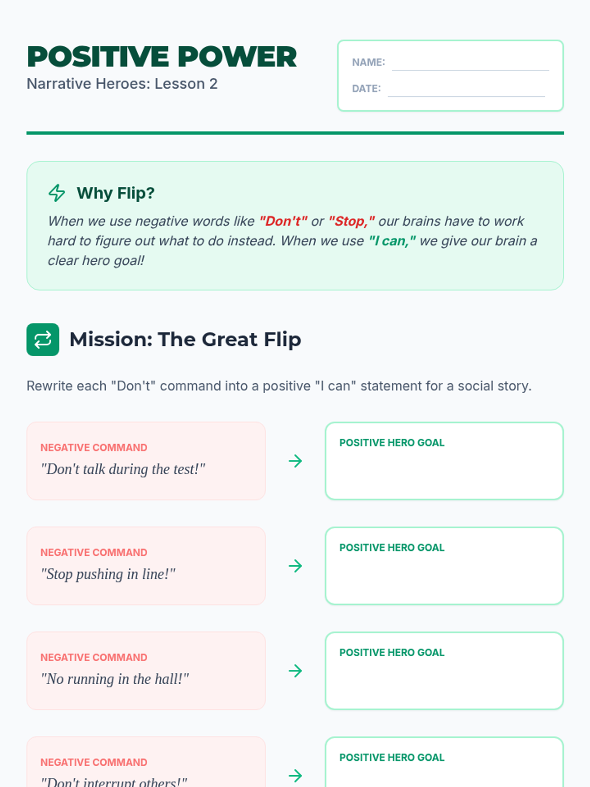A 5-lesson sequence for 4th-grade students focused on the writing mechanics of personal social narratives. Students progress from distinguishing sentence types to drafting a complete, positively-framed behavioral story using first-person perspective and self-talk strategies.