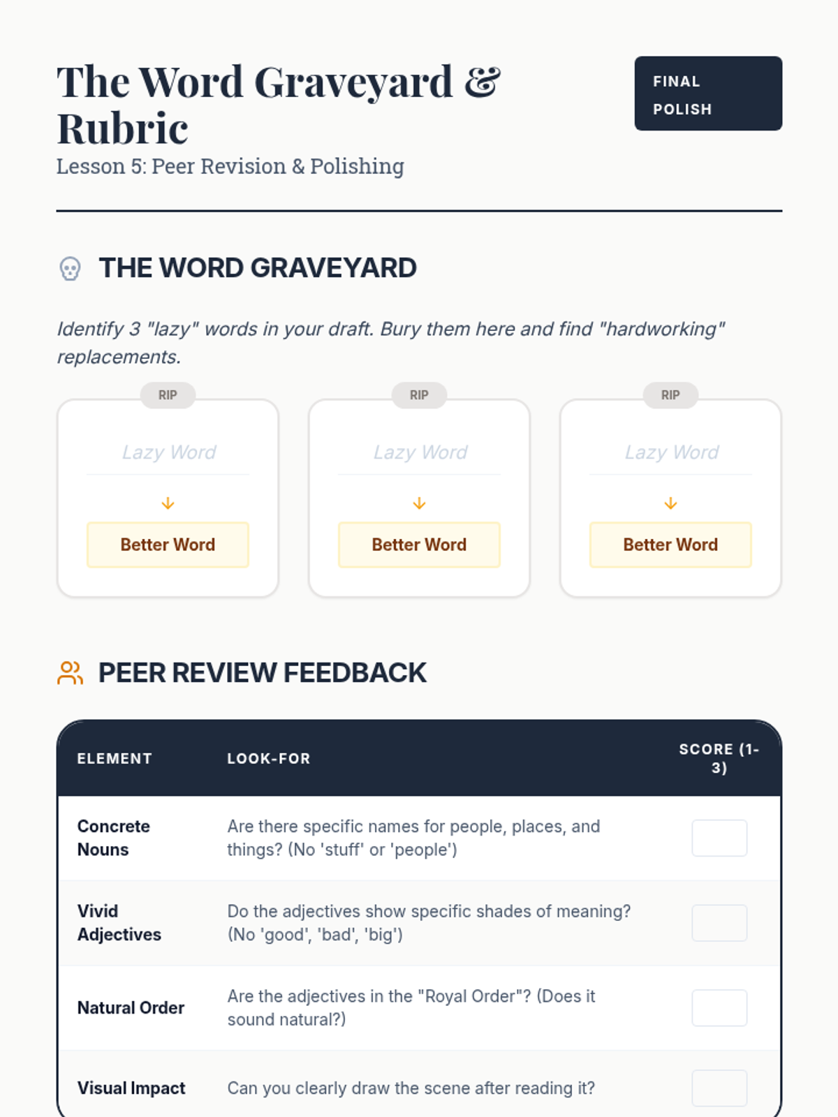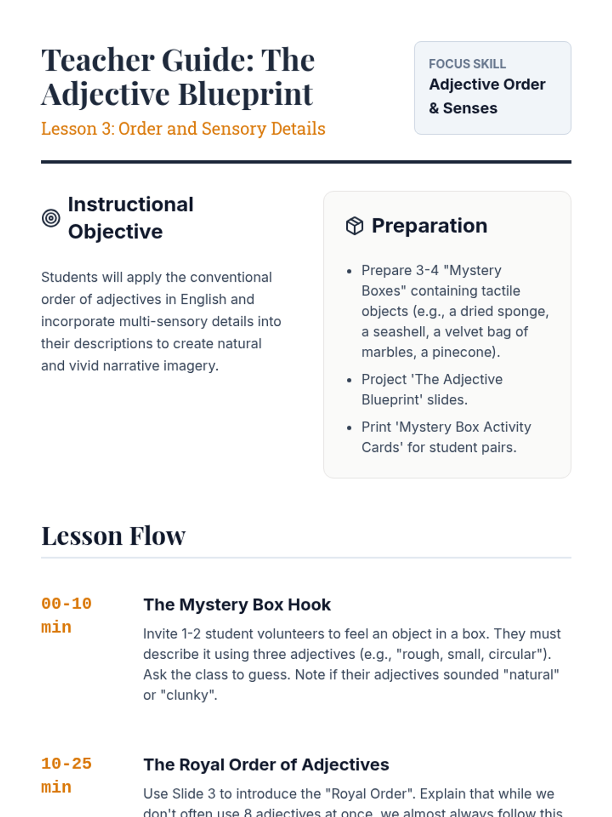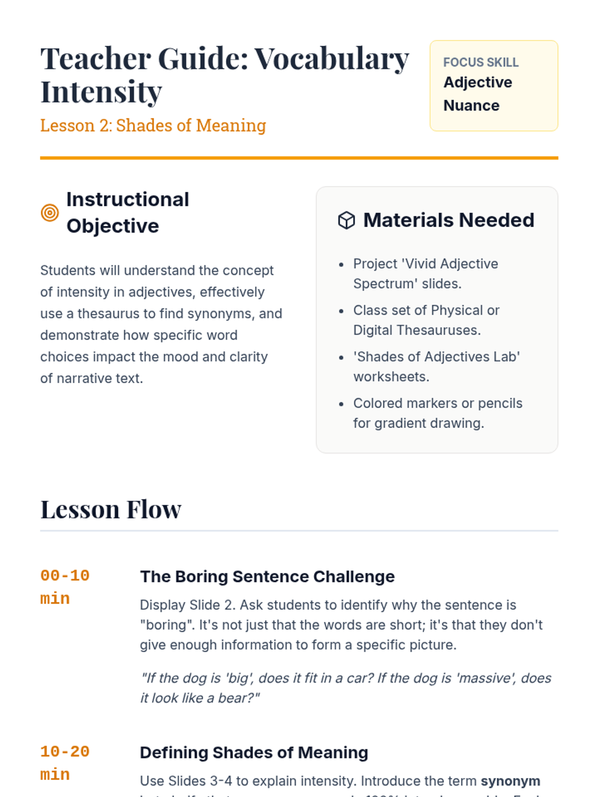 This writing workshop sequence moves students beyond basic identification of nouns and adjectives toward strategic application in narrative writing. Students practice replacing general nouns with concrete alternatives and weak adjectives with vivid modifiers to enhance reader visualization.