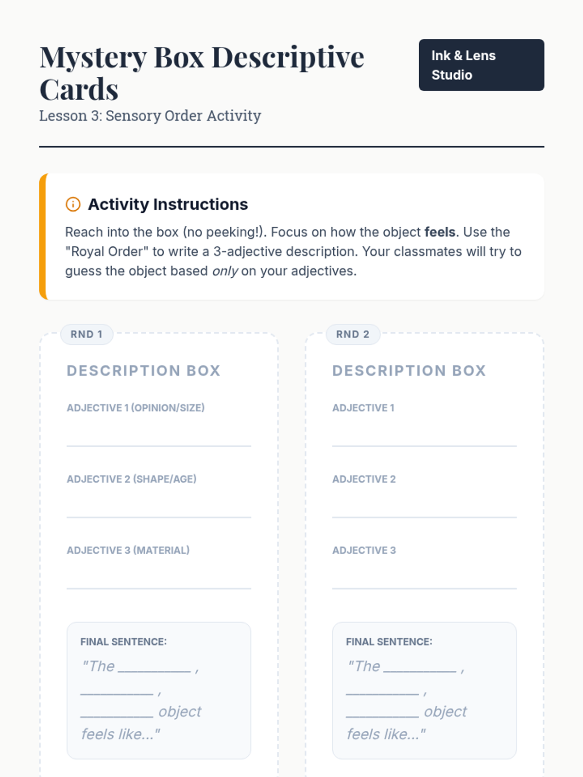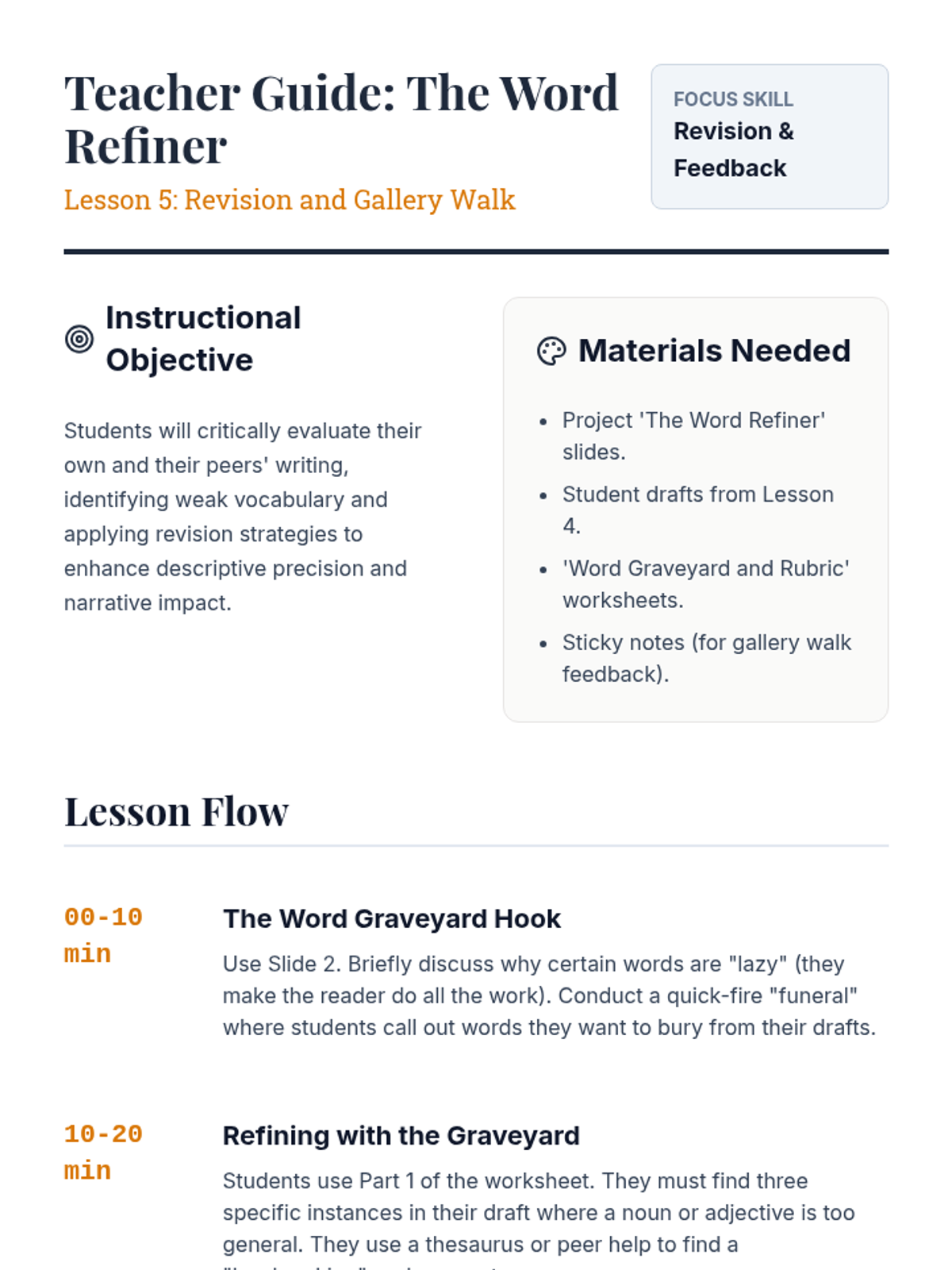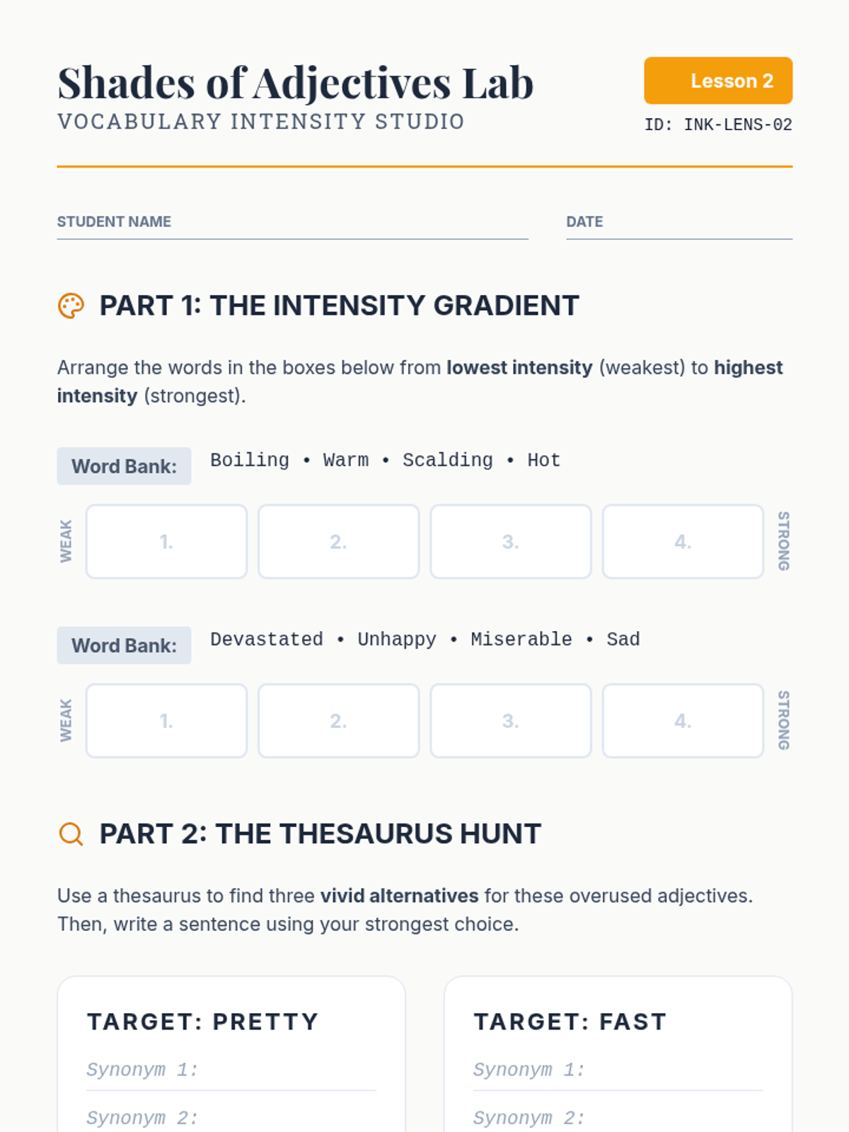 This writing workshop sequence moves students beyond basic identification of nouns and adjectives toward strategic application in narrative writing. Students practice replacing general nouns with concrete alternatives and weak adjectives with vivid modifiers to enhance reader visualization.