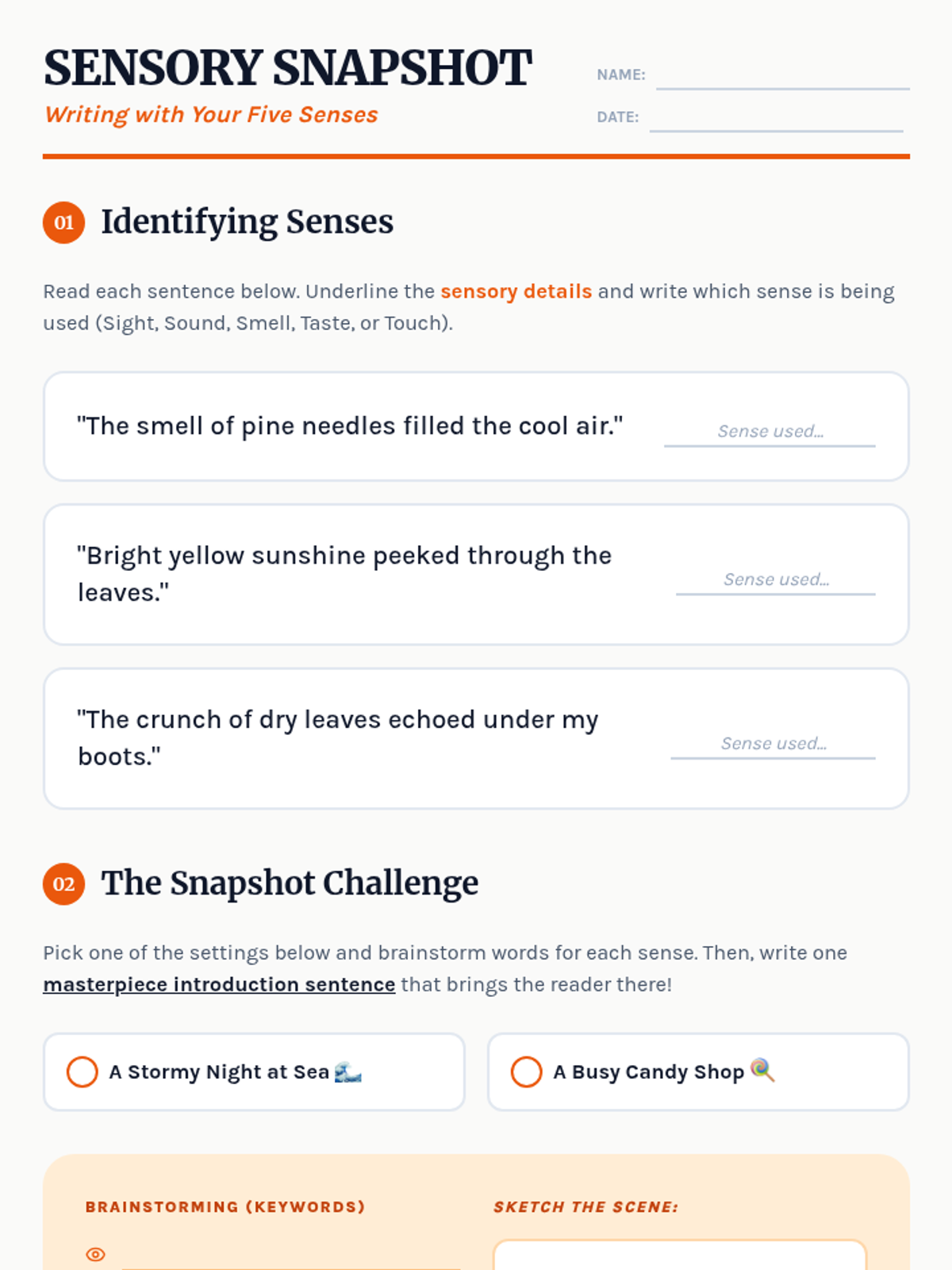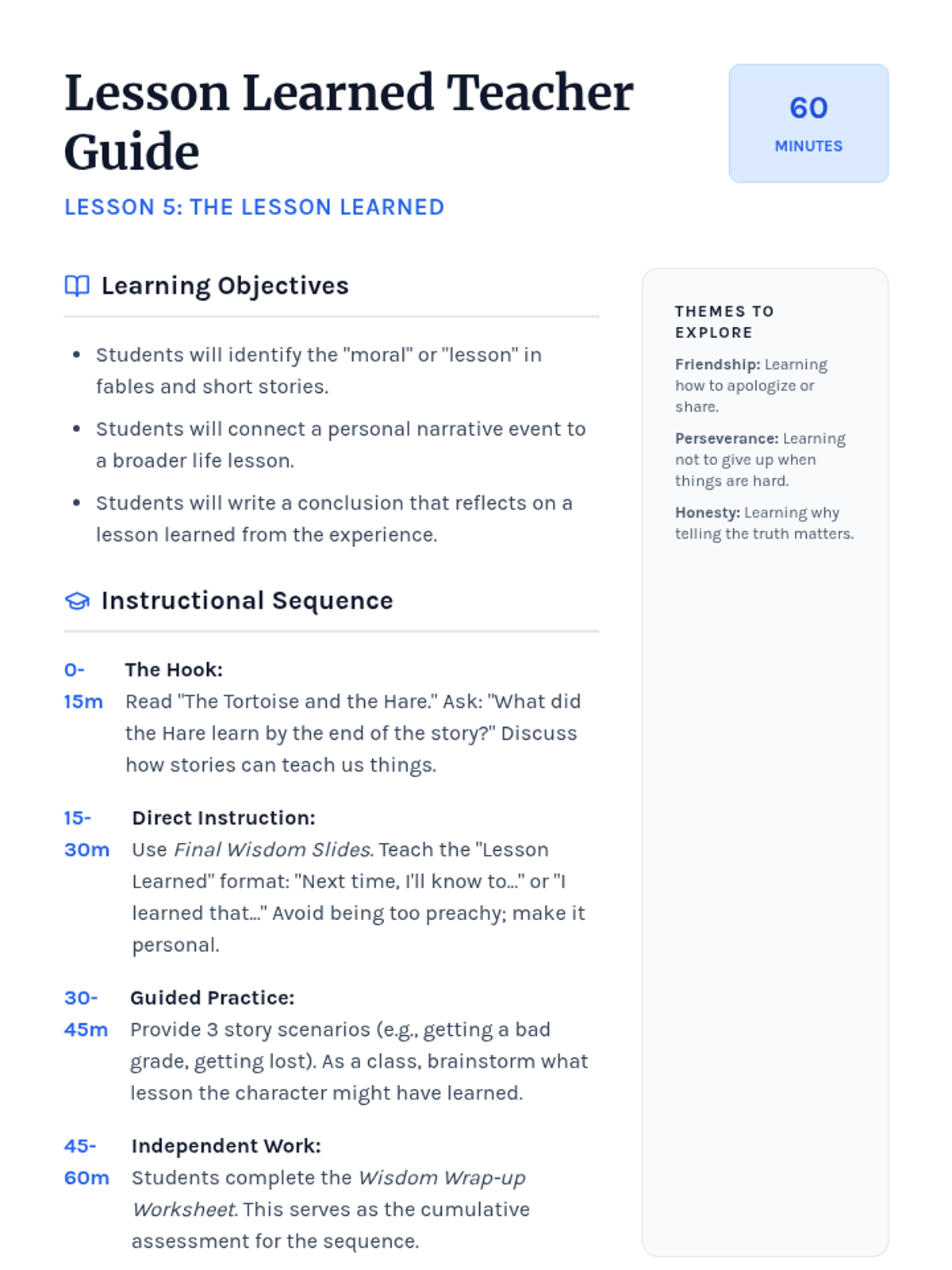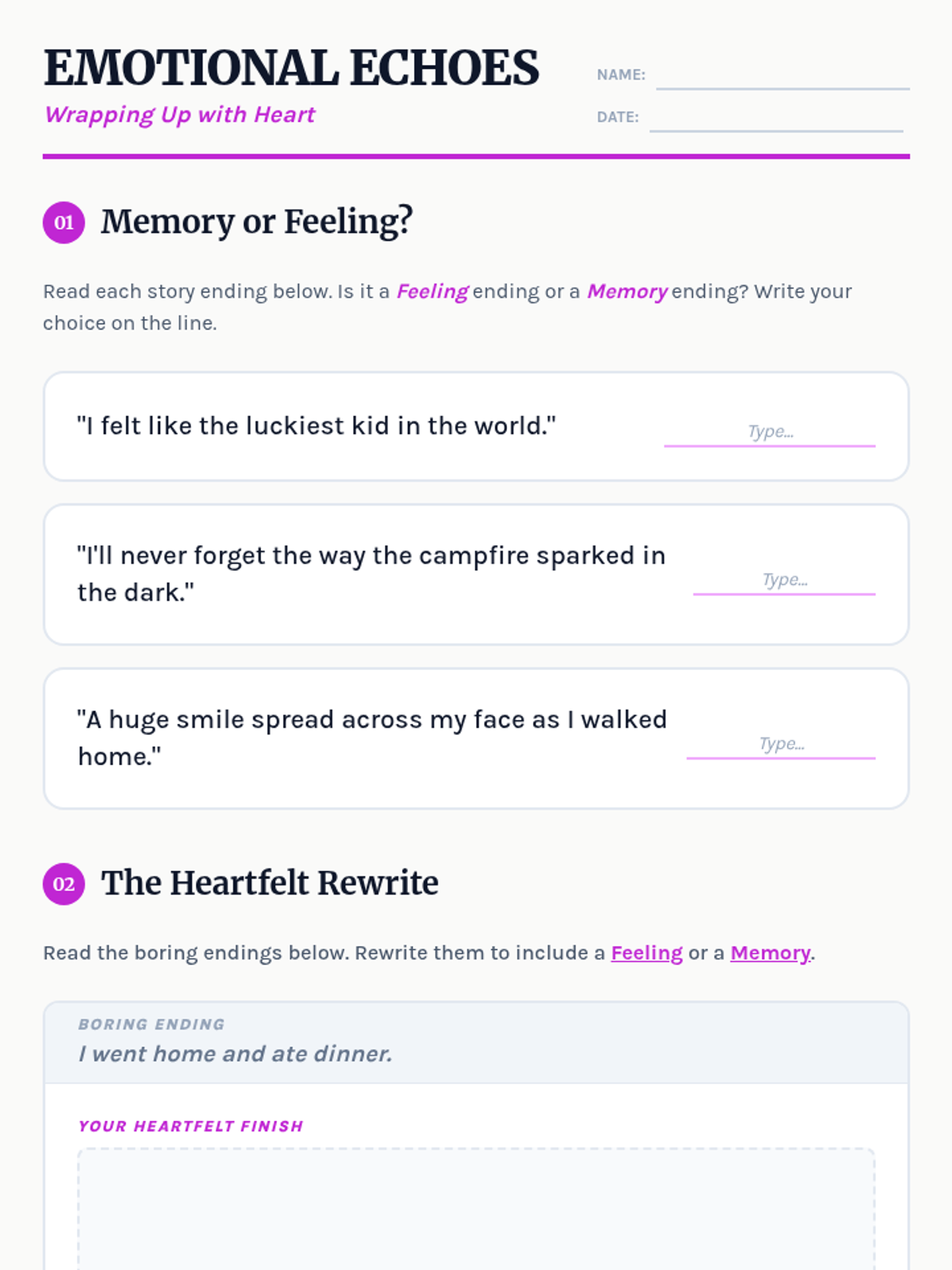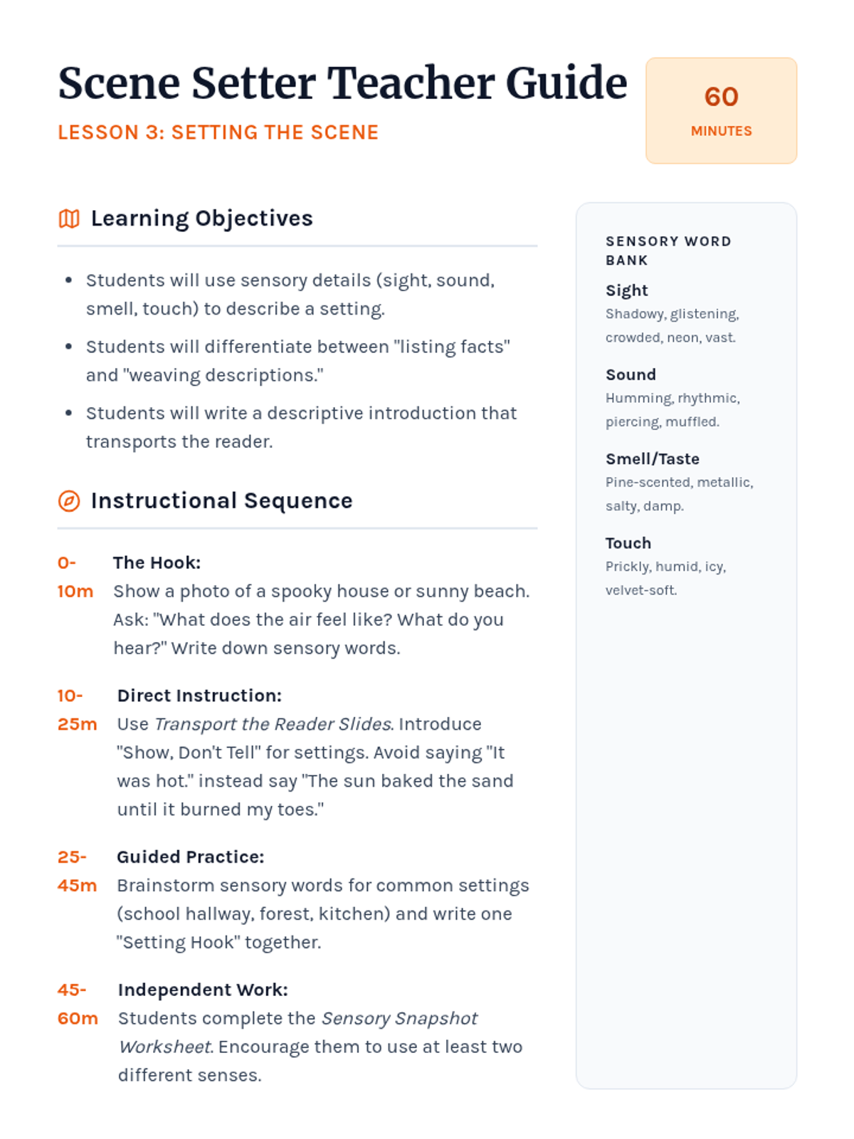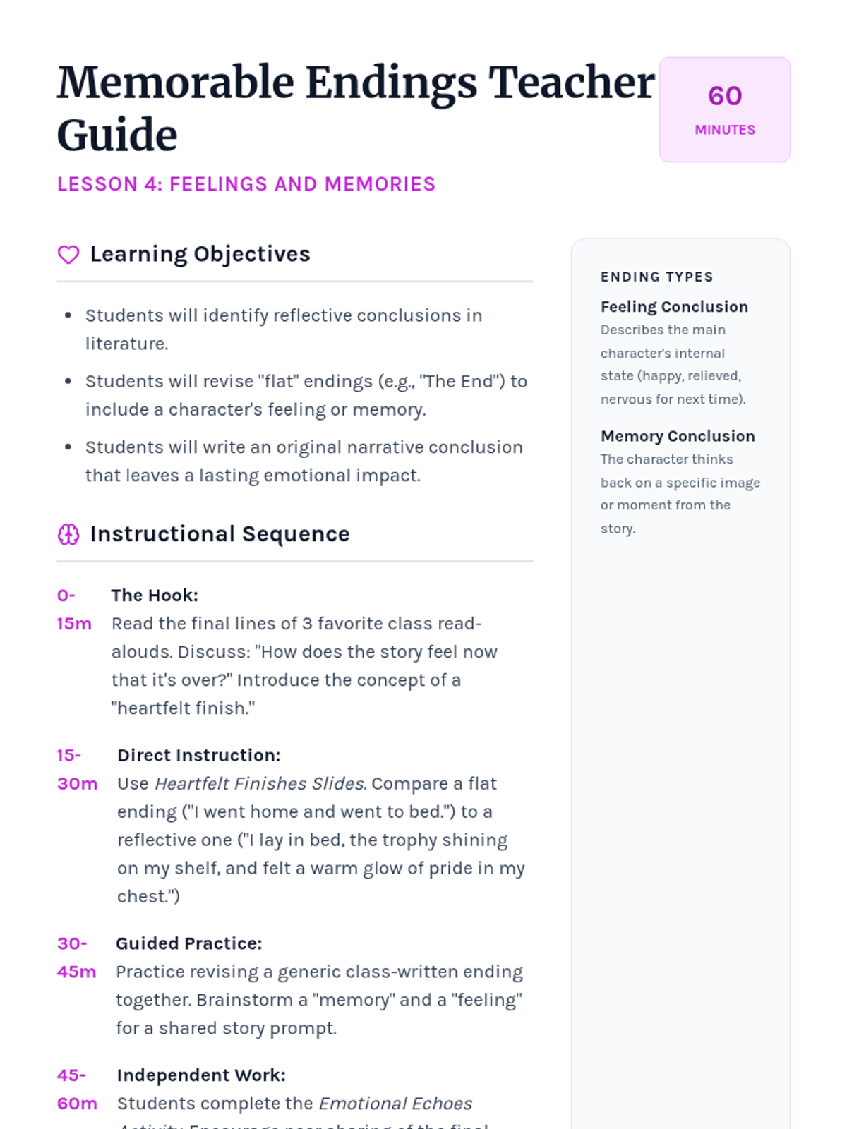 A comprehensive writing sequence for 3rd graders focused on crafting dynamic narrative introductions and reflective conclusions. Students transition from generic writing to using sensory details, dialogue, action, and emotional resonance to engage readers from start to finish.