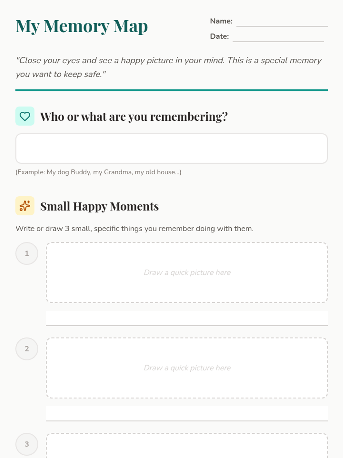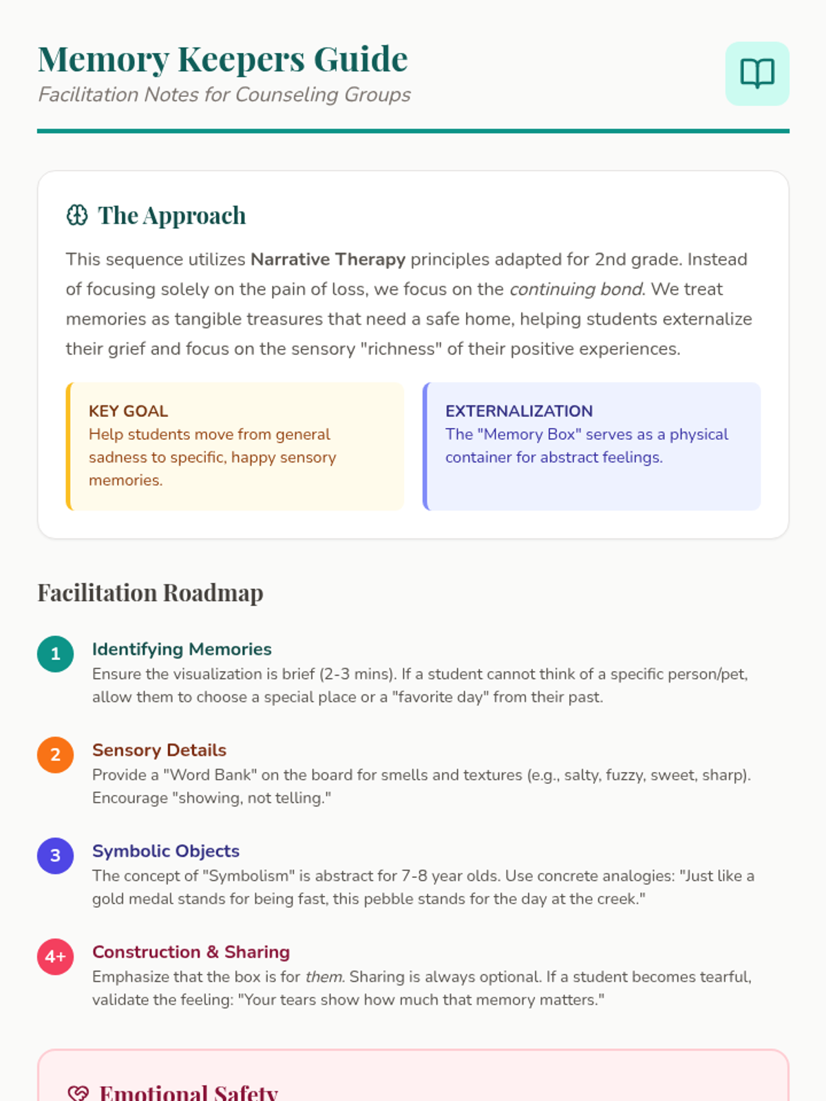 A 2nd-grade counseling sequence using narrative therapy techniques to help students process loss by creating physical 'Memory Boxes'. Students move from identifying memories to sensory writing, symbolic object curation, and sharing their completed projects.