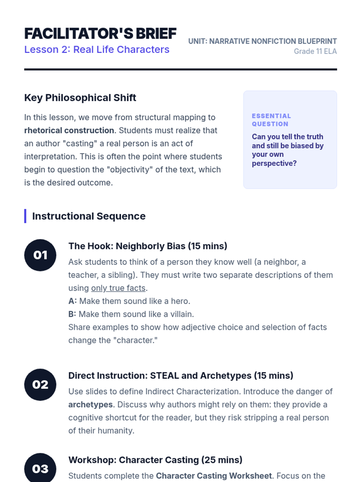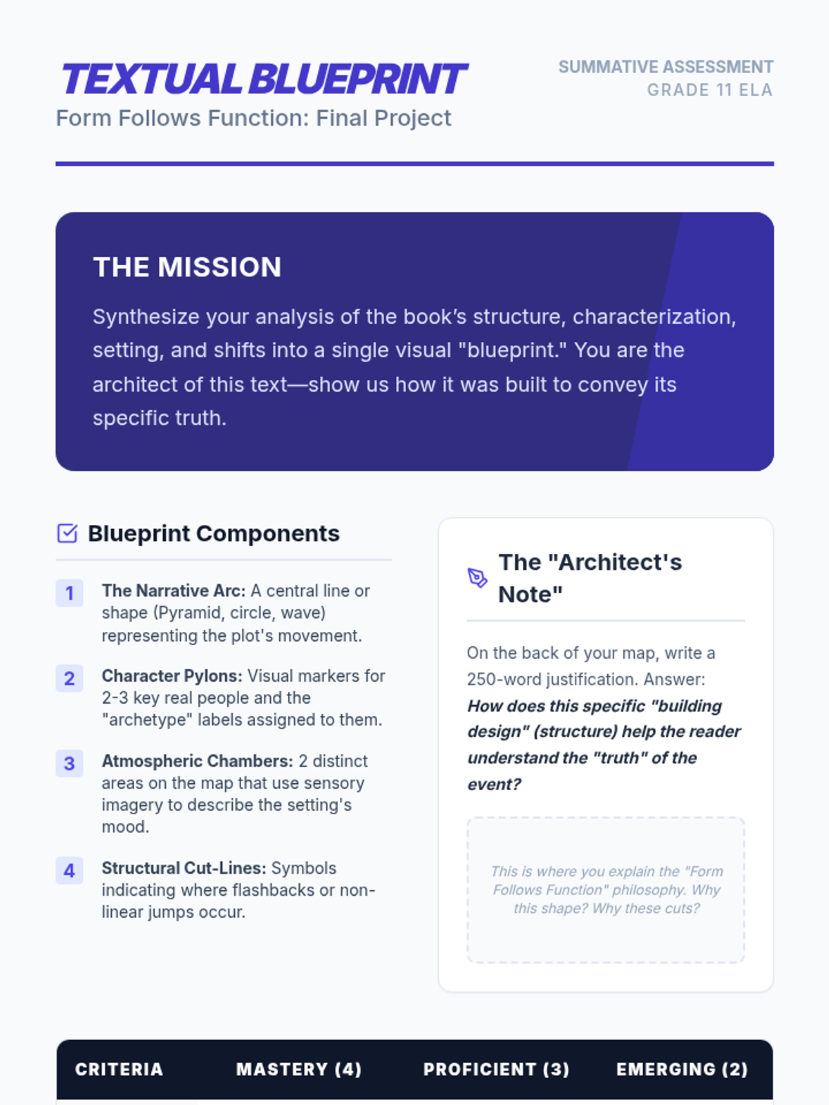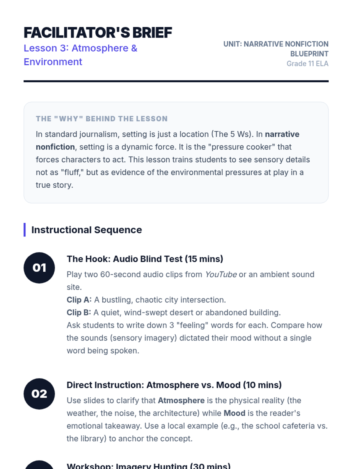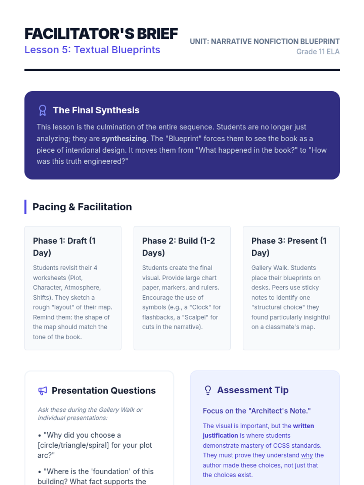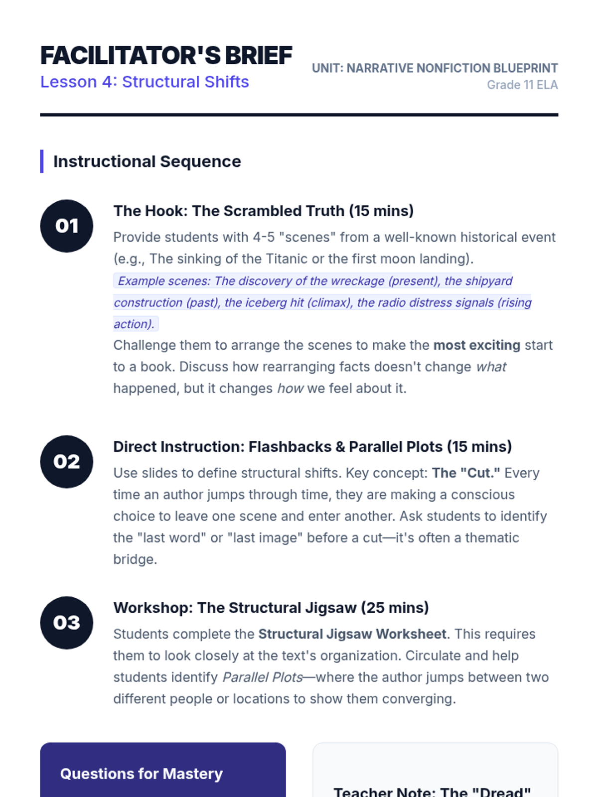This 11th-grade ELA sequence explores the intersection of literary technique and factual reporting in narrative nonfiction. Students will analyze how authors use narrative arcs, characterization, setting, and non-linear structures to convey truth, culminating in a visual mapping project of a selected text's 'architecture.'