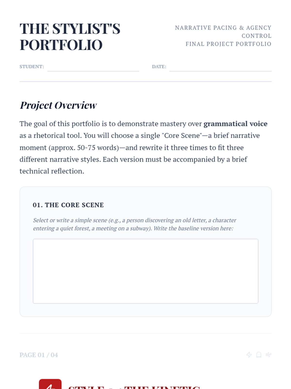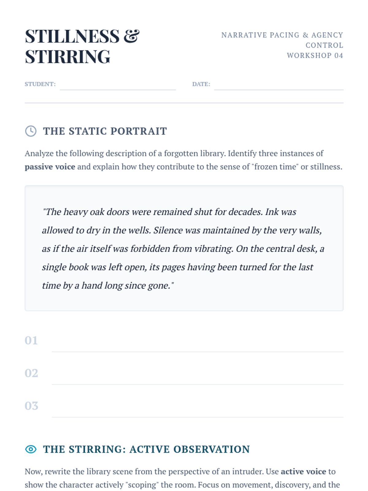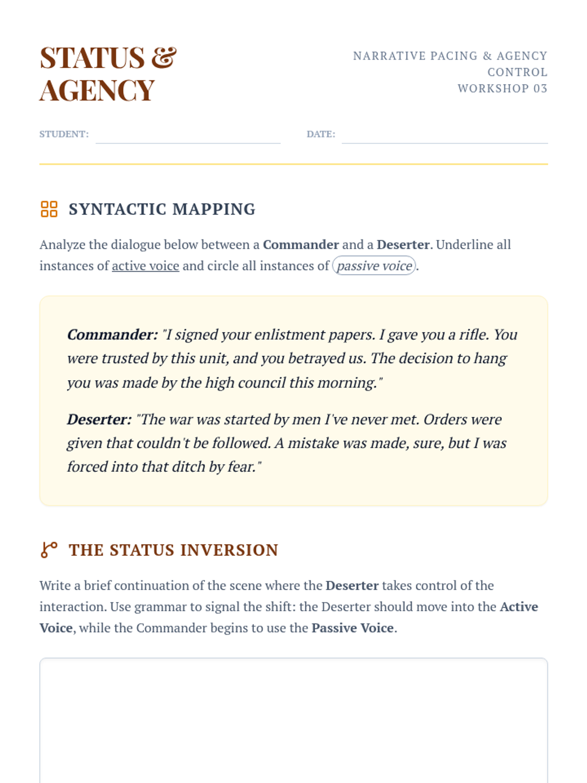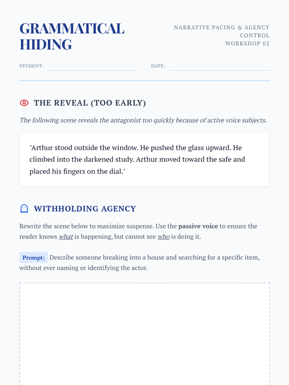 An undergraduate-level exploration of grammatical voice as a rhetorical and narrative tool. Students learn to manipulate active and passive voice to control pacing, agency, suspense, and atmosphere in creative writing.