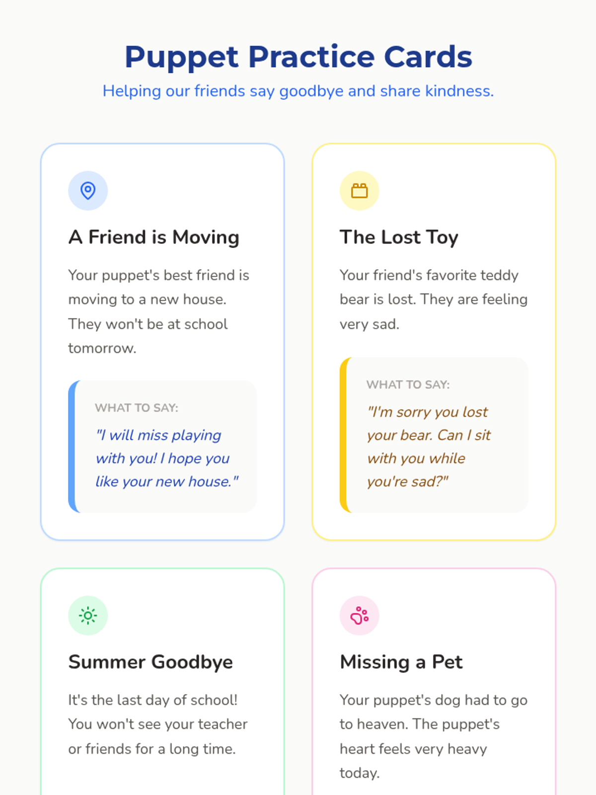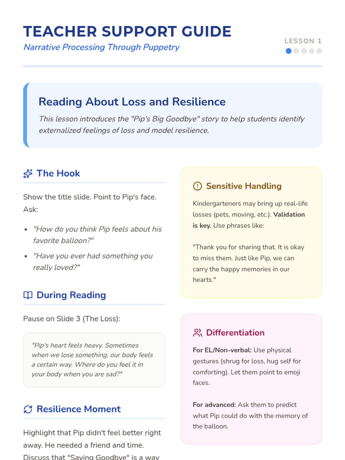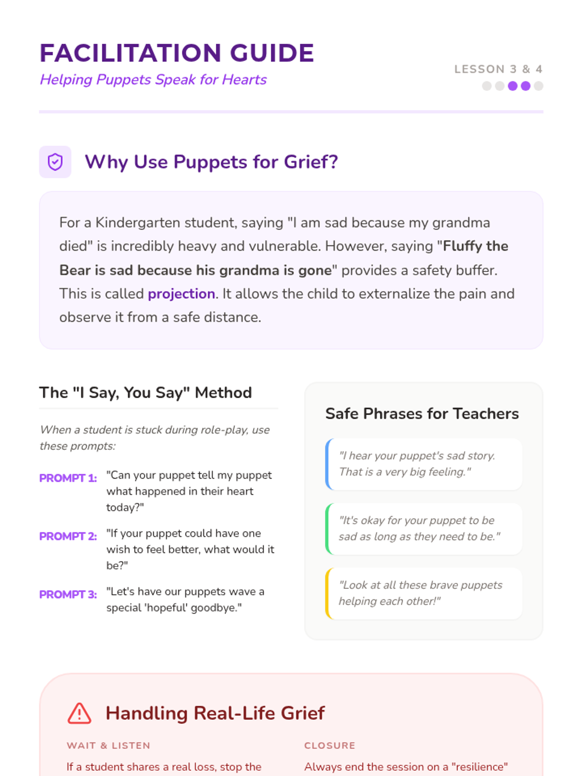 A Kindergarten sequence using narrative therapy and puppetry to help children process loss and express emotions through storytelling and projection.